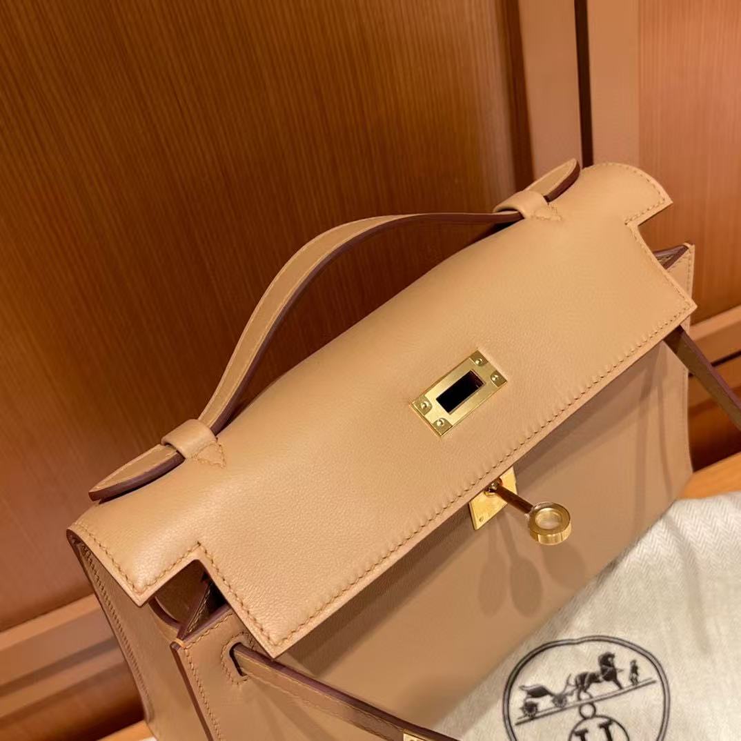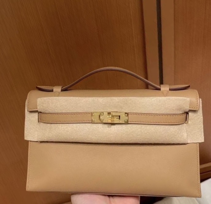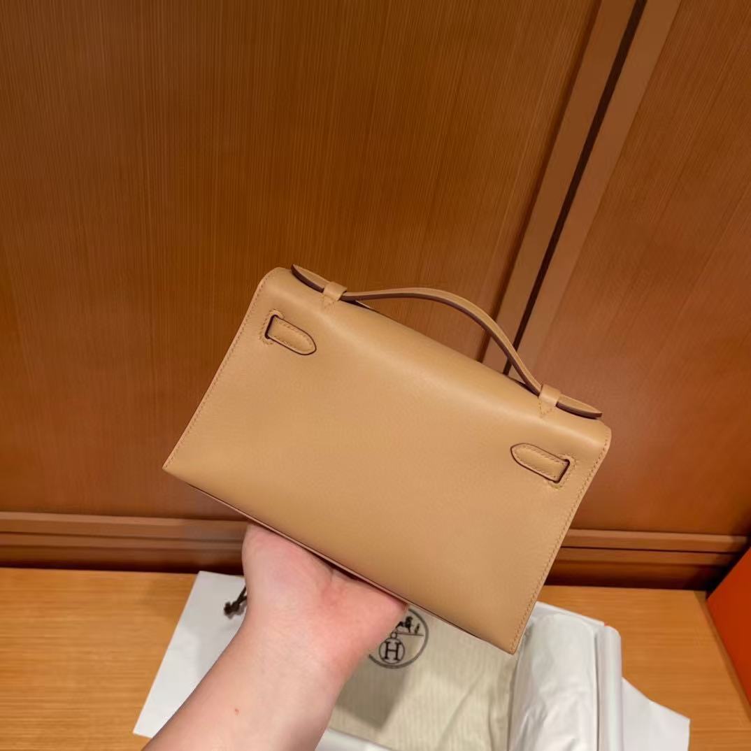 This Authentic Hermès Kelly Pochette is in pristine condition; never before carried with the protective plastic intact on the hardware. Hand crafted by skilled artisans, the Kelly Pochette is highly coveted and favored by celebrities like Victoria Beckham.