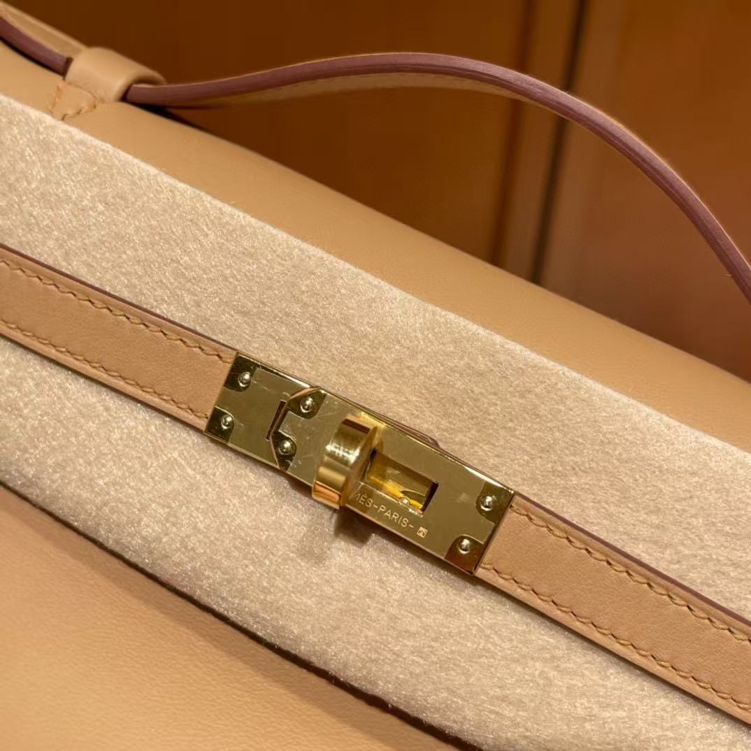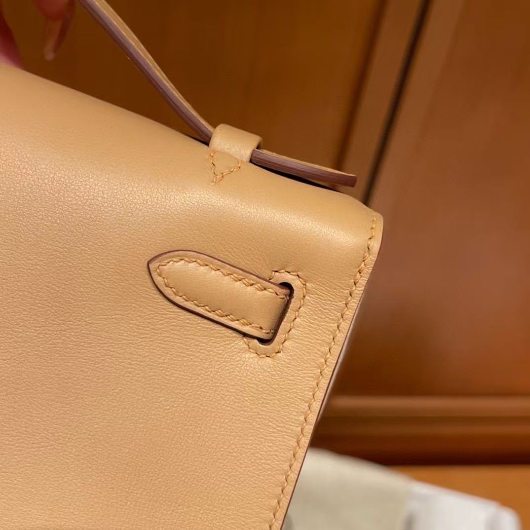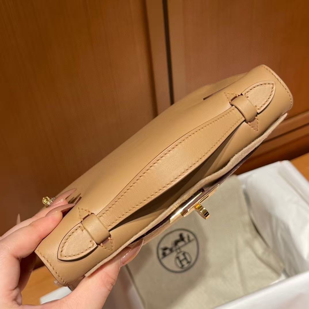 This Authentic Hermès Kelly Pochette is in pristine condition; never before carried with the protective plastic intact on the hardware. Hand crafted by skilled artisans, the Kelly Pochette is highly coveted and favored by celebrities like Victoria Beckham.