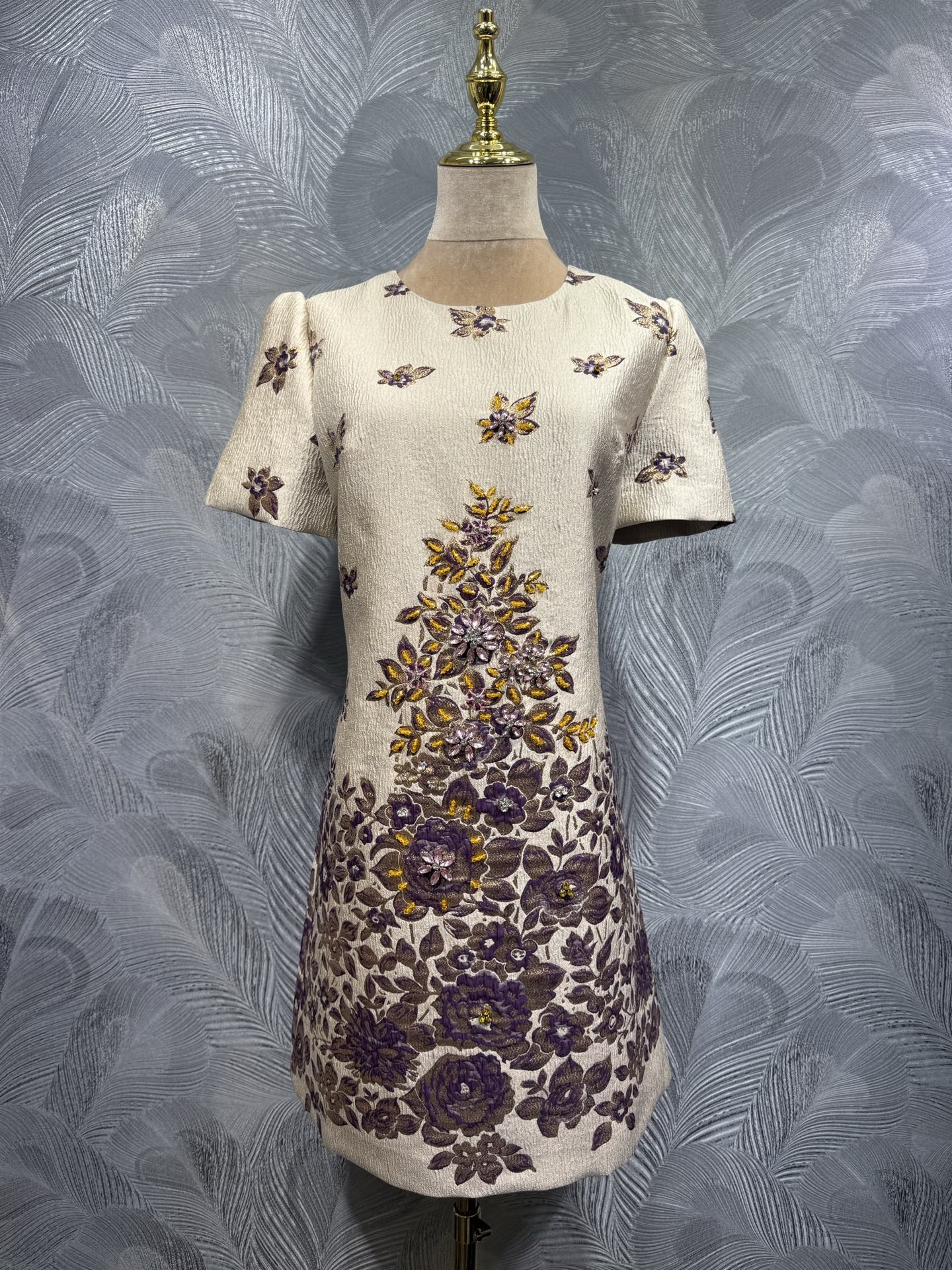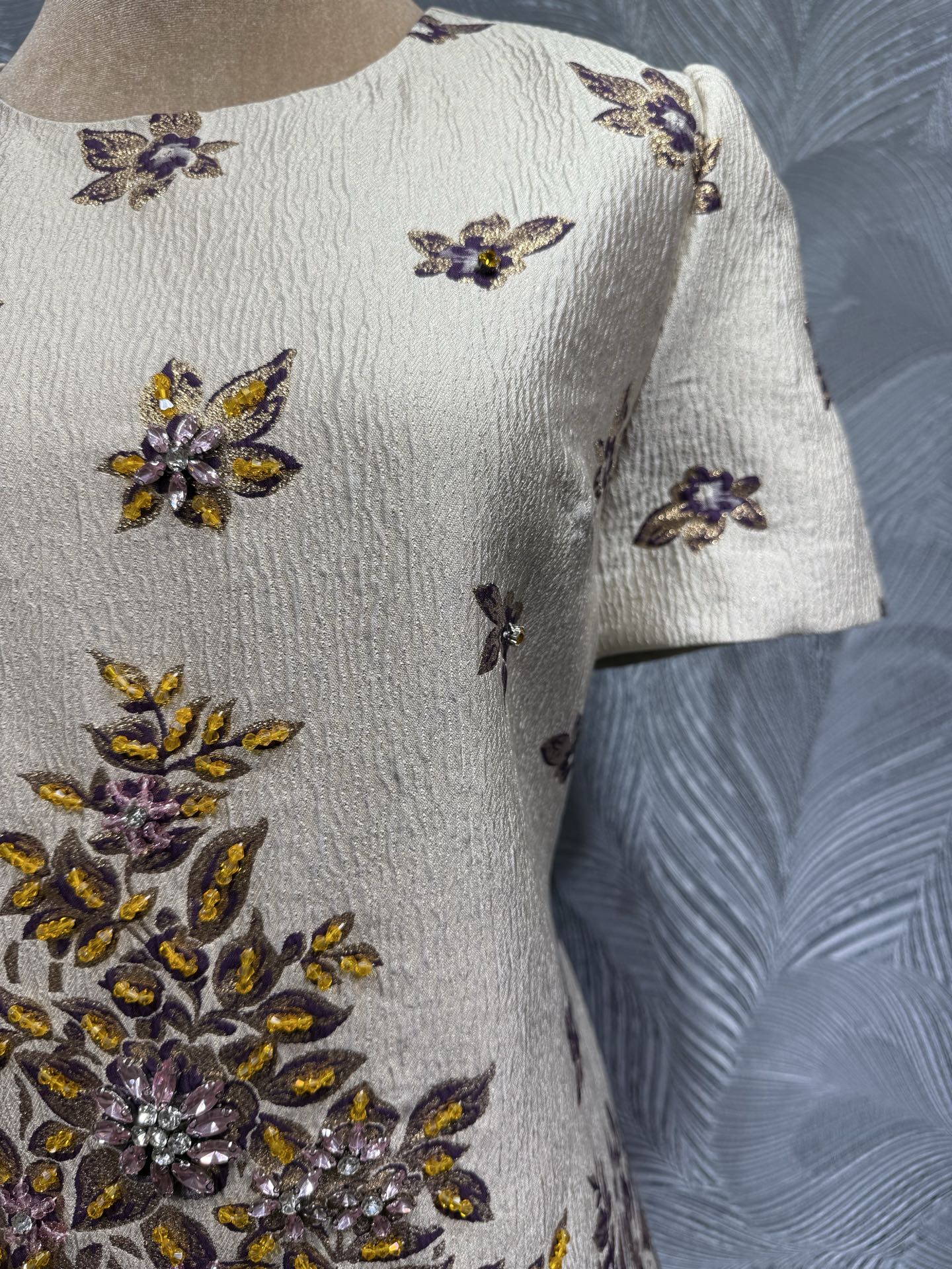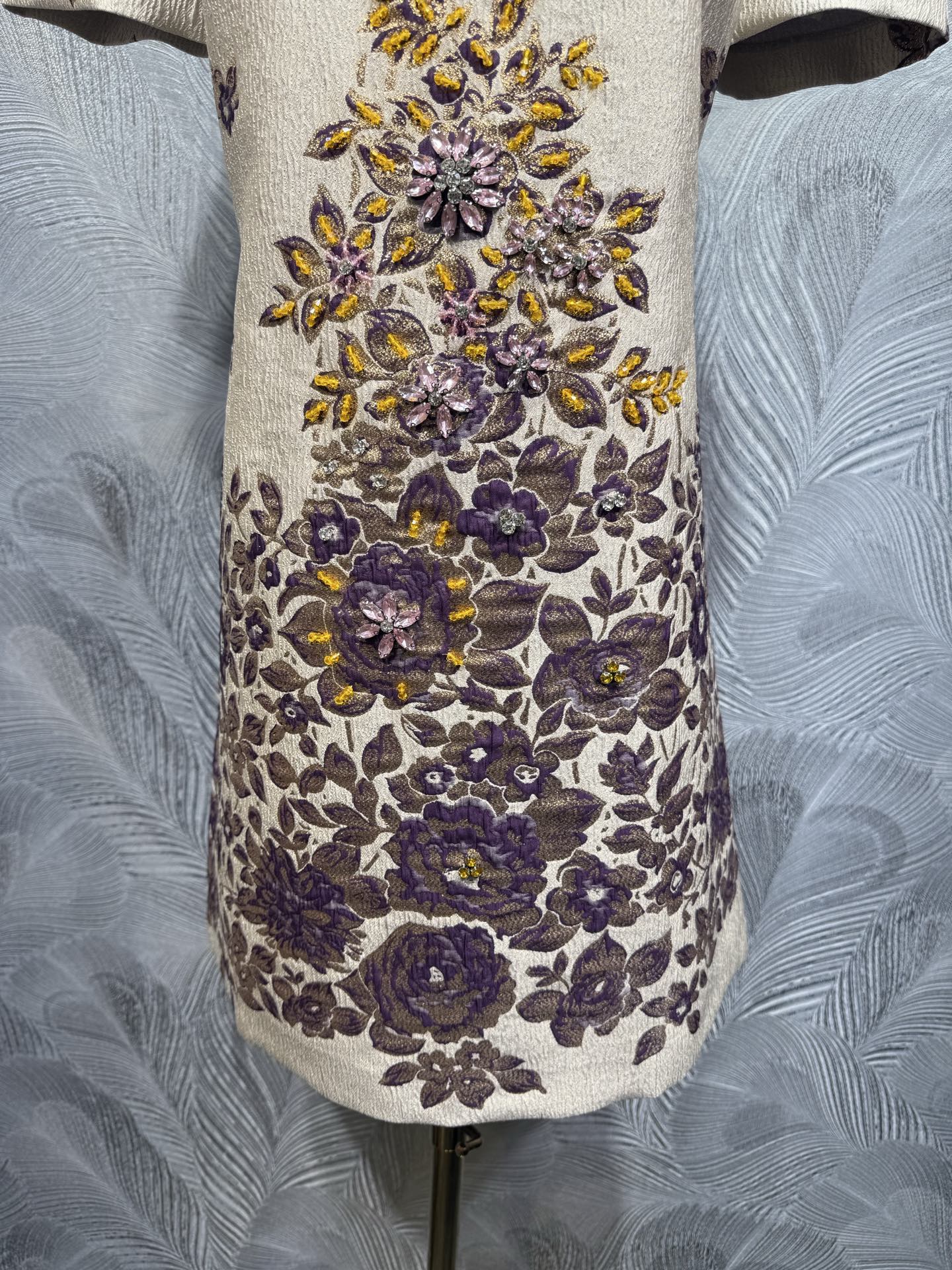 This is a 2026 summer new Valentino round neck jacquard dress, featuring hand-applied beaded accents. The dress has a cream base with intricate purple and yellow floral patterns, decorated with delicate beadwork that adds texture and shine.