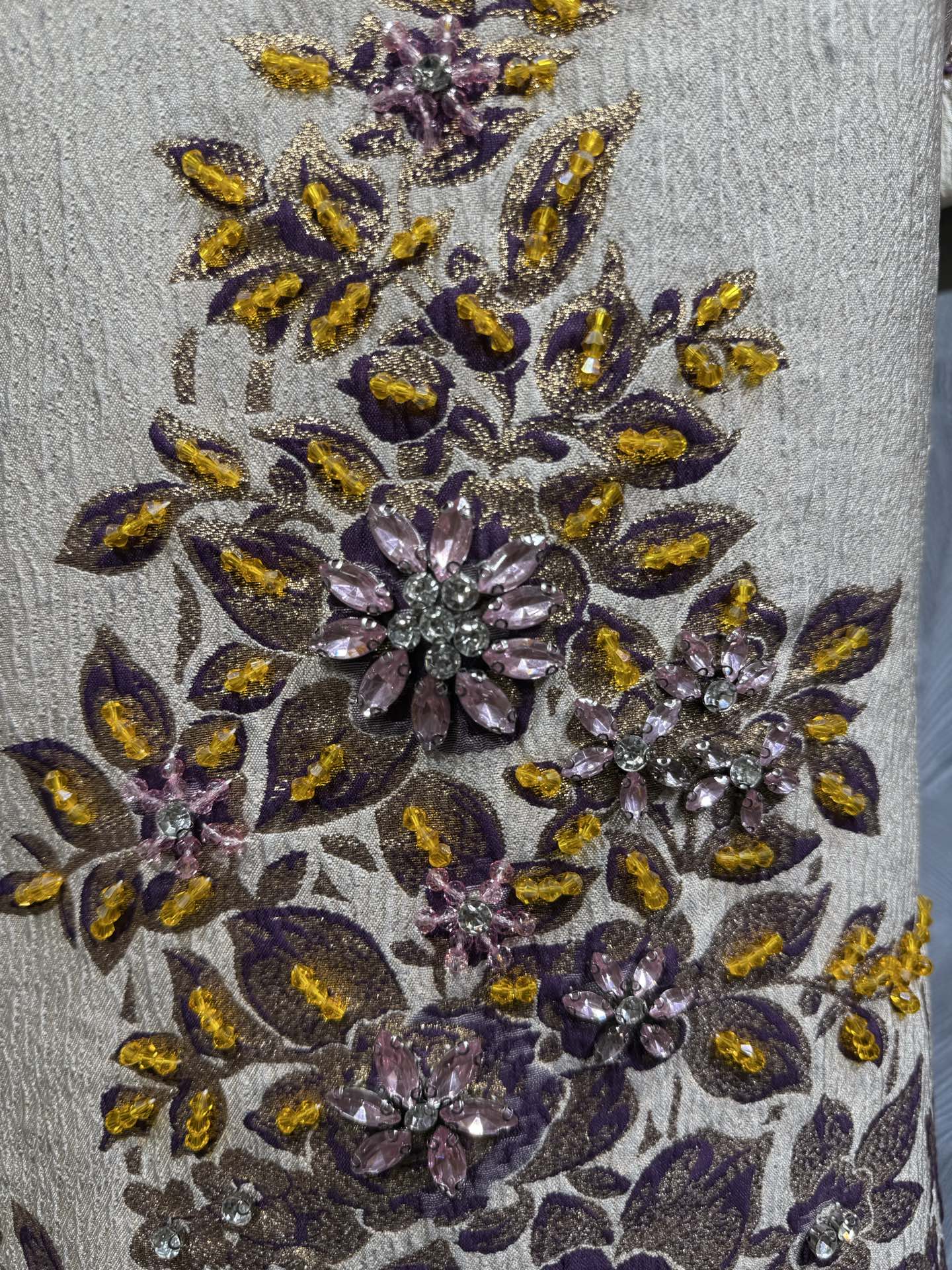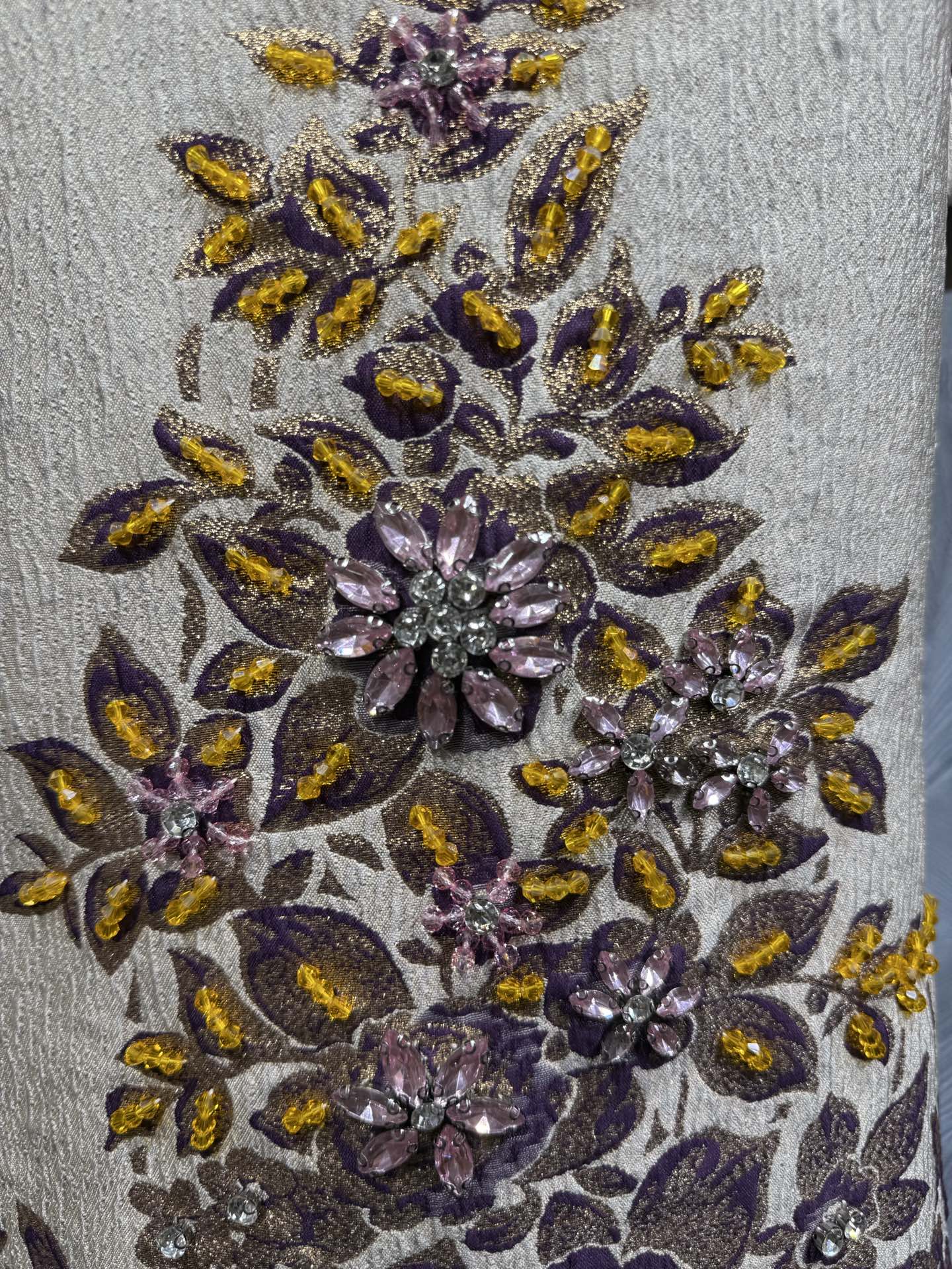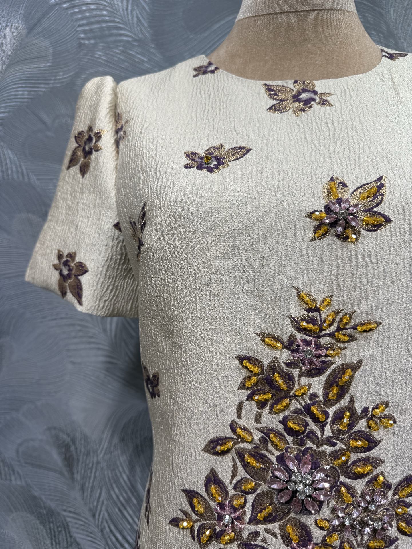 This is a 2026 summer new Valentino round neck jacquard dress, featuring hand-applied beaded accents. The dress has a cream base with intricate purple and yellow floral patterns, decorated with delicate beadwork that adds texture and shine.