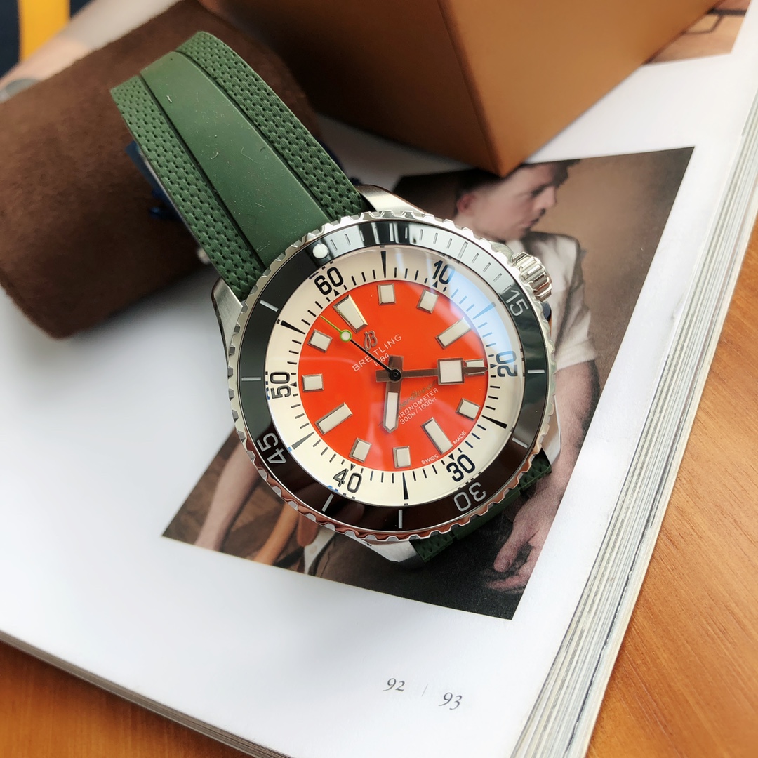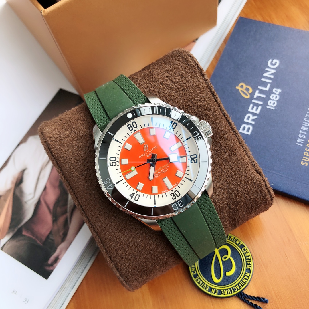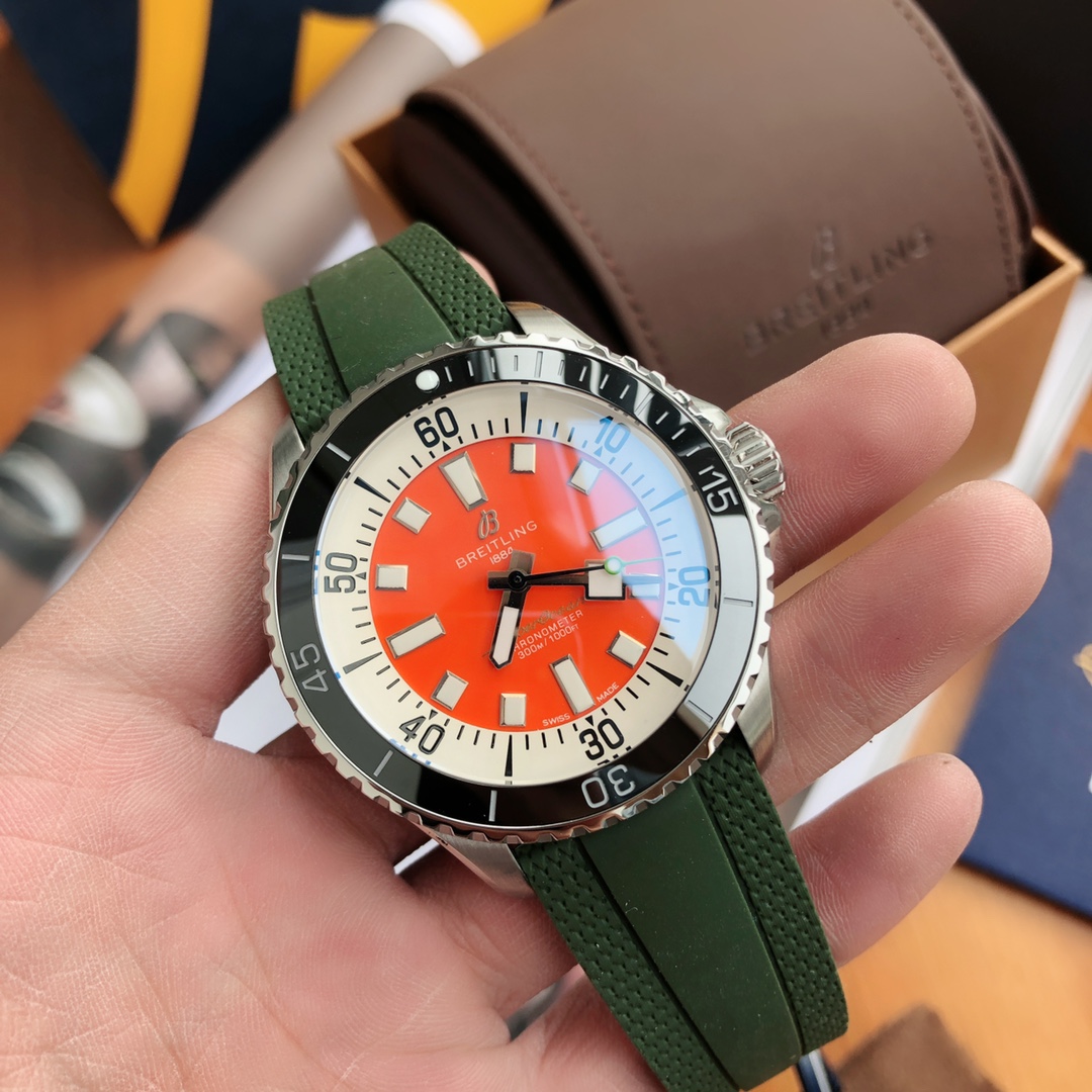Breitling Superocean 44mm Automatic Diver Watch – Orange Dial, Green Rubber Strap