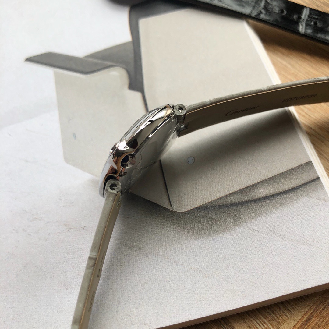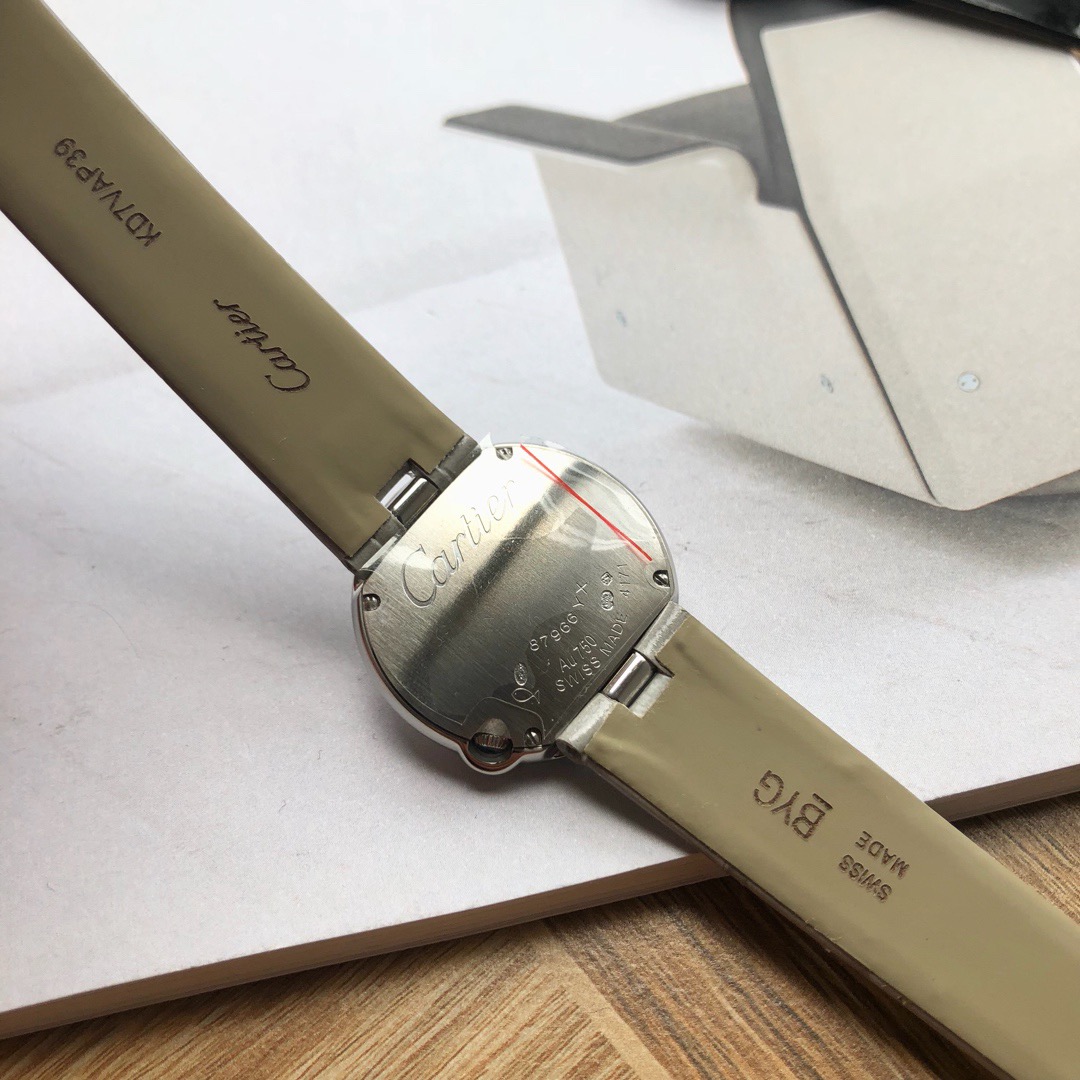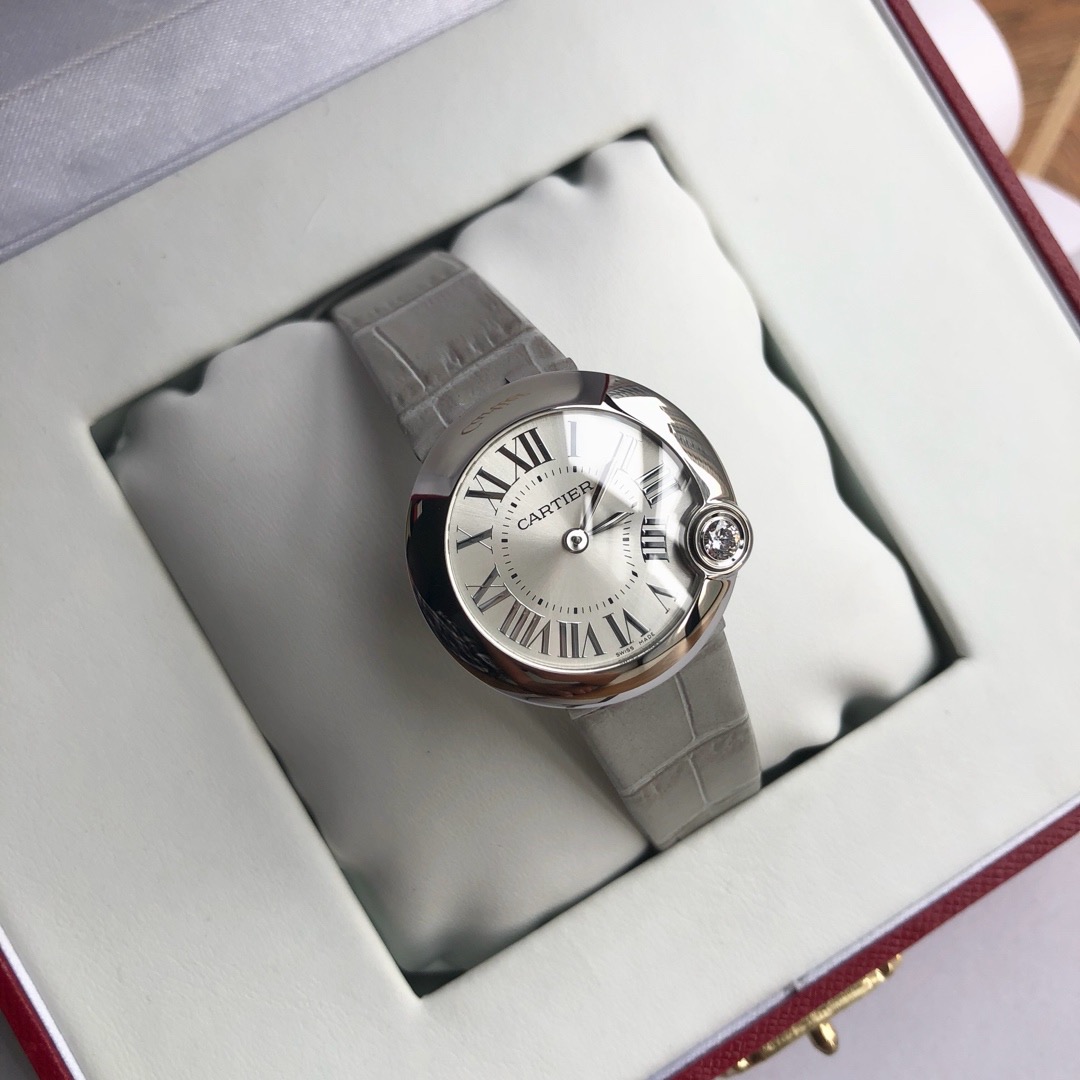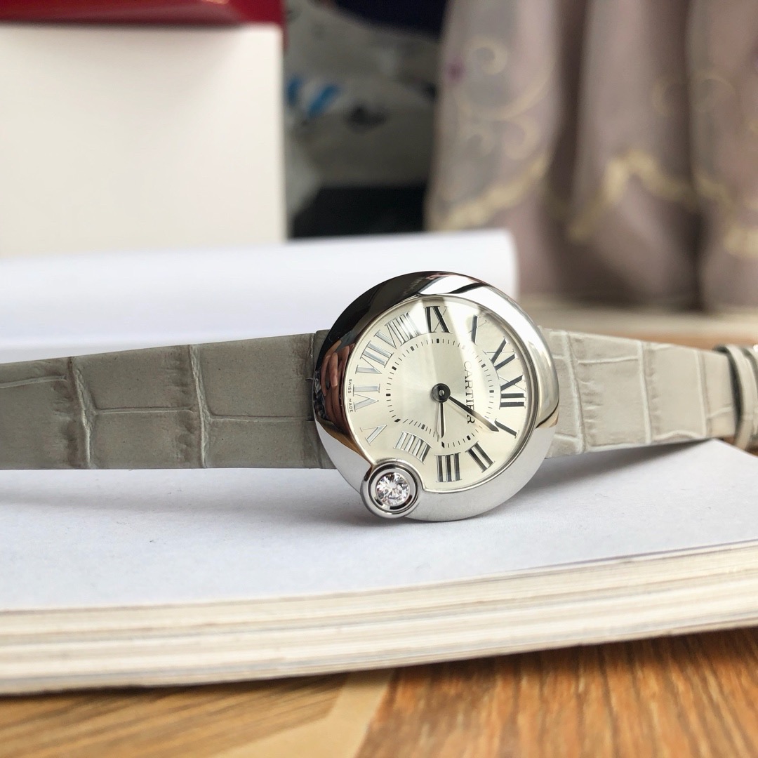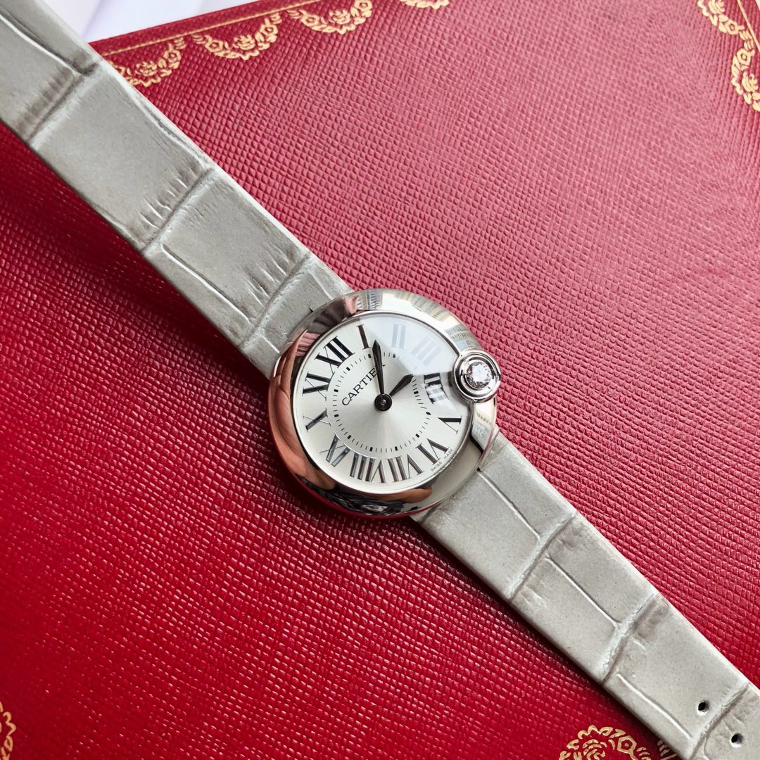 For sale is a Cartier Ballon Bleu 33mm watch. This classic model features a round stainless steel case and a silver dial with Roman numerals. The watch comes with a light grey crocodile strap and a stainless steel buckle. The crown is set with Cartier's signature blue cabochon.