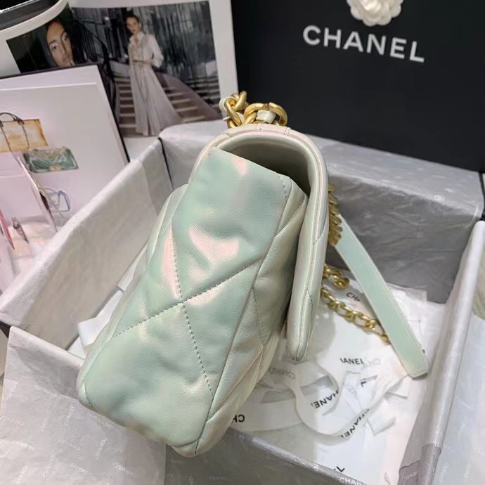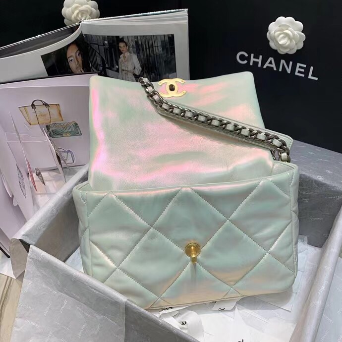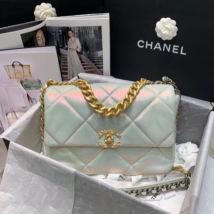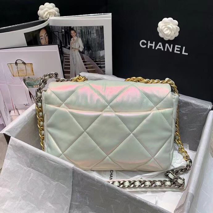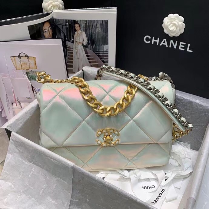 Chanel Add to Cart CHANEL 19 Iridescent White Flap Bag MSRP: Was: Now: $144,455.51 Iridescent Calfskin, Gold-Tone, Silver-Tone & Ruthenium-Finish Metal