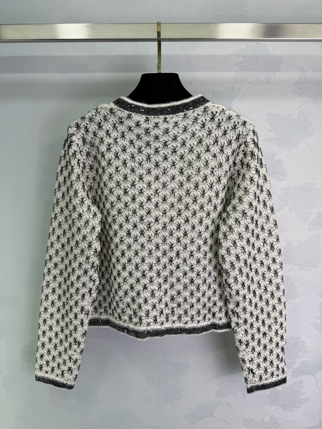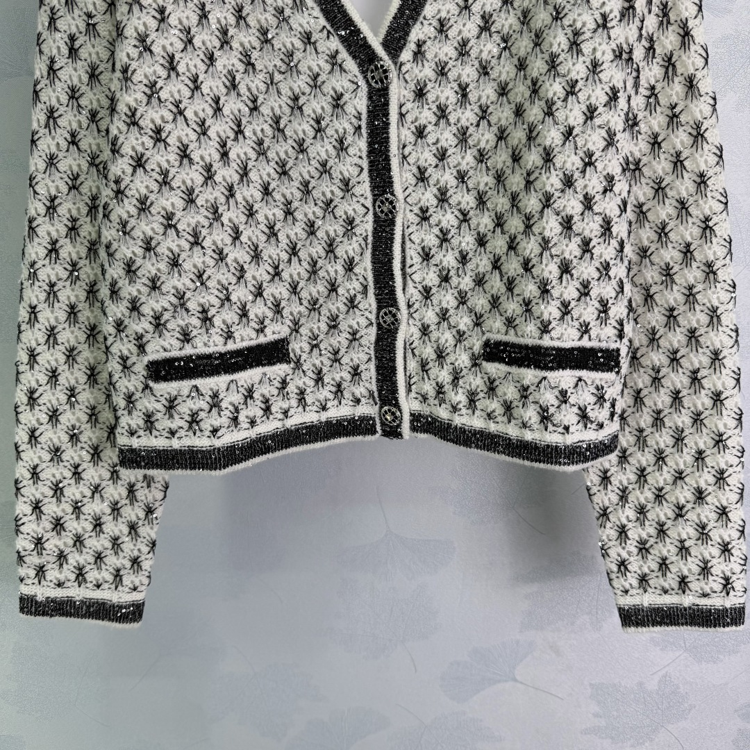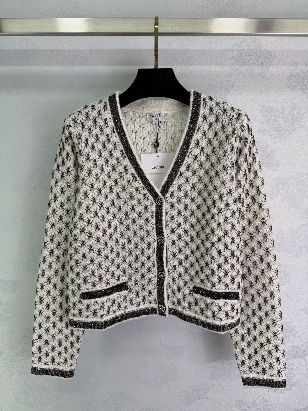 This is a Chanel 26 spring/summer knit cardigan, brand new with original tags. It features a black and white geometric jacquard design and a classic V-neck cut with long sleeves. The cardigan is finished with Chanel signature double C logo buttons. The material is a soft, warm wool blend, comfortable for both casual and daily commute wear.