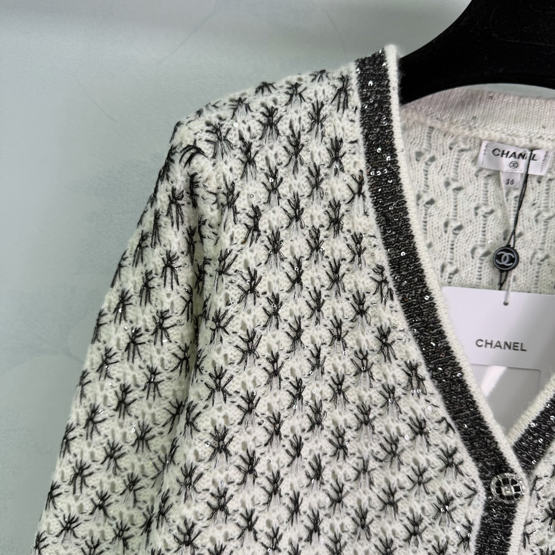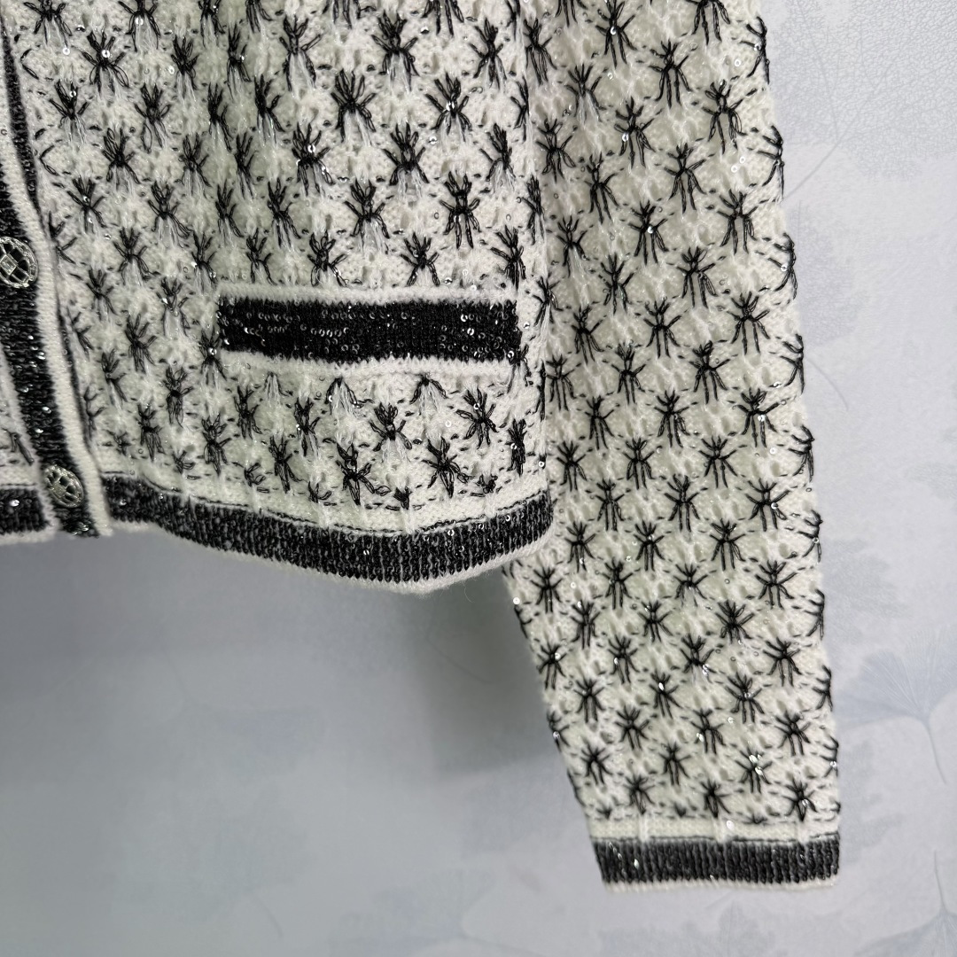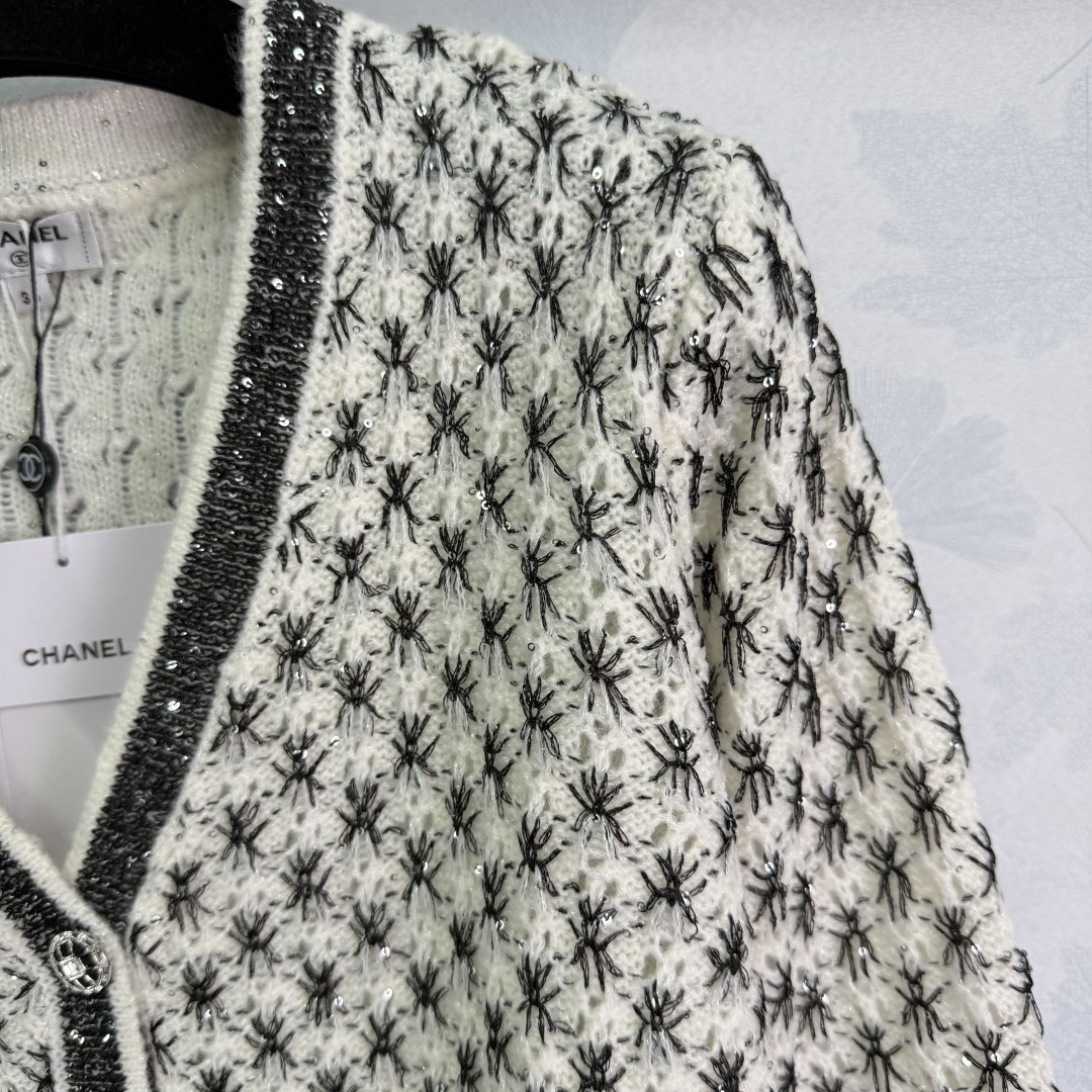 This is a Chanel 26 spring/summer knit cardigan, brand new with original tags. It features a black and white geometric jacquard design and a classic V-neck cut with long sleeves. The cardigan is finished with Chanel signature double C logo buttons. The material is a soft, warm wool blend, comfortable for both casual and daily commute wear.