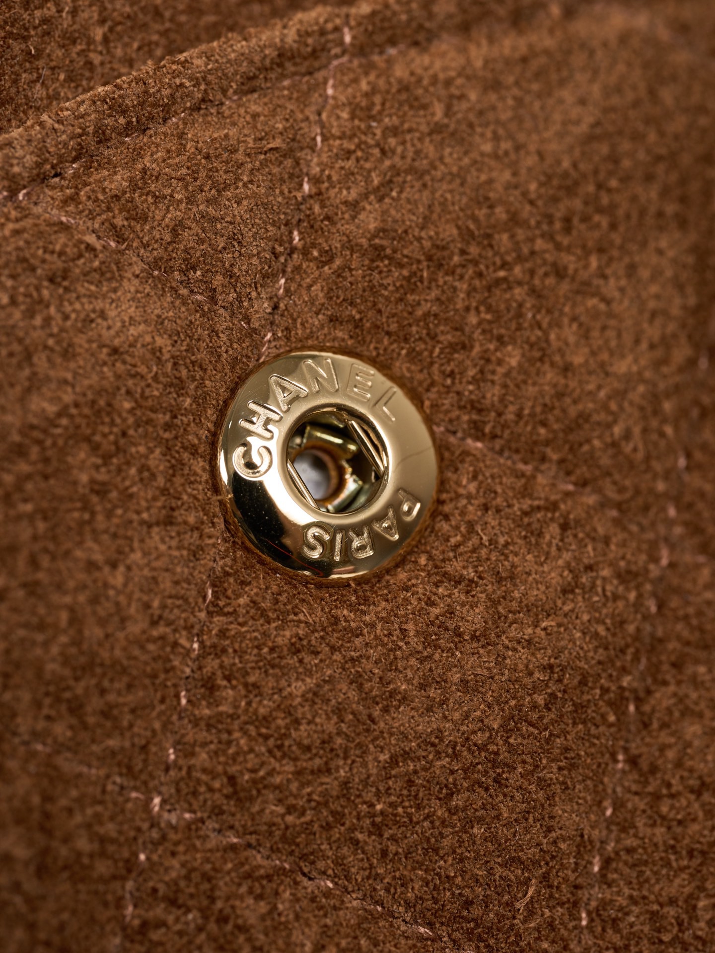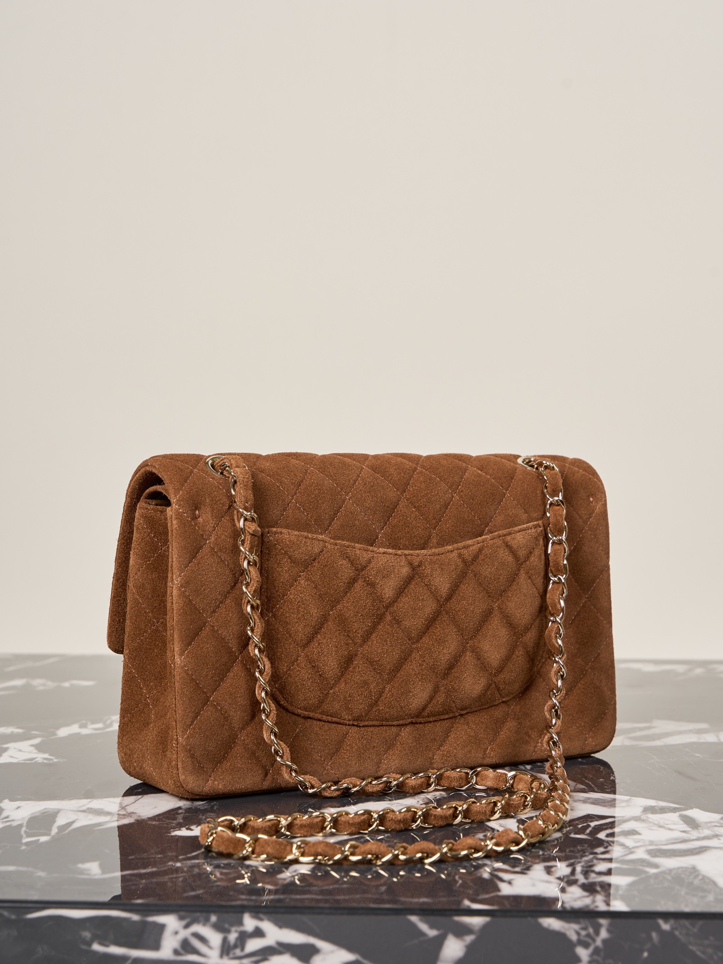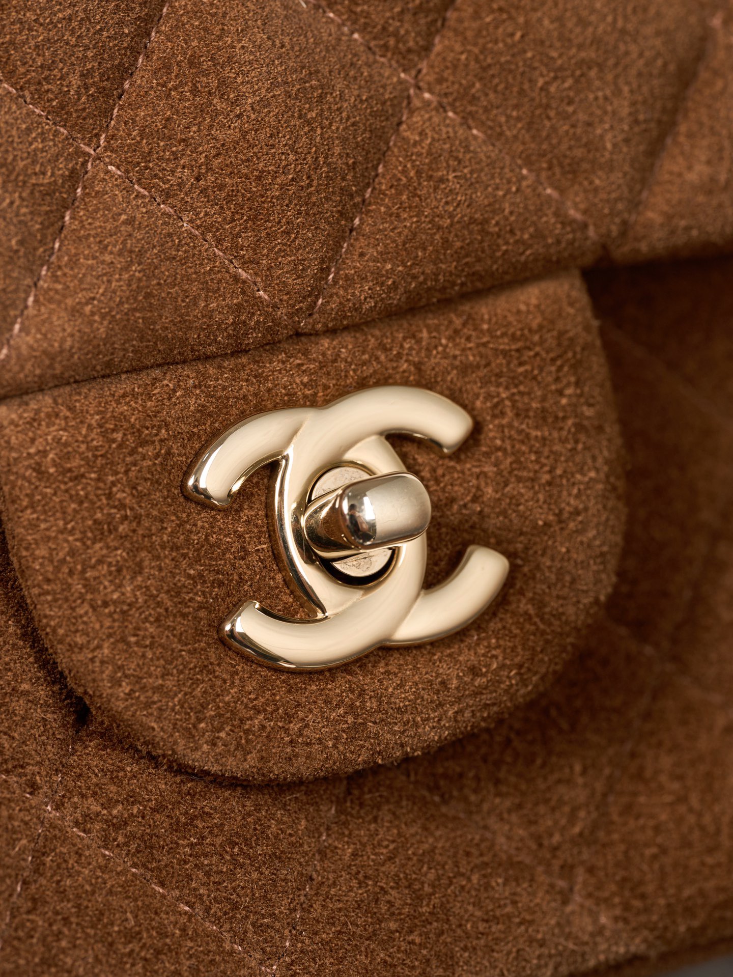 The bag offers a back pocket and a flap front design. The gold tone hardware, including the CC turn lock and chain, stands out against the warm brown suede. Great for anyone looking for a timeless, neutral Chanel piece that works both day and night.