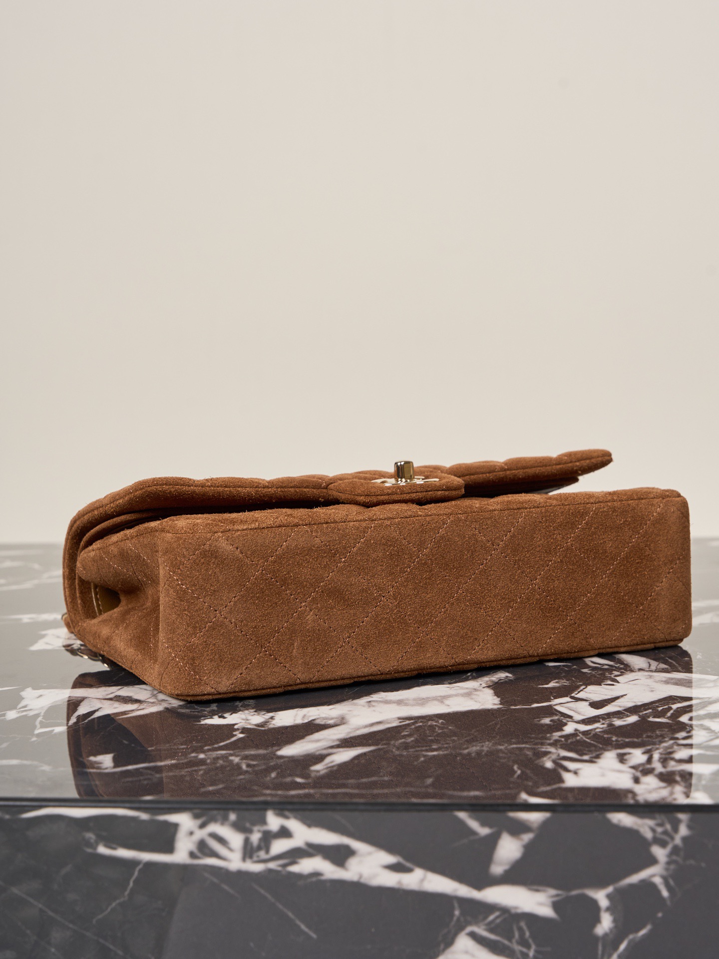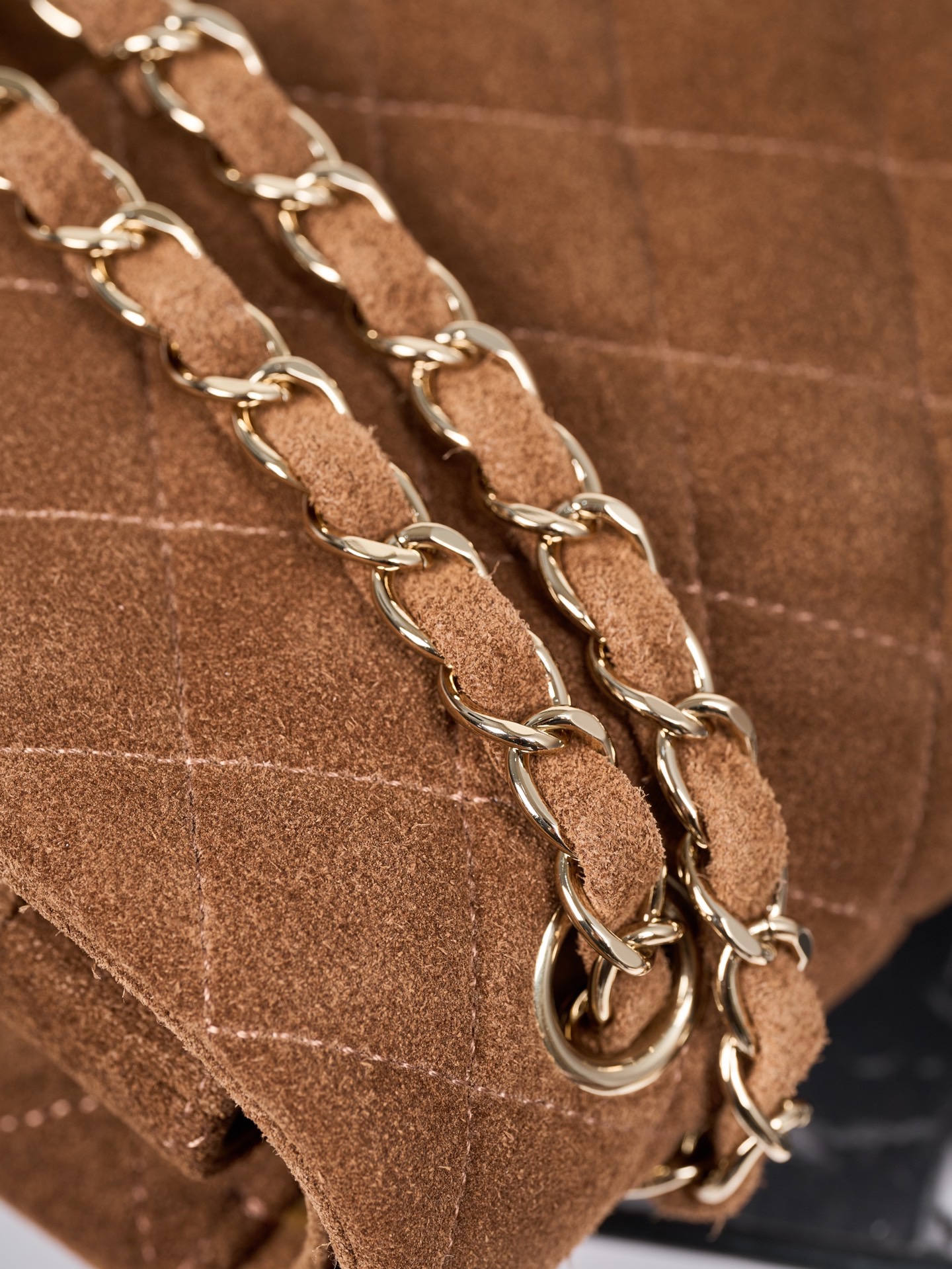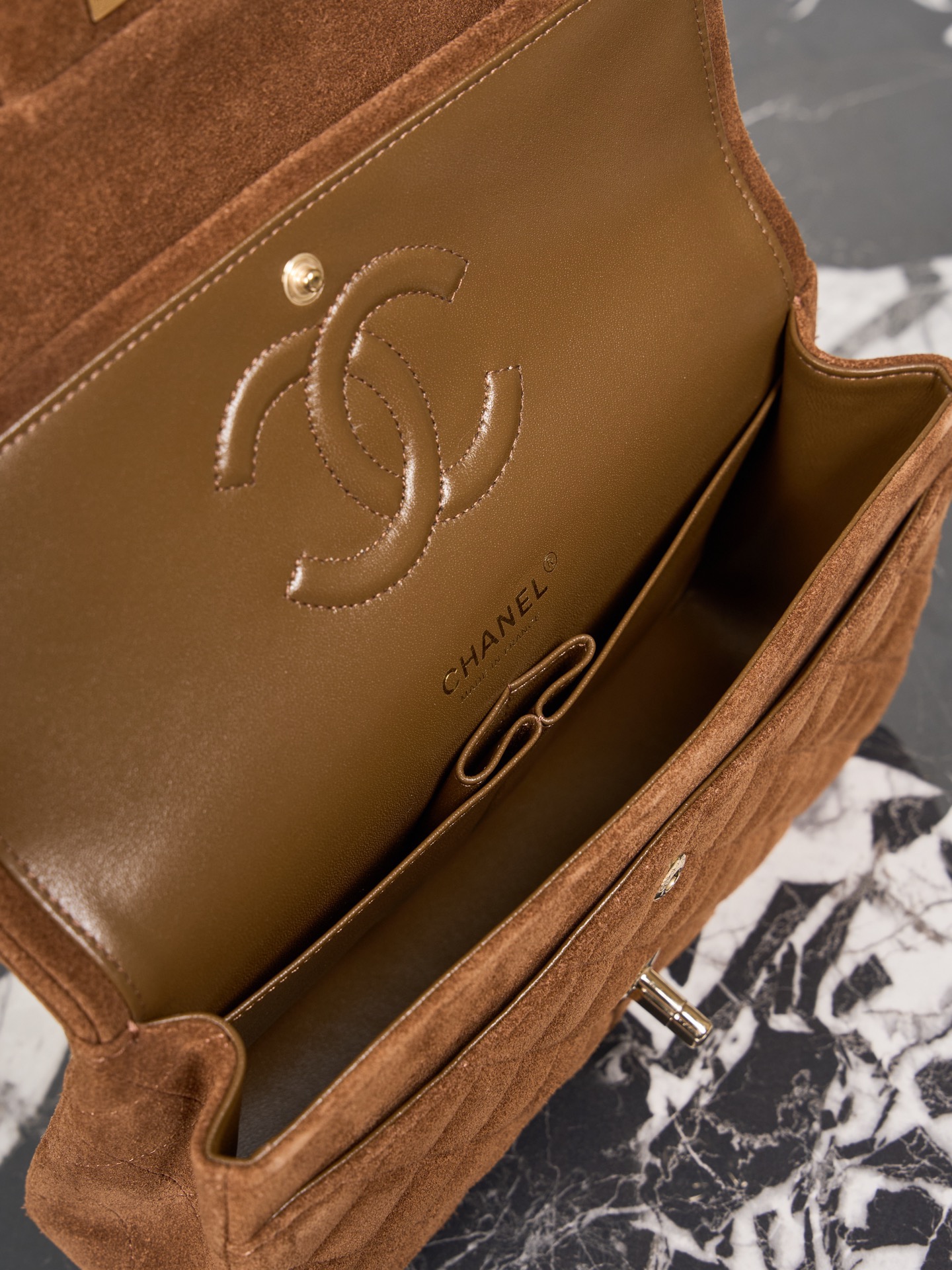 The bag offers a back pocket and a flap front design. The gold tone hardware, including the CC turn lock and chain, stands out against the warm brown suede. Great for anyone looking for a timeless, neutral Chanel piece that works both day and night.