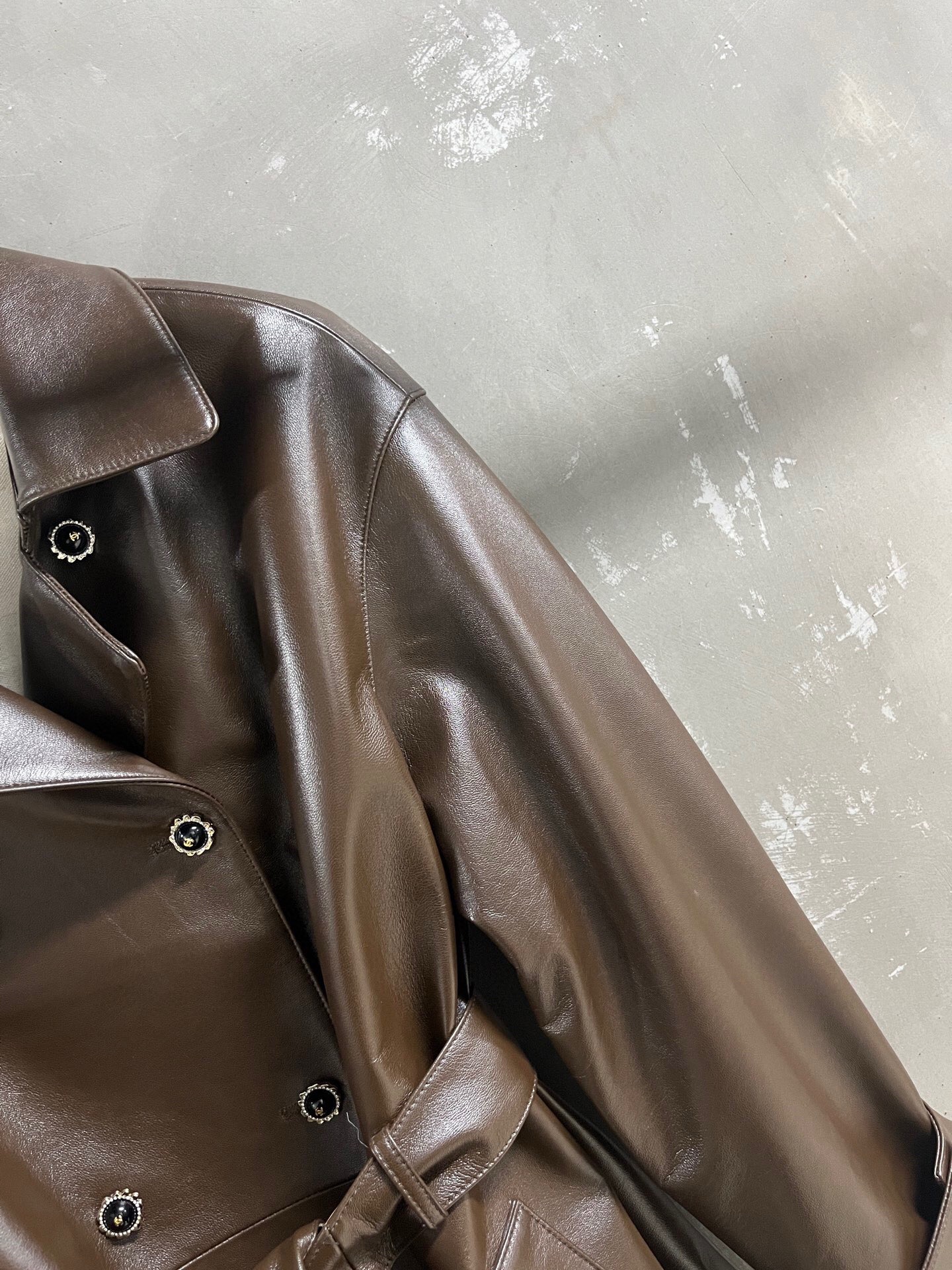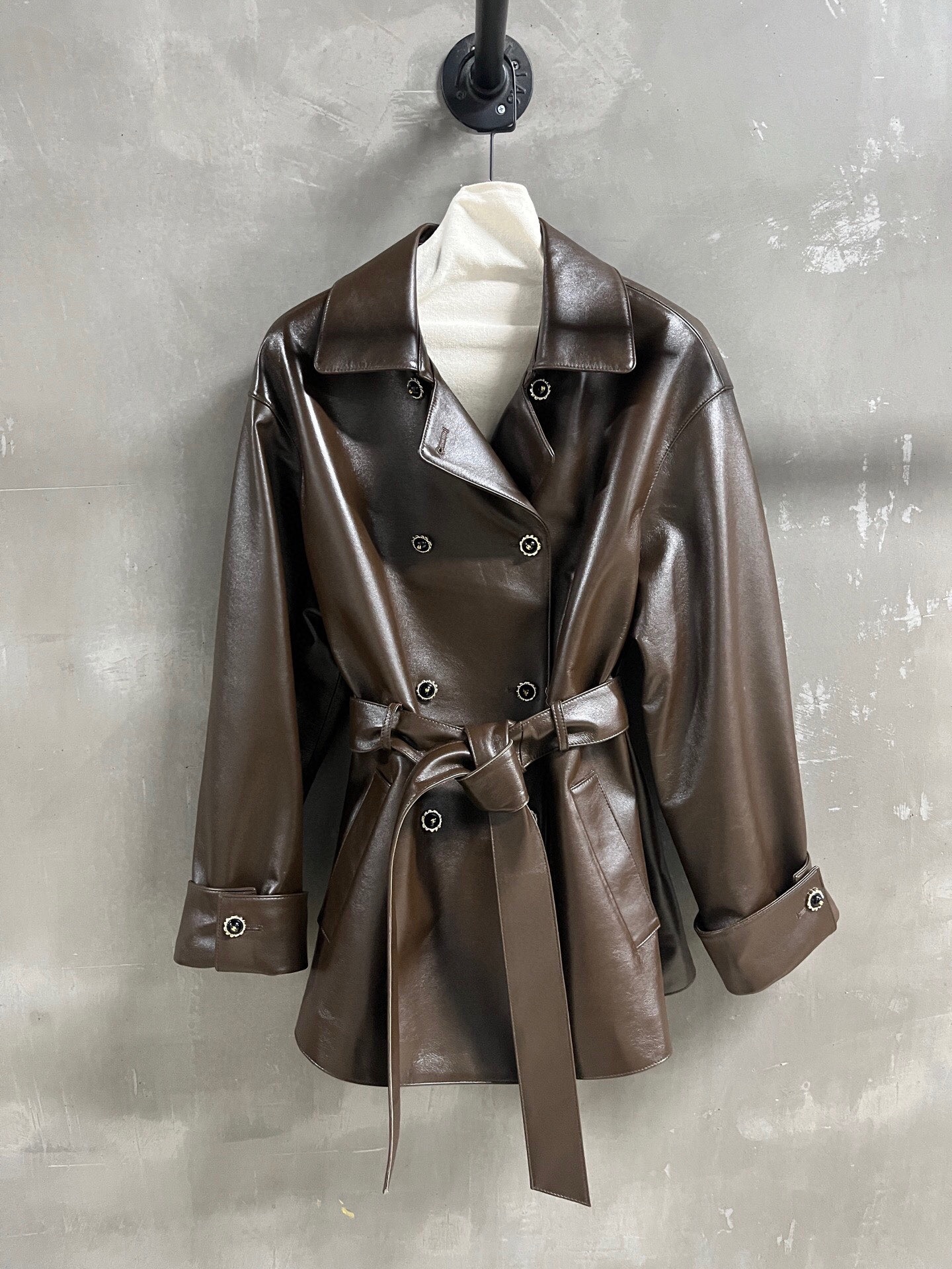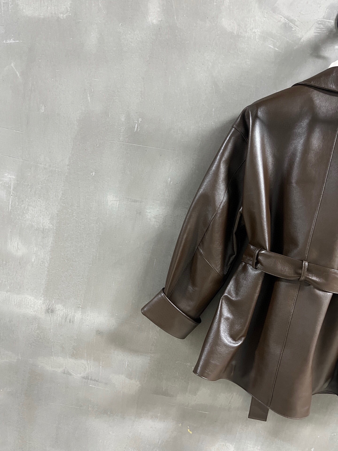 The leather is soft and has a smooth, shiny finish. The jacket’s overall look is structured but not stiff, making it suitable for various occasions. The relaxed fit and mid-thigh length offer versatile styling options. Please see photos for detailed views of the jacket and lining.
