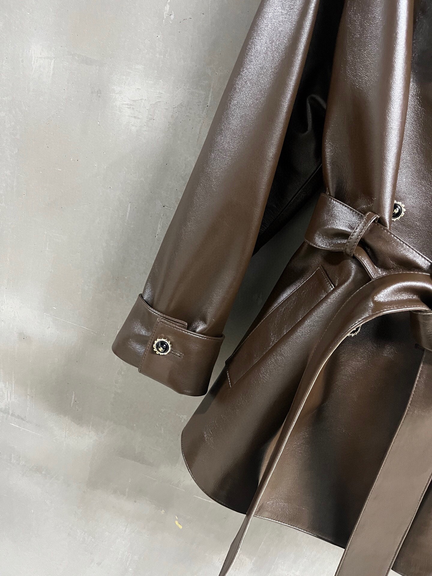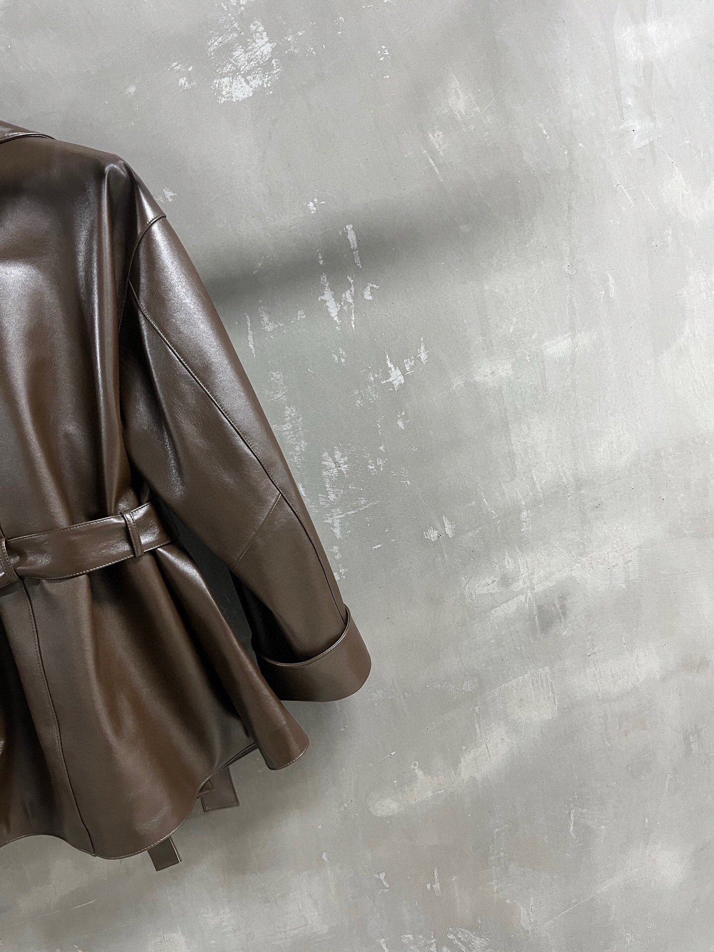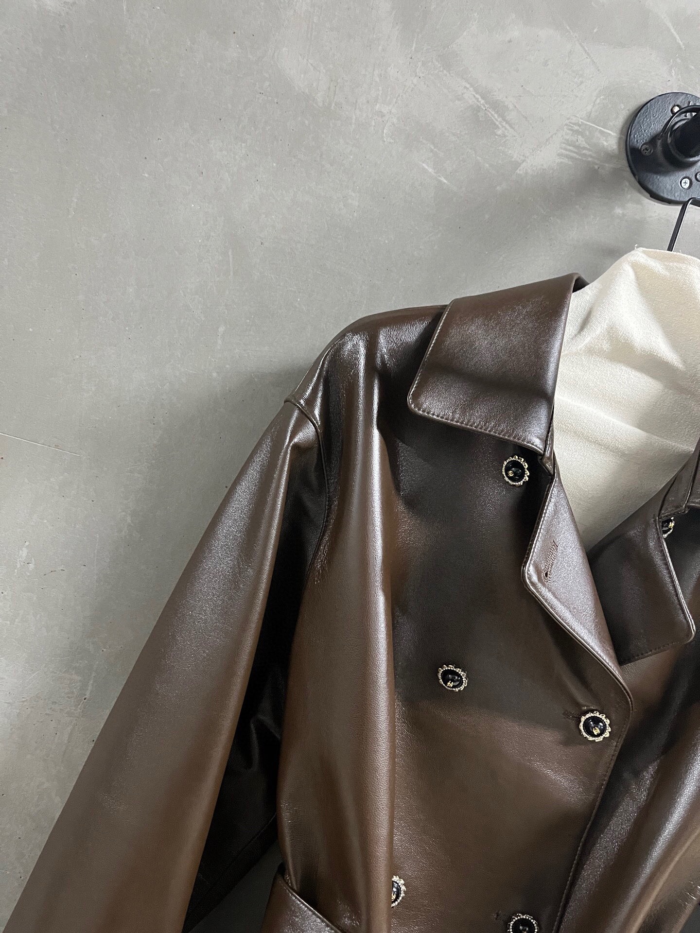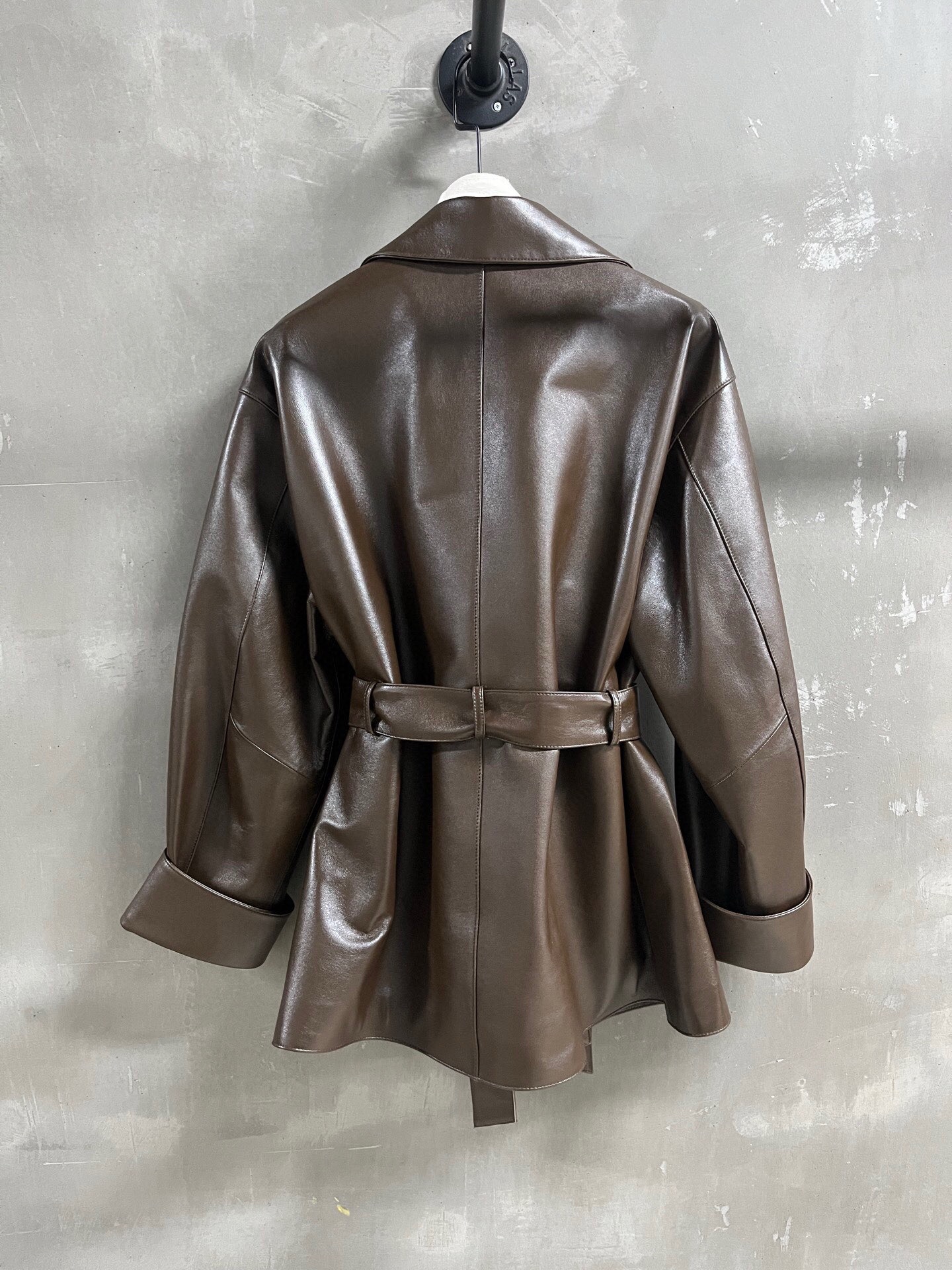 The leather is soft and has a smooth, shiny finish. The jacket’s overall look is structured but not stiff, making it suitable for various occasions. The relaxed fit and mid-thigh length offer versatile styling options. Please see photos for detailed views of the jacket and lining.