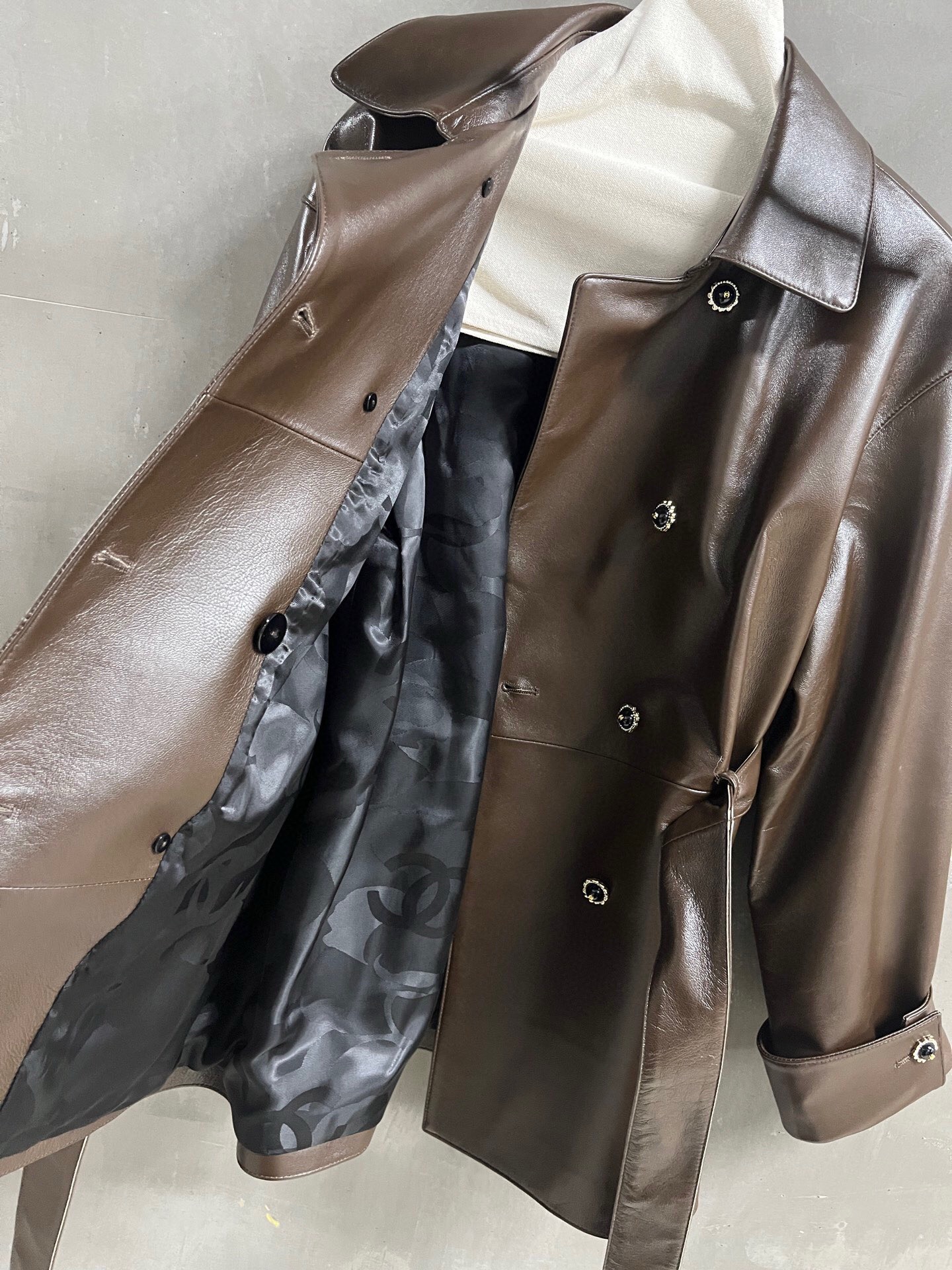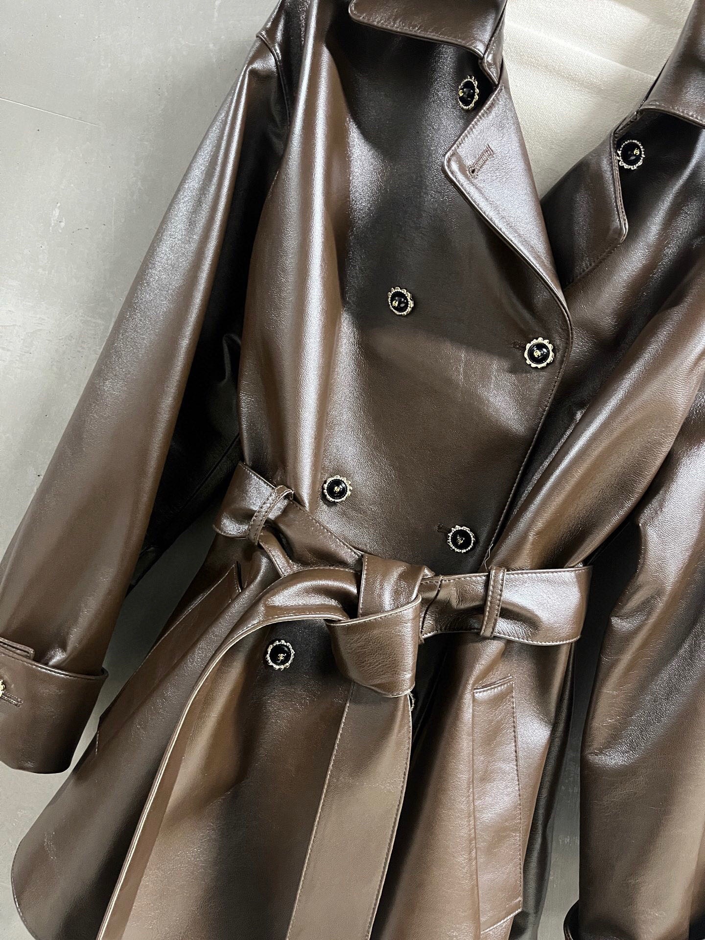This is a Chanel spring 2026 brown lambskin leather jacket. The jacket features a double-breasted front with unique decorative buttons, a wide notched collar, and a matching leather belt at the waist for an adjustable fit. Both cuffs also have matching decorative buttons. The interior is lined with a black patterned fabric.