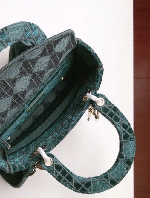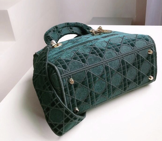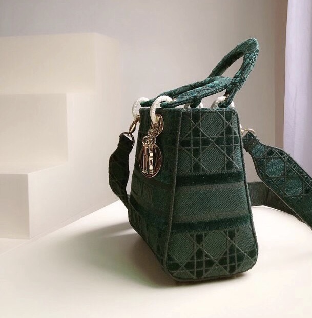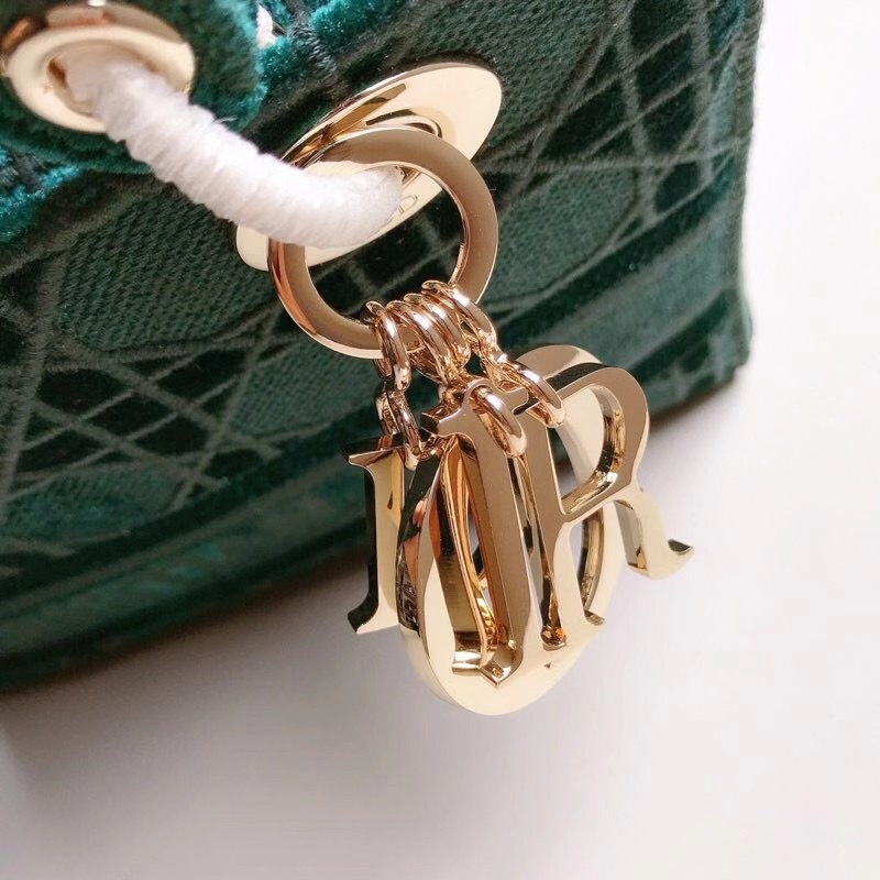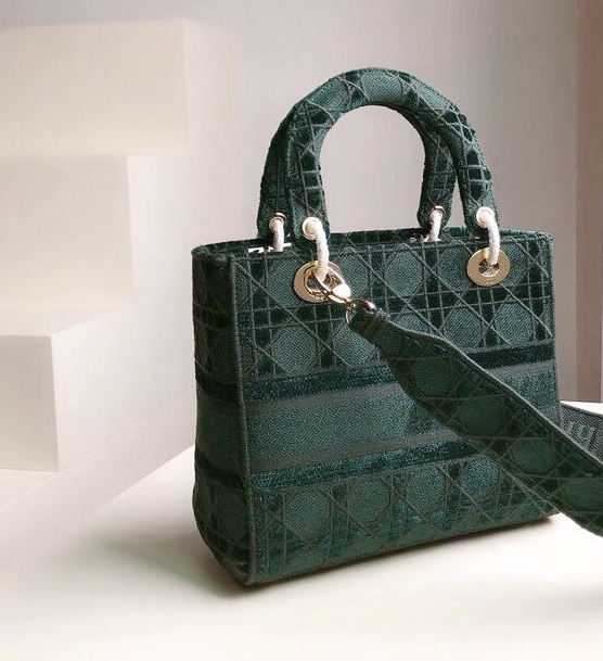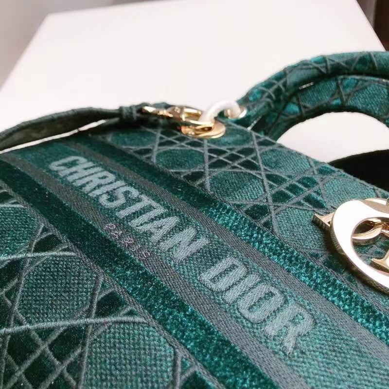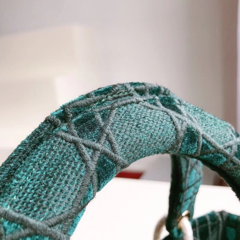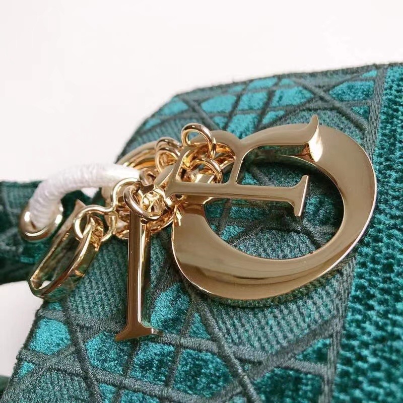 The Lady D-Lite handbag epitomizes Dior's vision of elegance and beauty. A sleek and feminine green velvet bag that is fully embroidered with the Cannage motif in contrasting matte cotton thread and features a tonal 'Christian Dior' signature on the front. The pale gold signature 'D. I. O. R.' charms embellish the classic silhouette. This medium style has a large, fully embroidered and removable shoulder strap and can be worn many ways.