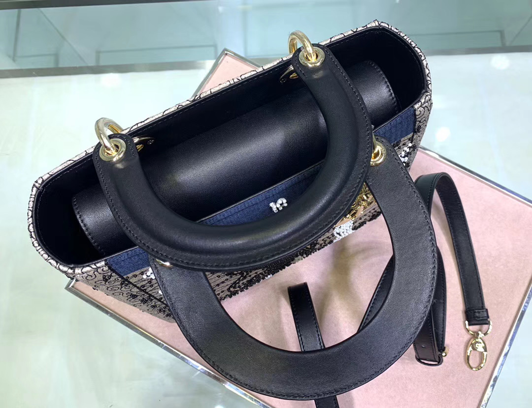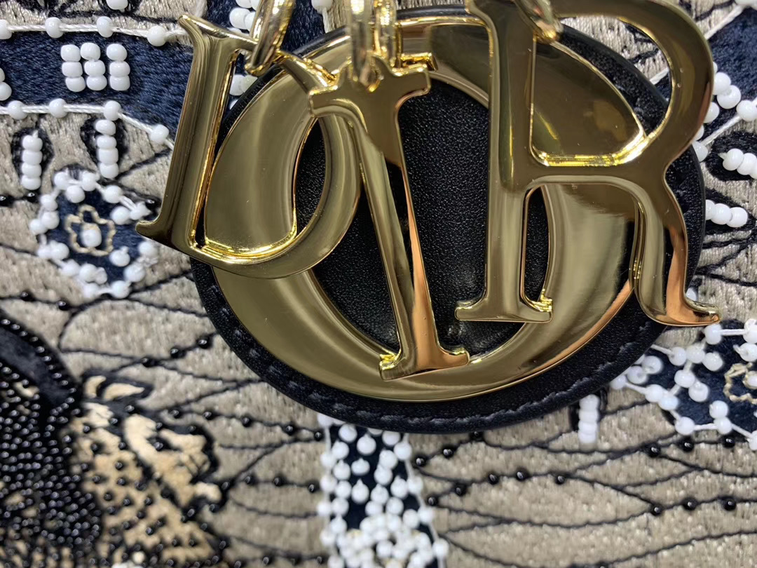 The Lady Dior M handbag epitomizes Monsieur Dior's vision of elegance and beauty. A sleek, feminine bag, it's timeless yet modern. Crafted with this season's Tarot pattern in a meticulously beaded latte-colored canvas, it offers a glimpse into Maria Grazia Chiuri's fascination with spirtuality. A wheel of fortune adorns the handbag. The pale gold-tone signature "D. I. O. R" charms embellish its A-line silhouette. This medium style has a detachable shoulder strap.