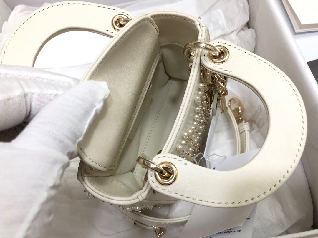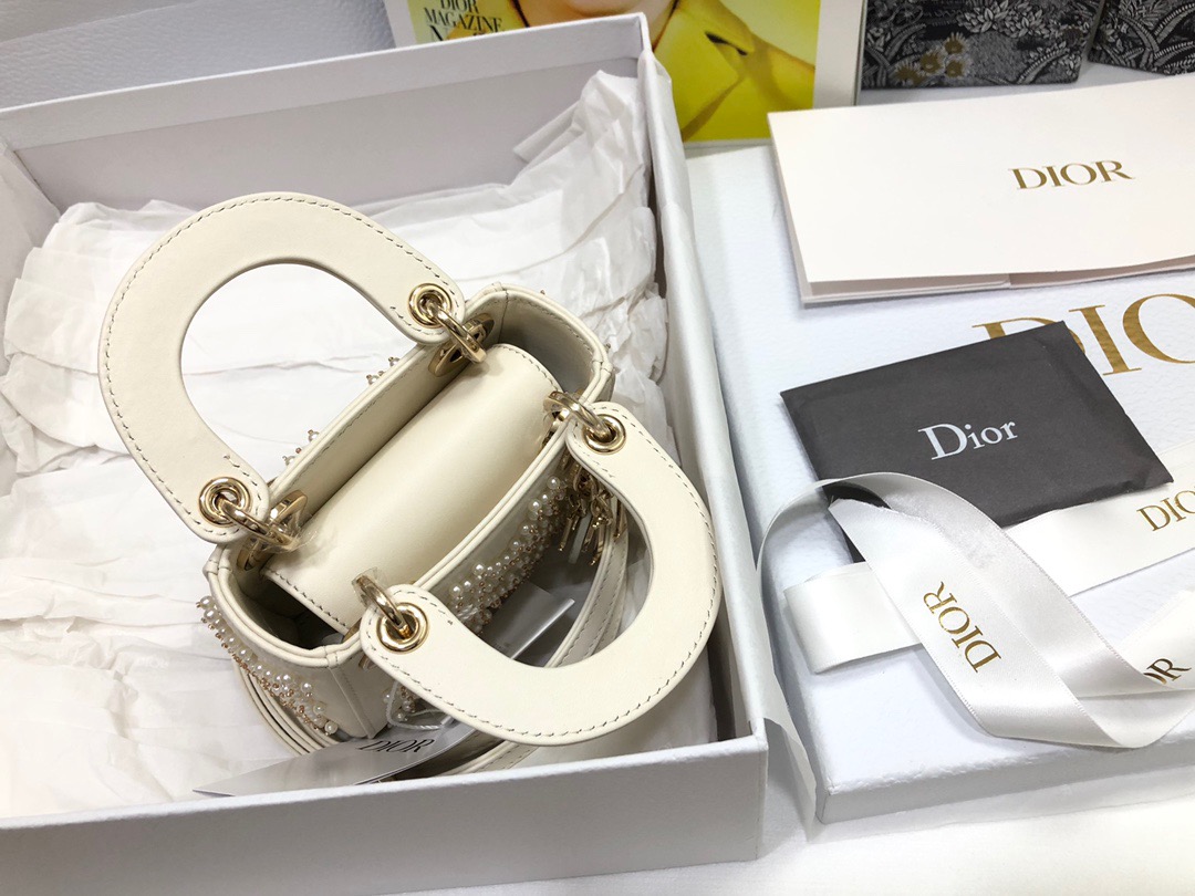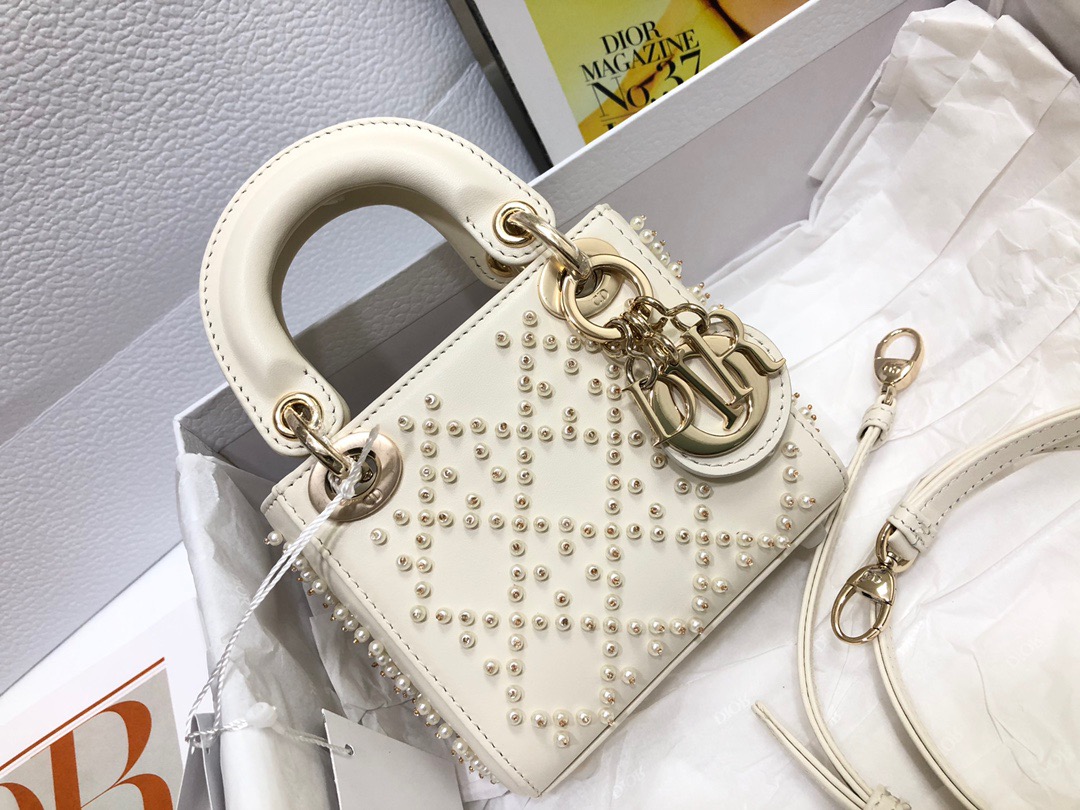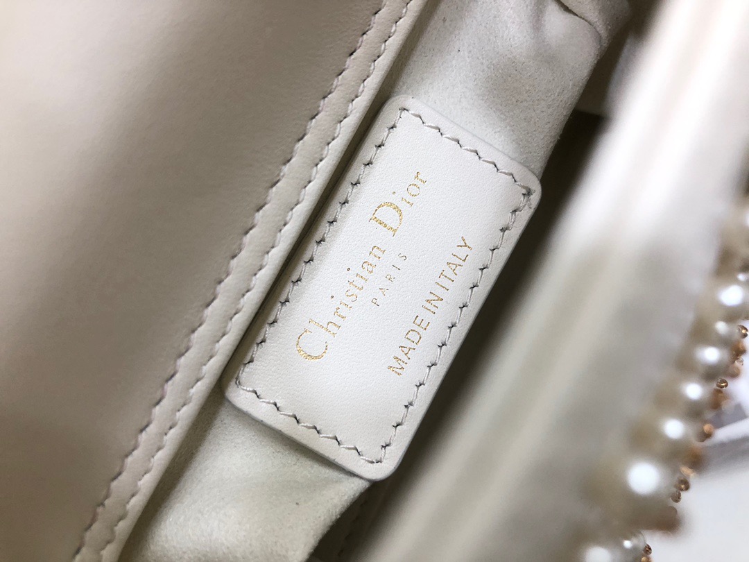 The Lady Dior bag embodies the House's vision of elegance and beauty. Crafted in White lambskin, it features pear creating the hallmark Cannage motif, as well as a ruthenium-finish metal 'D.I.O.R.' charm. The micro style can accommodate all the small essentials. Thanks to top handles and an adjustable and removable shoulder strap, the versatile style can be carried by hand, worn over the shoulder or crossbody.
