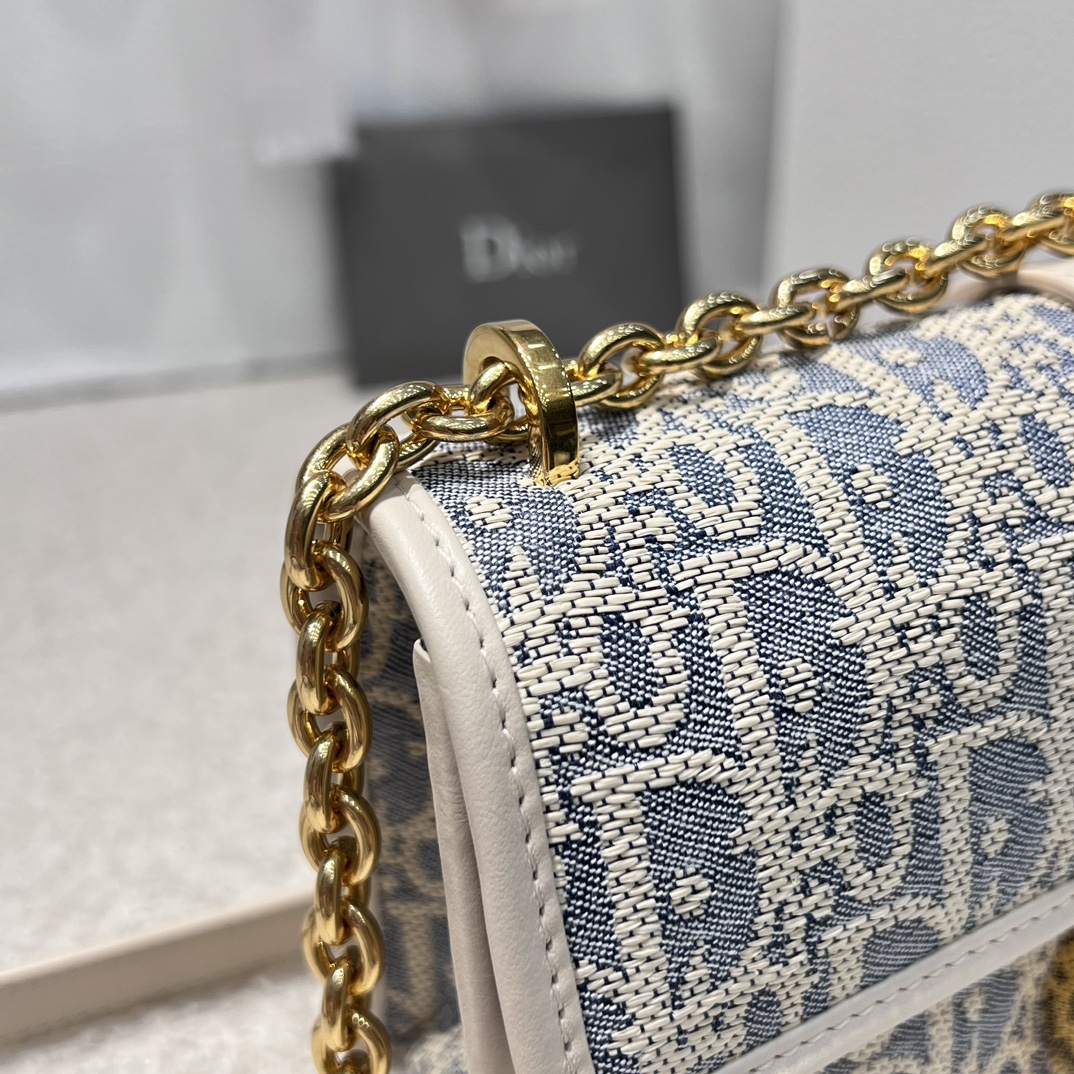 The 30 Montaigne East-West Bag is an ode to the maison's rich ateliers, where the tradition of vintage French embroidery is revived across the iconic Oblique canvas. The interplay of cream leather trim and deep blue monogram canvas creates a chromatic tension that is at once classic and strikingly contemporary, grounded by the polished gold-tone CD clasp — an enduring symbol of the house.