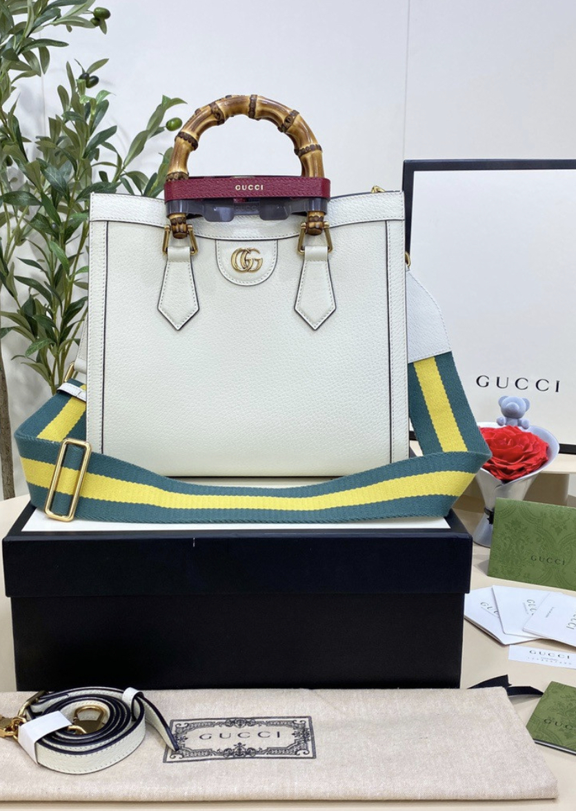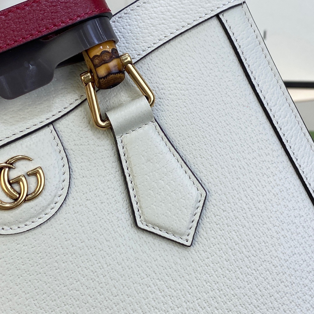 The concept of reinvention continues to shape the House's designs. An evolution of a bamboo handle tote first introduced in 1991, the Gucci Diana represents the notion of style in constant evolution. The design plays with traditional details and renews them new meaning. Playing with this idea, the functional bands used to keep bamboo handles in shape are reimagined as playful leather belts. Here, the tote is introduced in white leather.