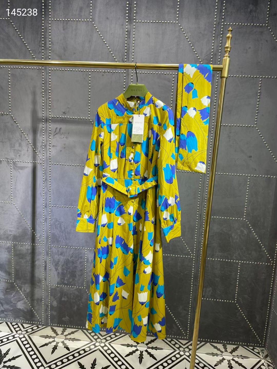 Crafted from a cotton linen blend, this mid-length dress is printed with a tulip motif. The world of nature continues to permeate the House’s aesthetic with vintage inspired floral prints. Poppies, tulips and lilies appear on dresses elevating classic daywear looks.