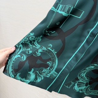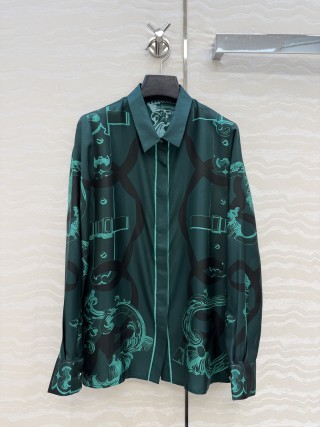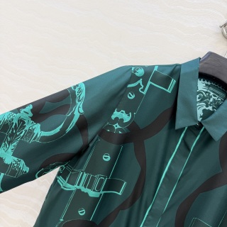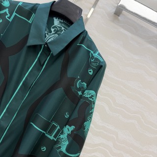 This listing is for an Hermes 26s early spring shirt made from 100% pure silk twill. The shirt features a unique chain link positioning print in green and black, standing out with its thoughtful pattern placement and rich color. The fabric has a soft, smooth texture and a gentle drape, offering a comfortable and refined look.