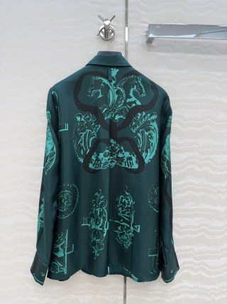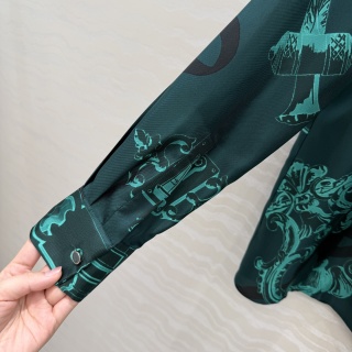 The shirt has a relaxed-cut silhouette with a small, loose collar and long sleeves with button cuffs. The fit is easygoing but sophisticated, making it flattering and suitable for different occasions. Exquisite craftsmanship is visible in every detail, from the precise print alignment to the classic tailoring.