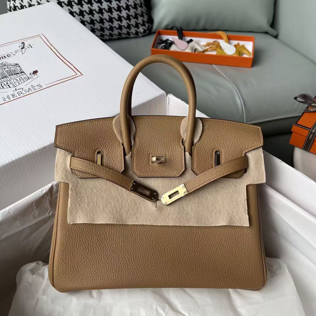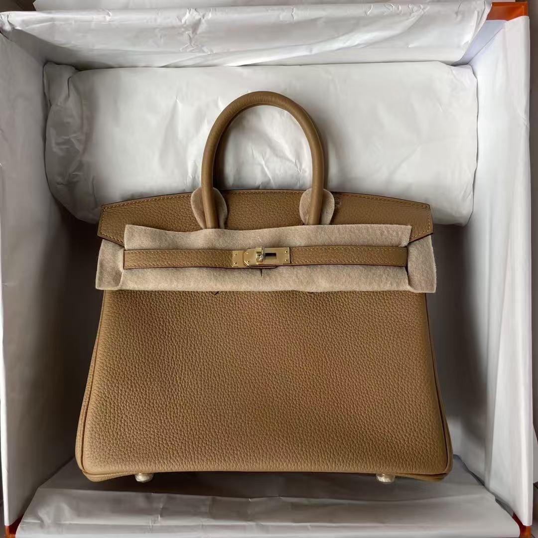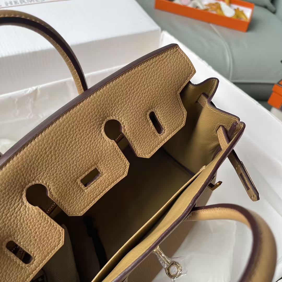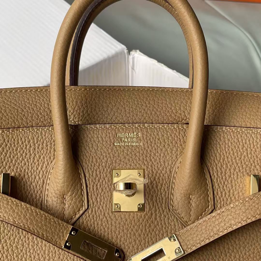 Indulge in timeless elegance with the Hermes Etoupe Birkin 25 cm Togo Gold Hardware handbag; embrace sophistication that stands the test of time.