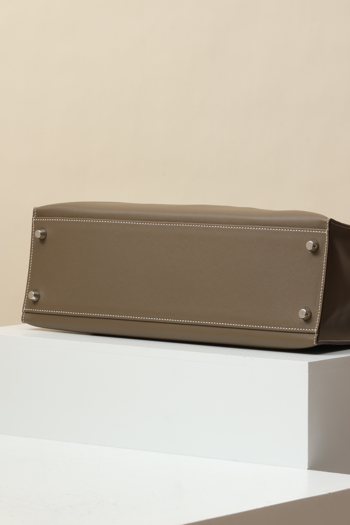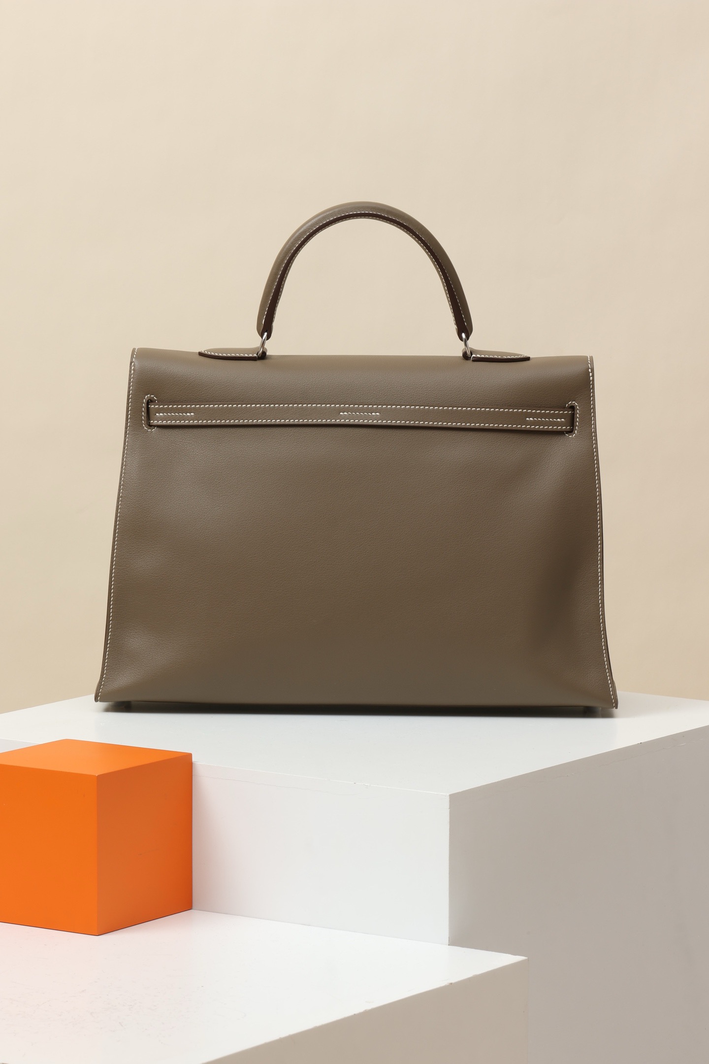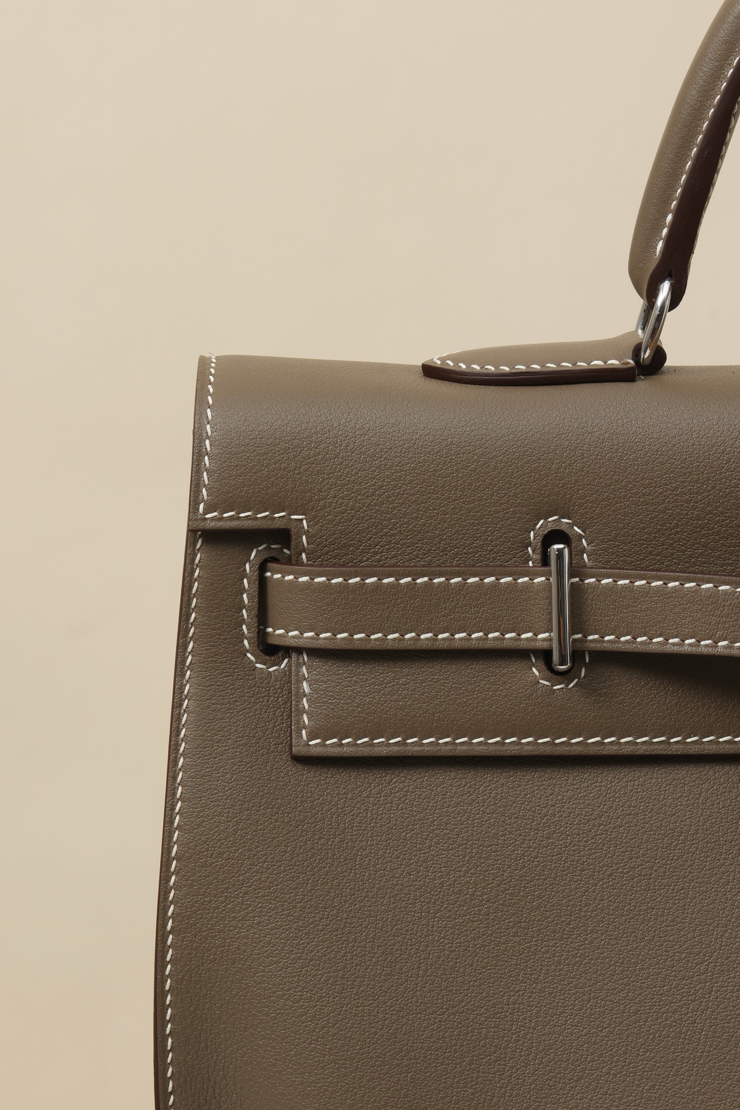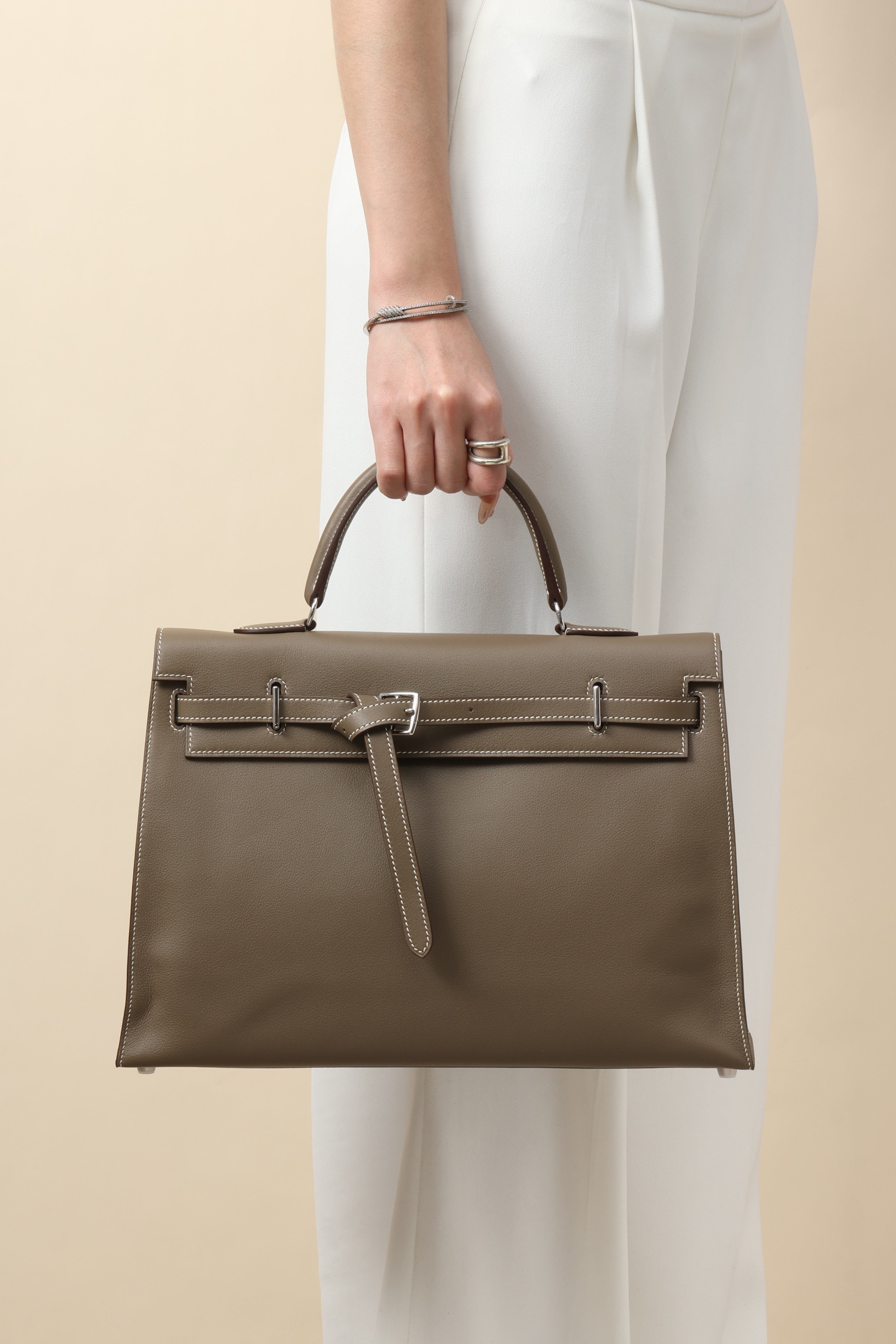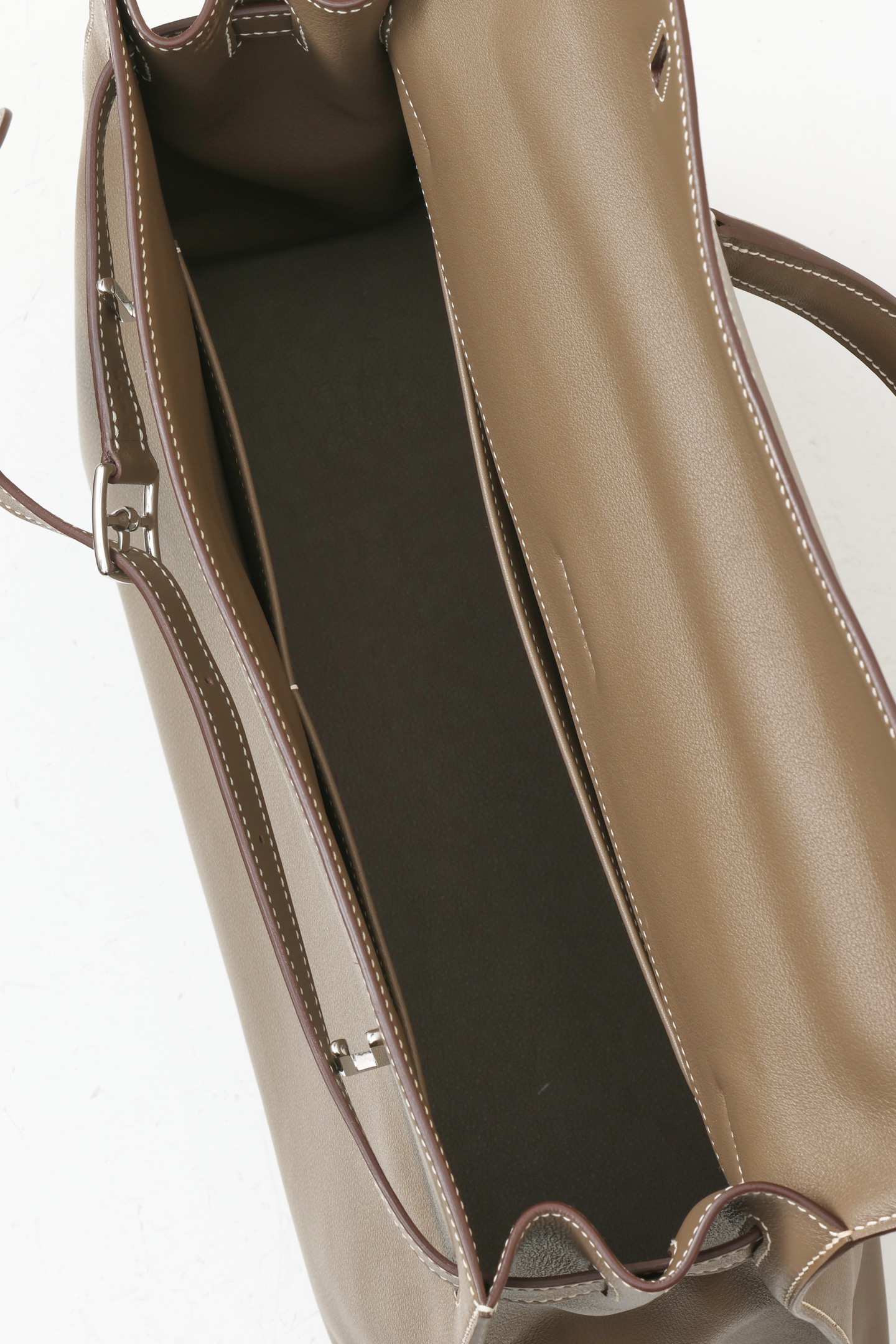 Up for sale is a Hermès Kelly Flat 35 handbag in the Etoupe colour. This bag features smooth leather with contrasting white stitching and palladium hardware. The design is the flat style, making it easy to fold and ideal for both daily use and travel.