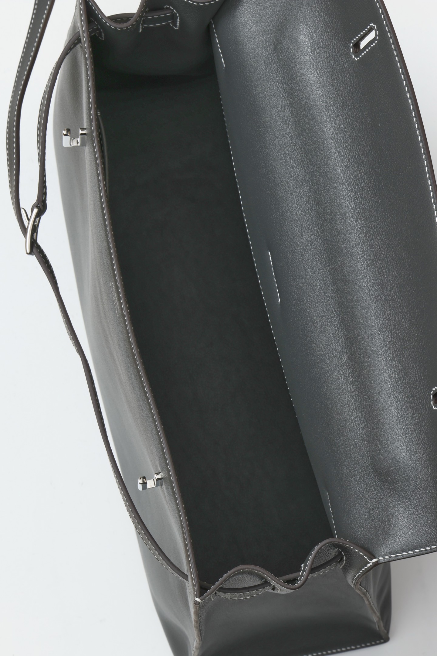 This is a Hermès Kelly Flat 35 handbag in a beautiful graphite color with striking white contrast stitching. The bag features palladium hardware, a top handle, and signature Kelly styling. The design offers a modern, understated look and can be carried by hand or folded flat for easy storage or travel.