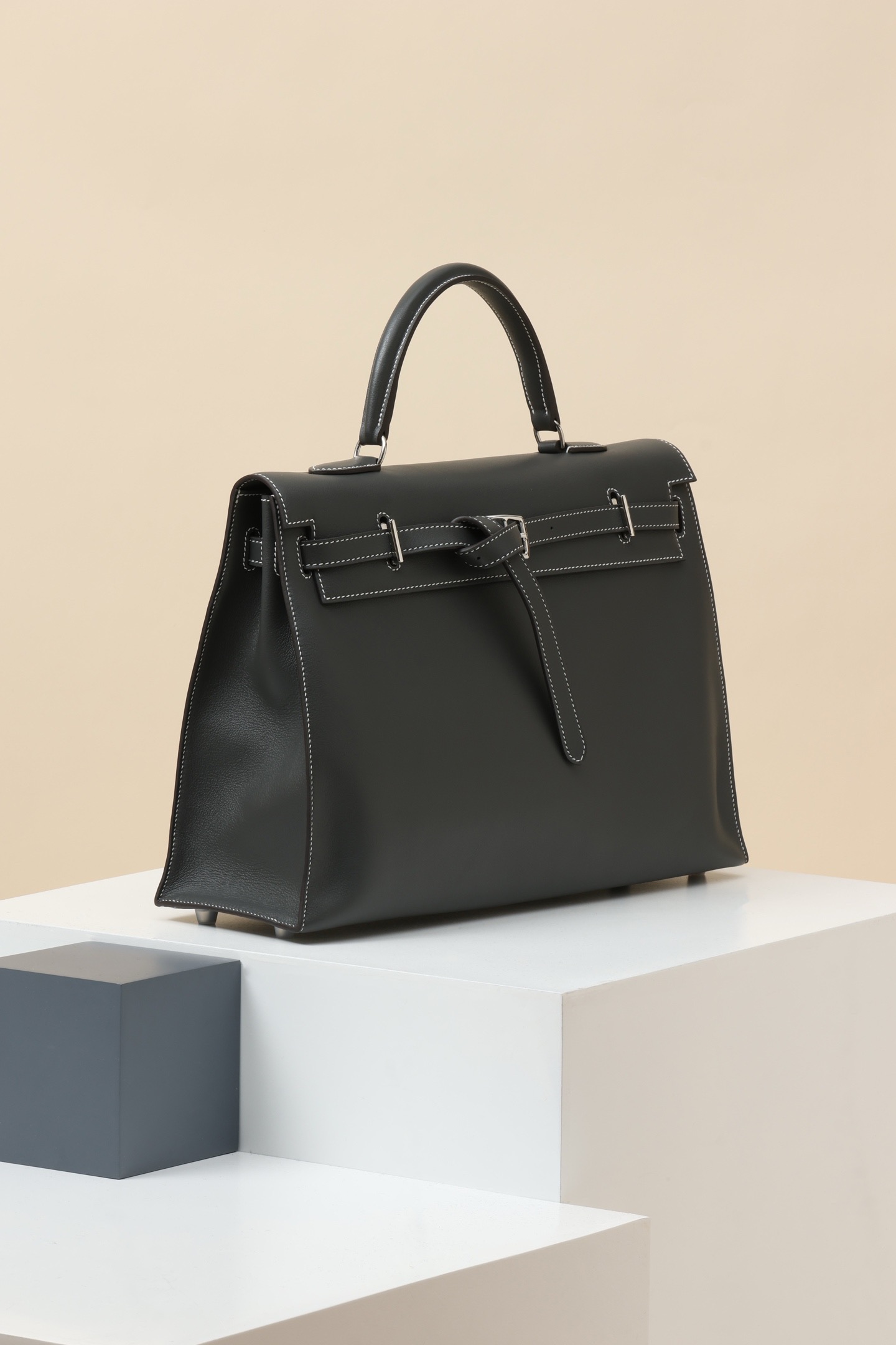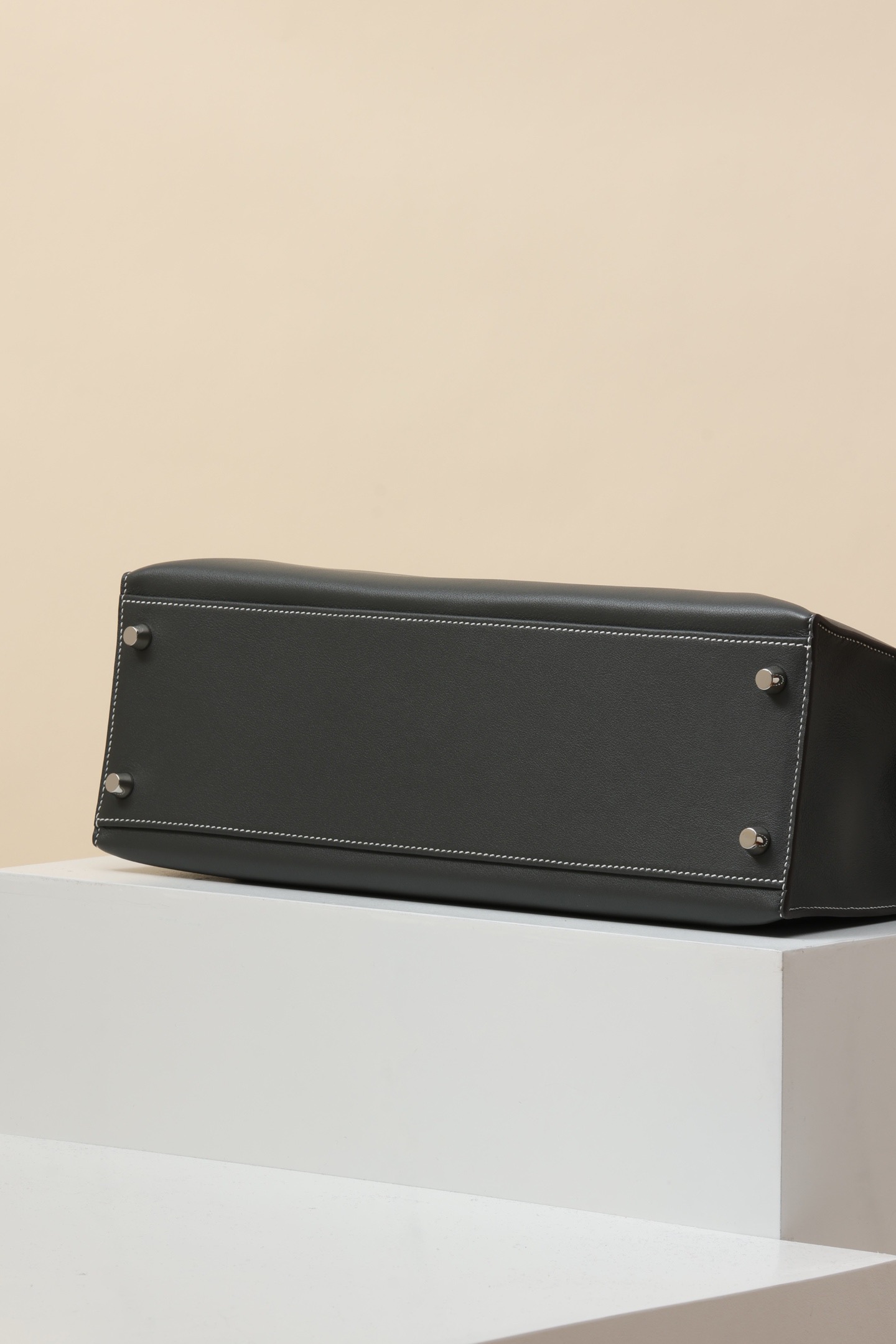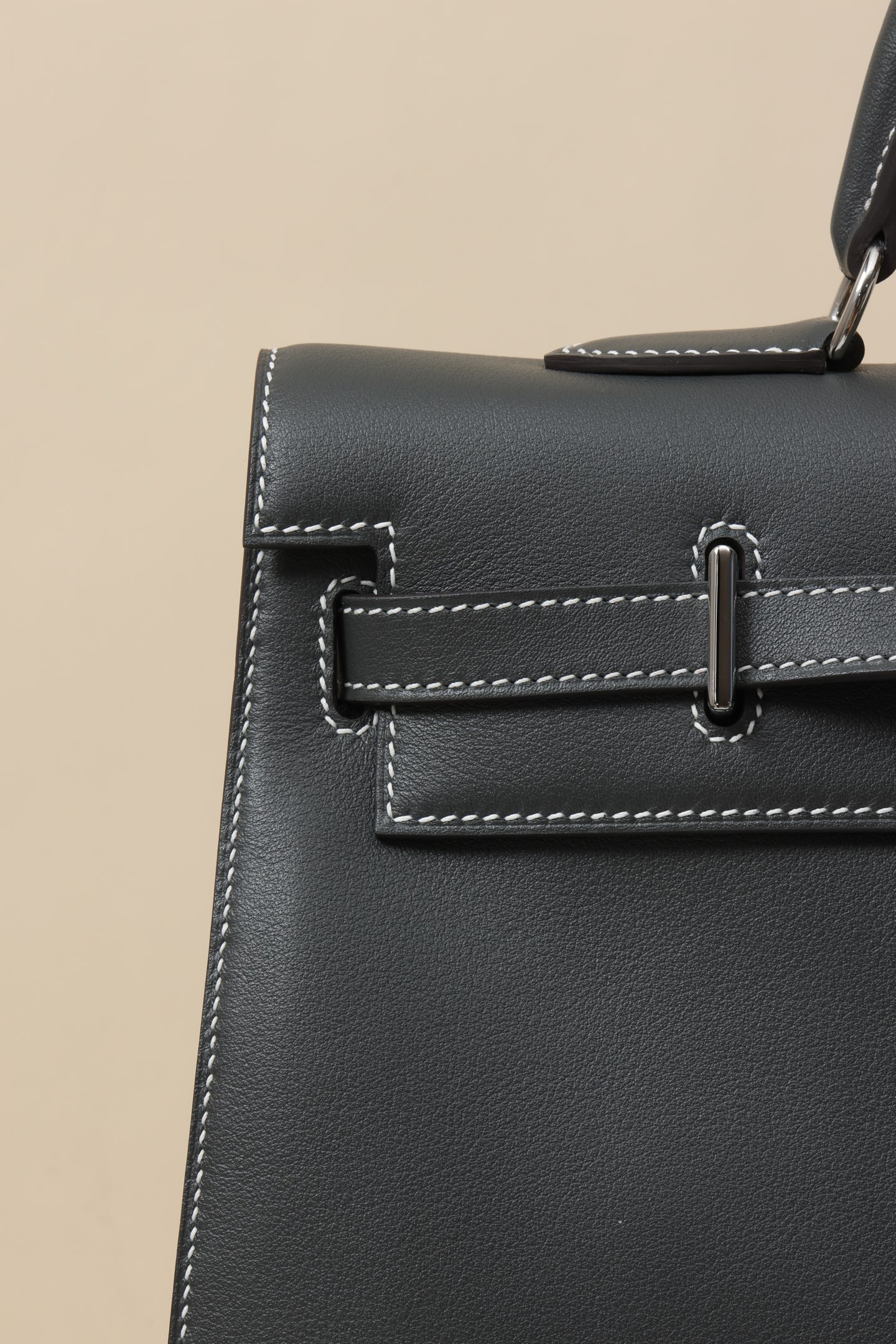 This is a Hermès Kelly Flat 35 handbag in a beautiful graphite color with striking white contrast stitching. The bag features palladium hardware, a top handle, and signature Kelly styling. The design offers a modern, understated look and can be carried by hand or folded flat for easy storage or travel.