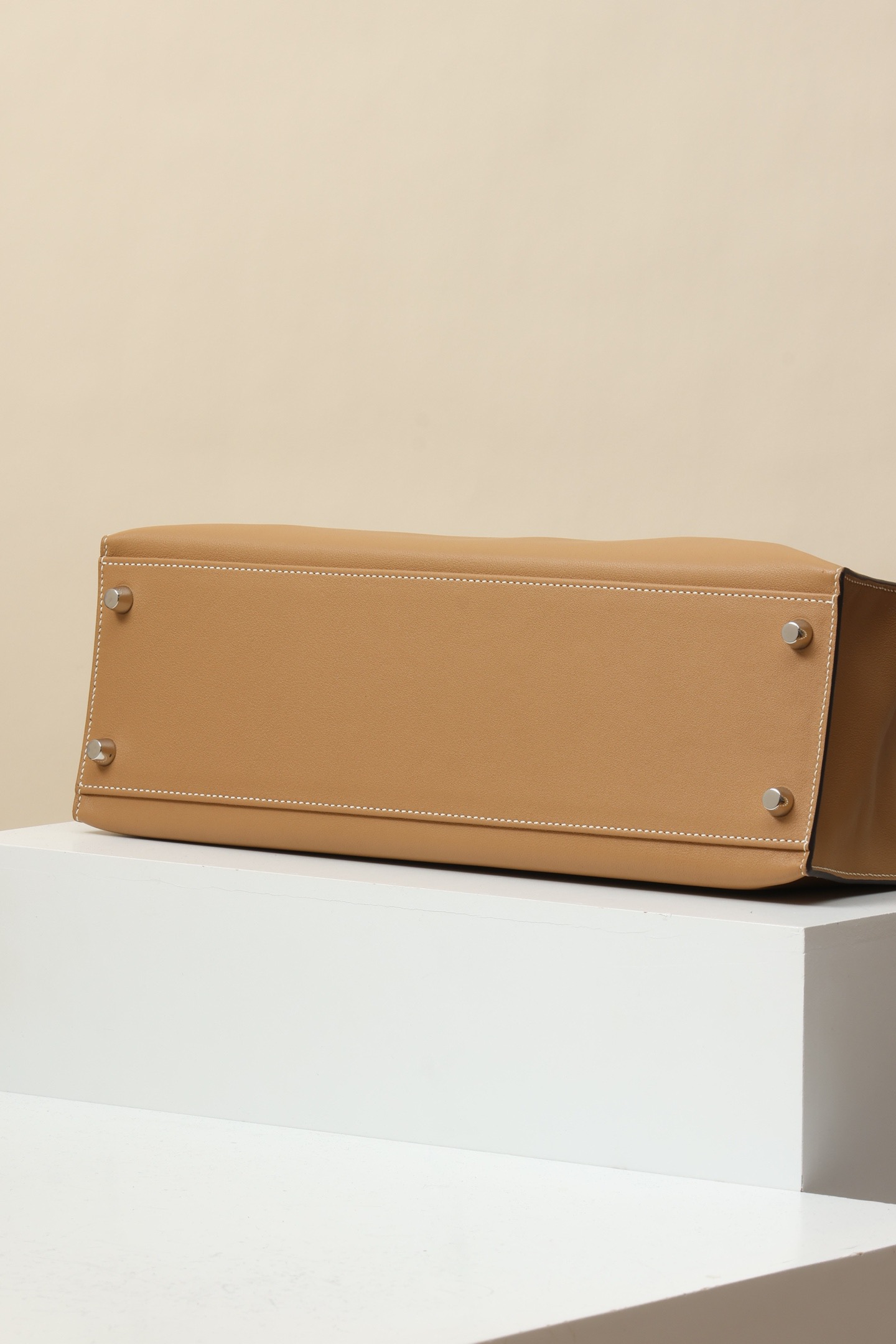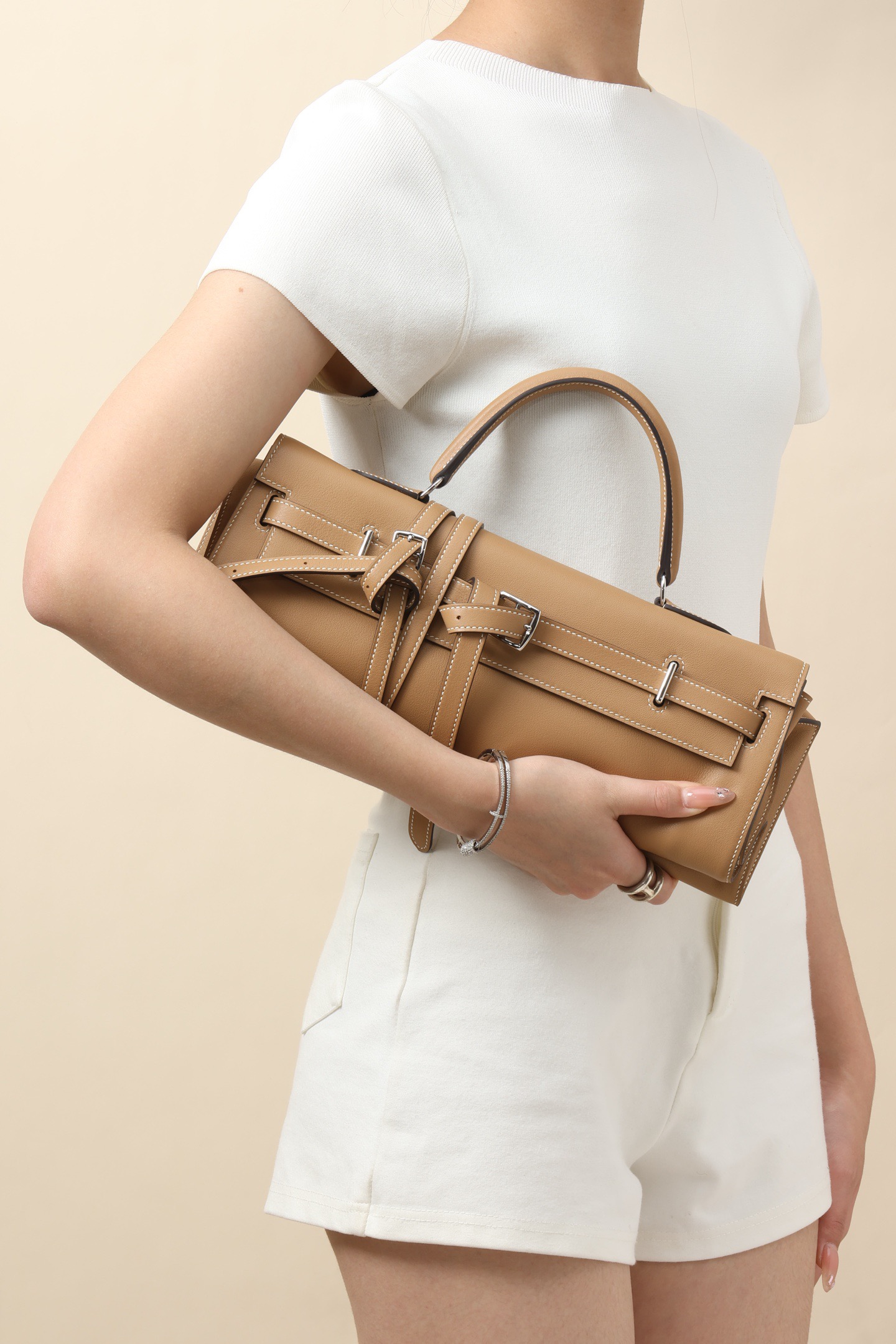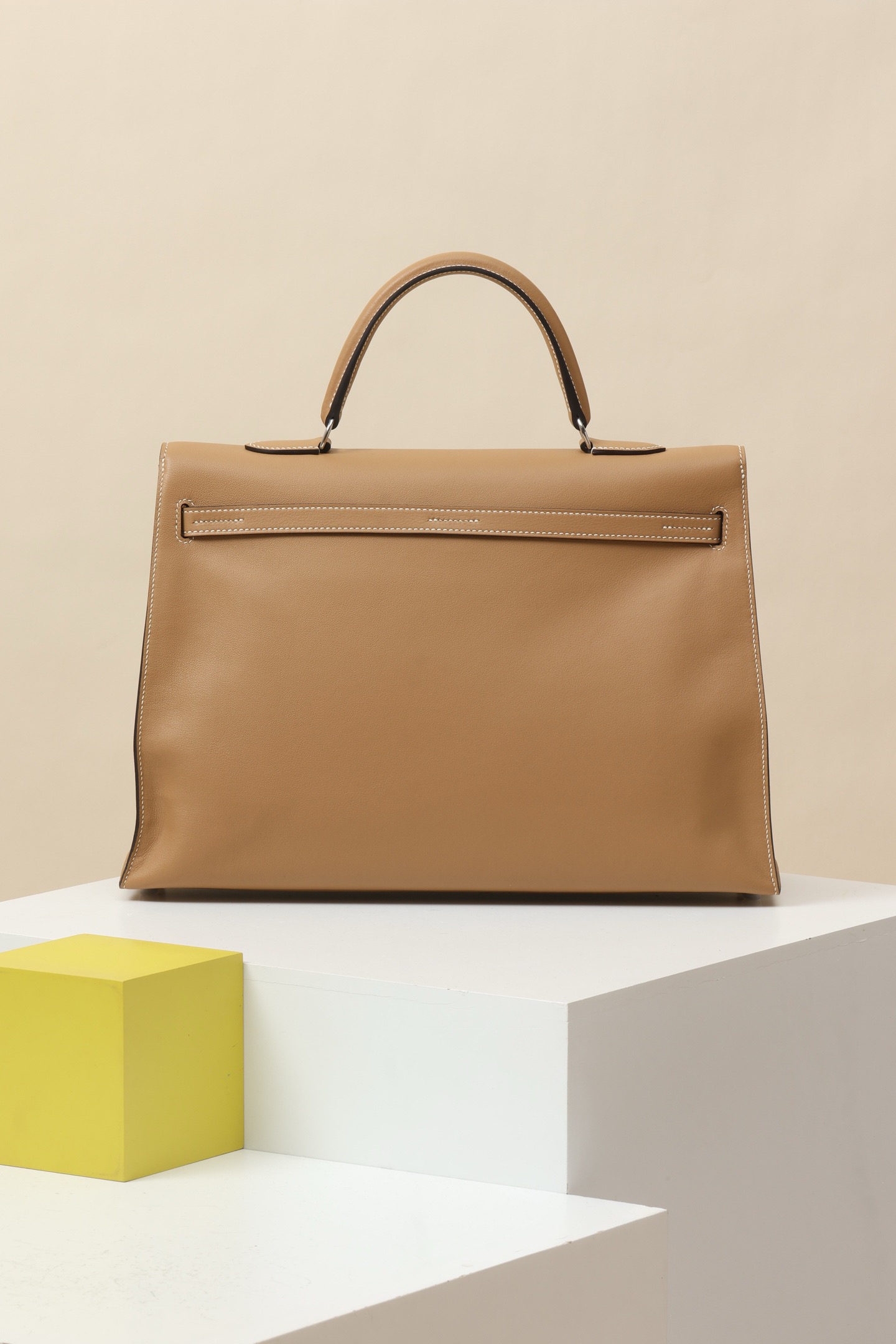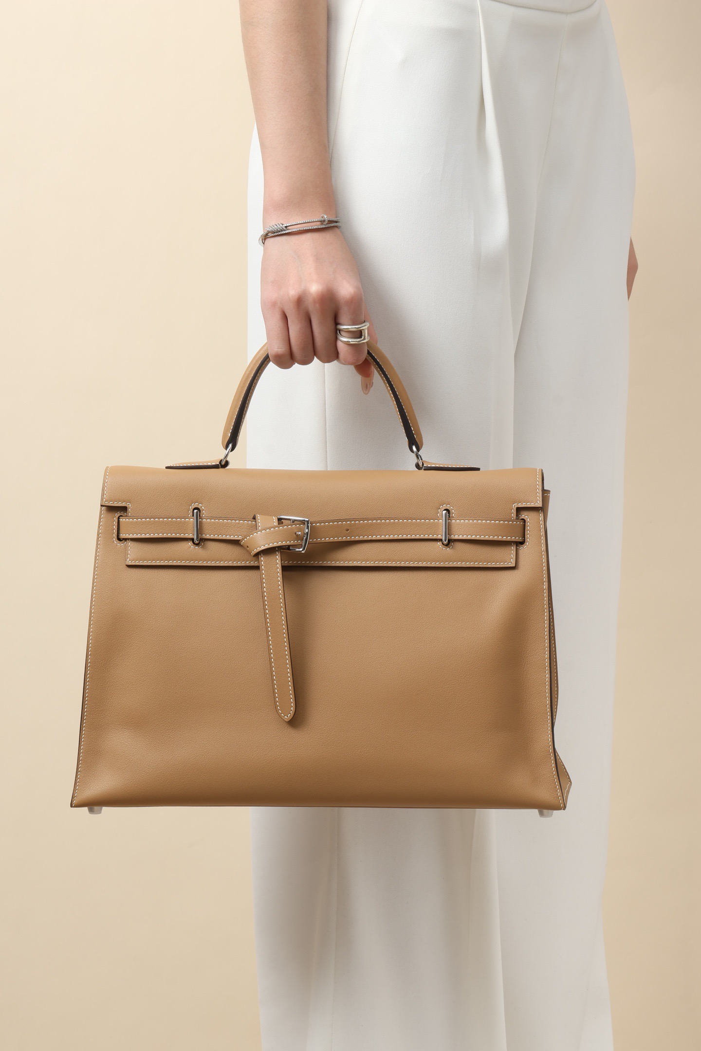 This is an authentic Hermès Kelly Flat 35 handbag in the chai color with palladium hardware. The bag features smooth tan leather with white contrast stitching and a classic single top handle. Its distinctive flat design makes it easy to fold and carry under the arm if preferred.
