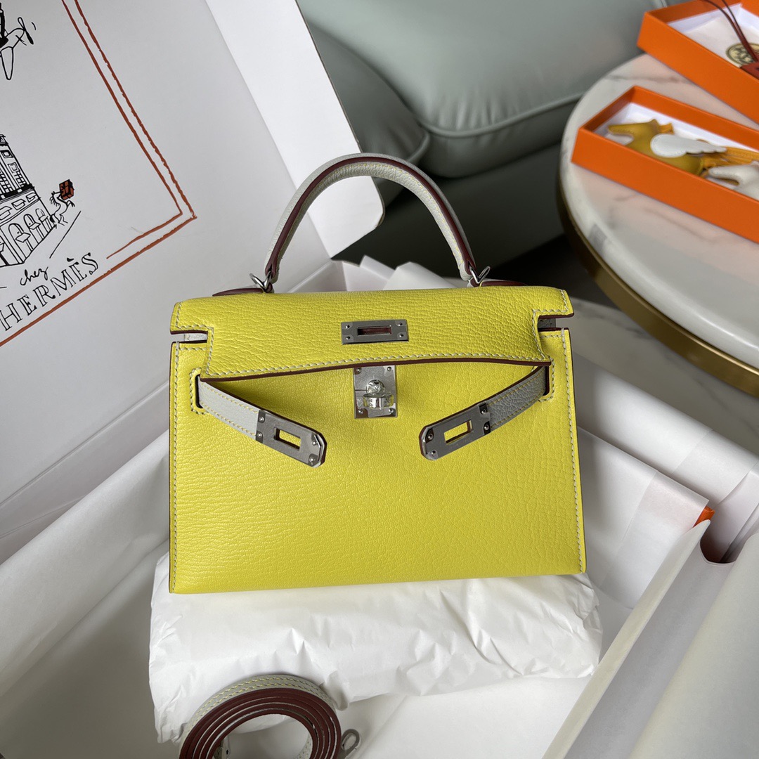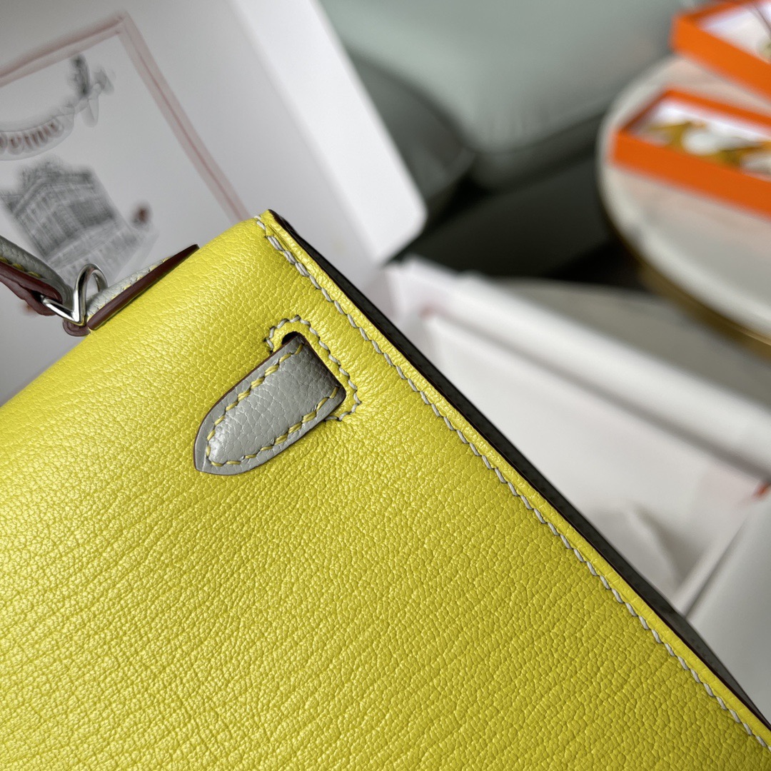 For sale is a Hermès Kelly Sellier 20 mini bag in vibrant lemon yellow and light grey (Gris Perle) chevre leather. The bag comes with protective felt in place and is shown in its original box with dust bag.