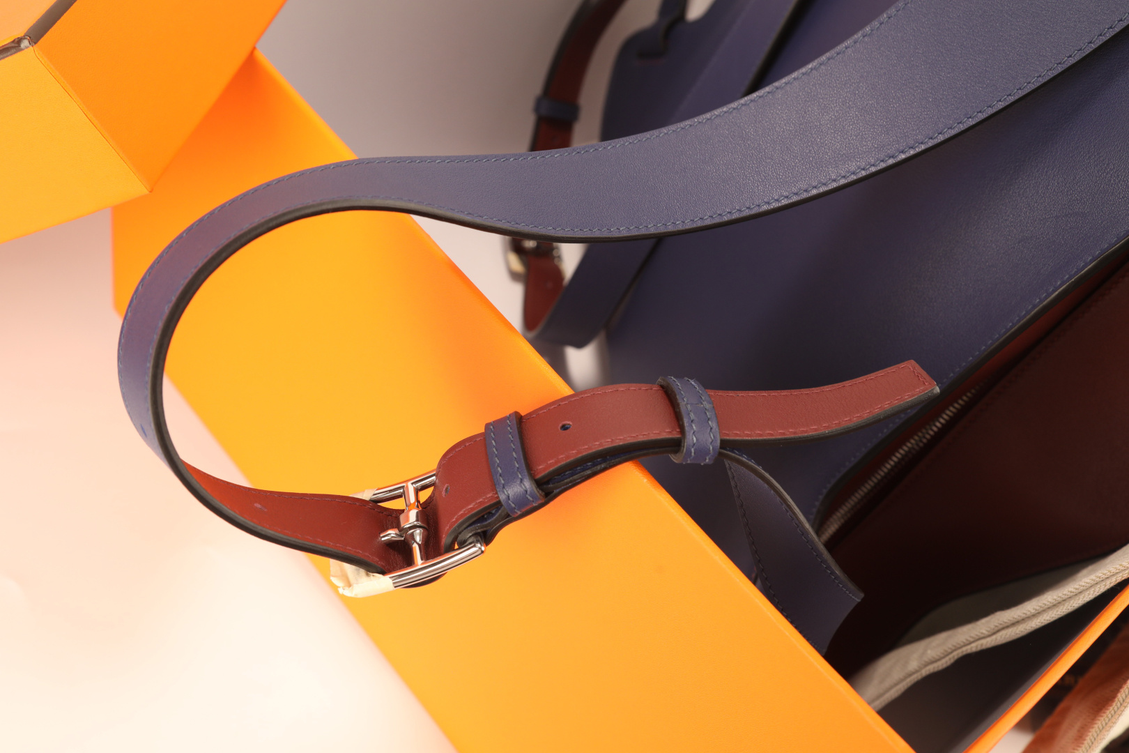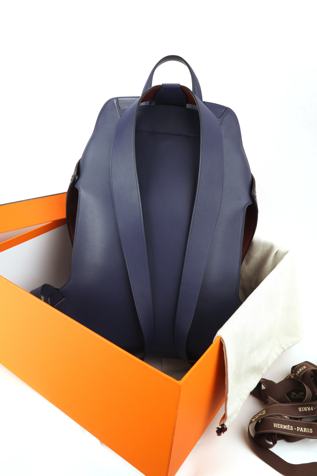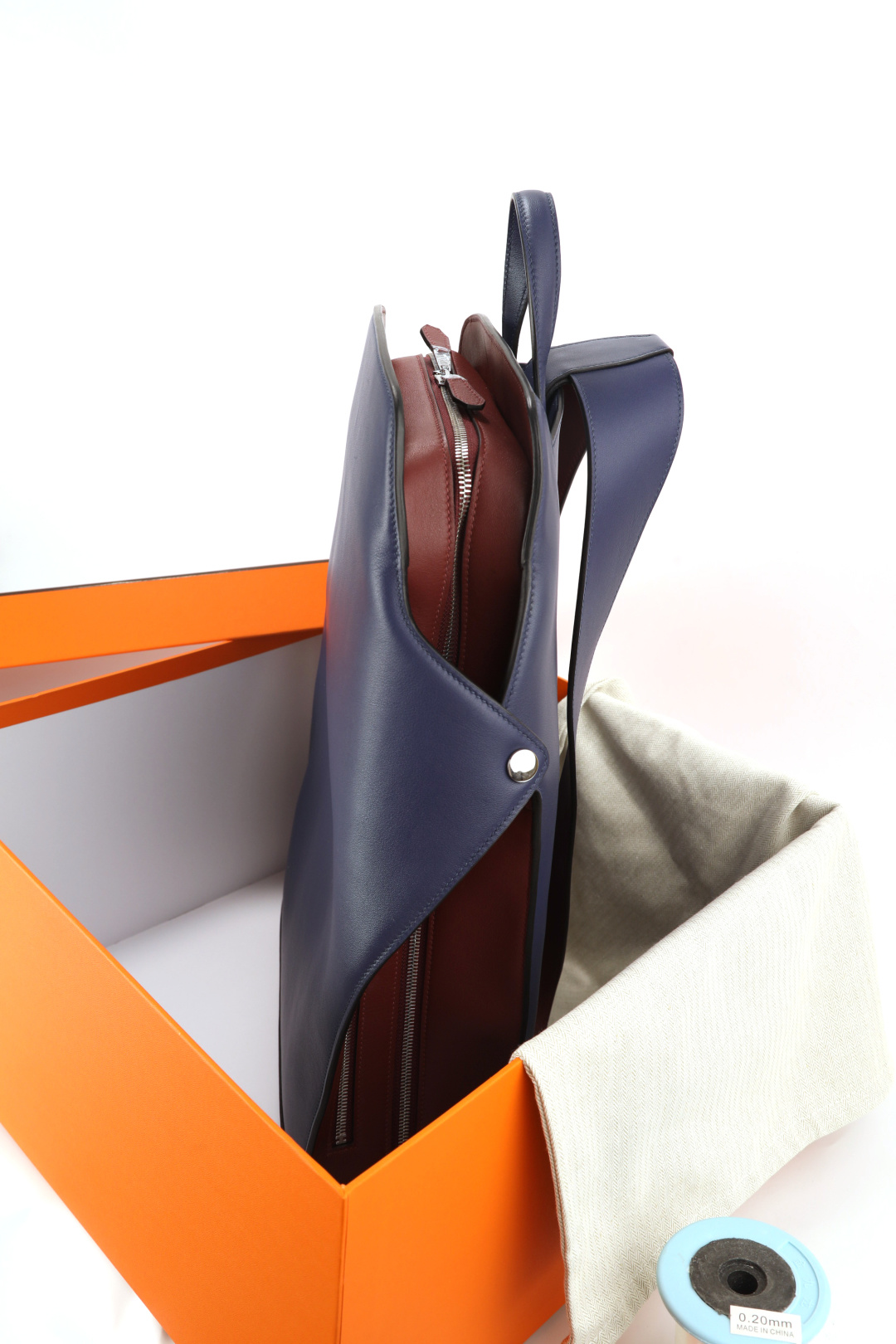 This is a CityBack men's double shoulder backpack made with swift top-grain leather in a deep blue color, combined with burgundy leather details. The interior is lined with canvas, and it features a card pocket design for organization. The bag is hand-stitched with waxed thread and uses all-steel hardware for durability. It has a large main compartment that can accommodate a 17-inch laptop, making it ideal for work or travel. Each piece is crafted with attention to detail and offers a personalized, custom-made touch. What you see is exactly what you get.