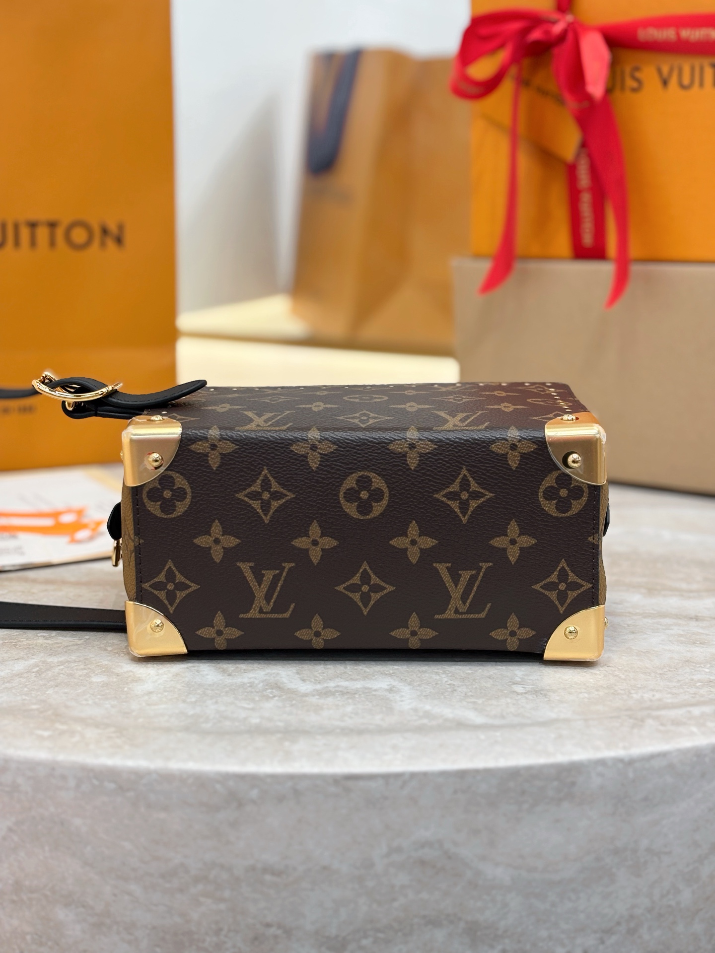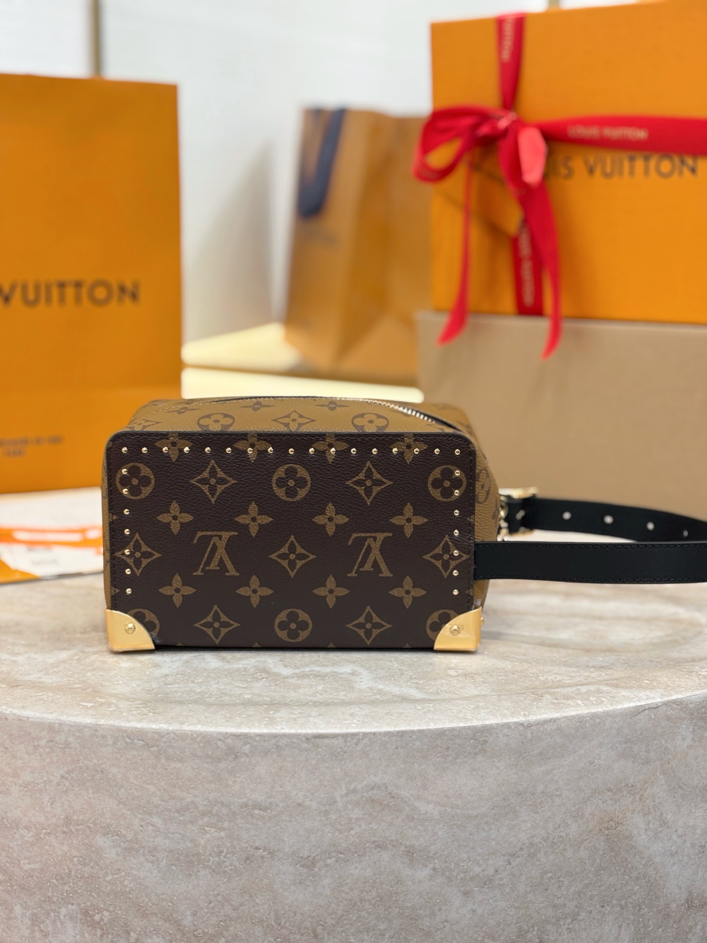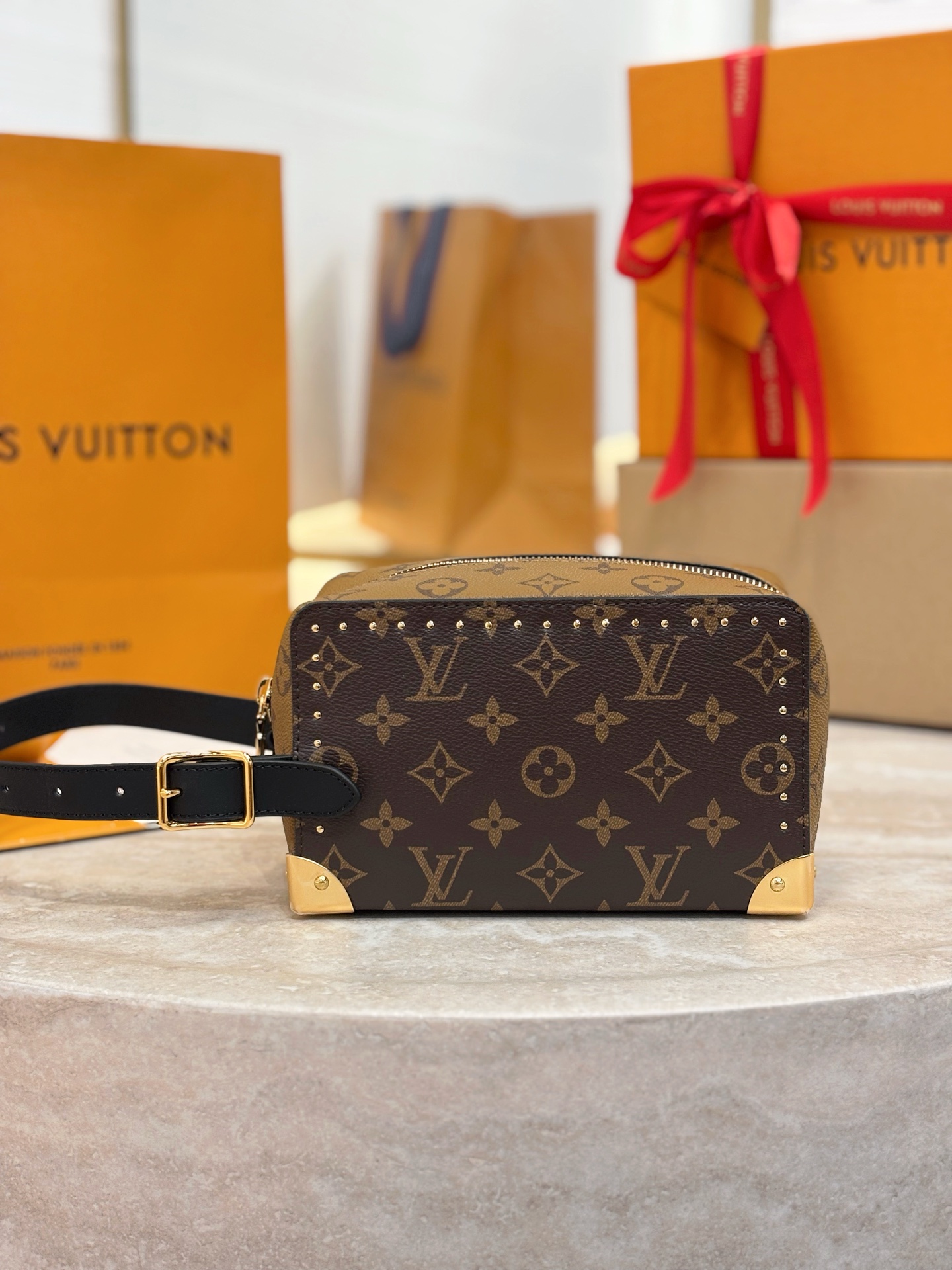 This is the Louis Vuitton Locker Dopp Kit bag (model M29313), designed by Nicolas Ghesquière. The bag is made from signature Monogram coated canvas and features the iconic side locking strap, along with reinforced metal corners and stud detailing. These touches pay homage to the classic heritage of the brand's craftsmanship.