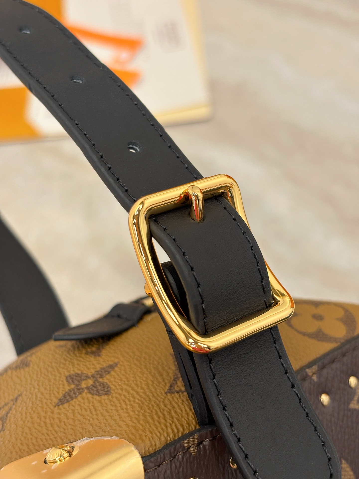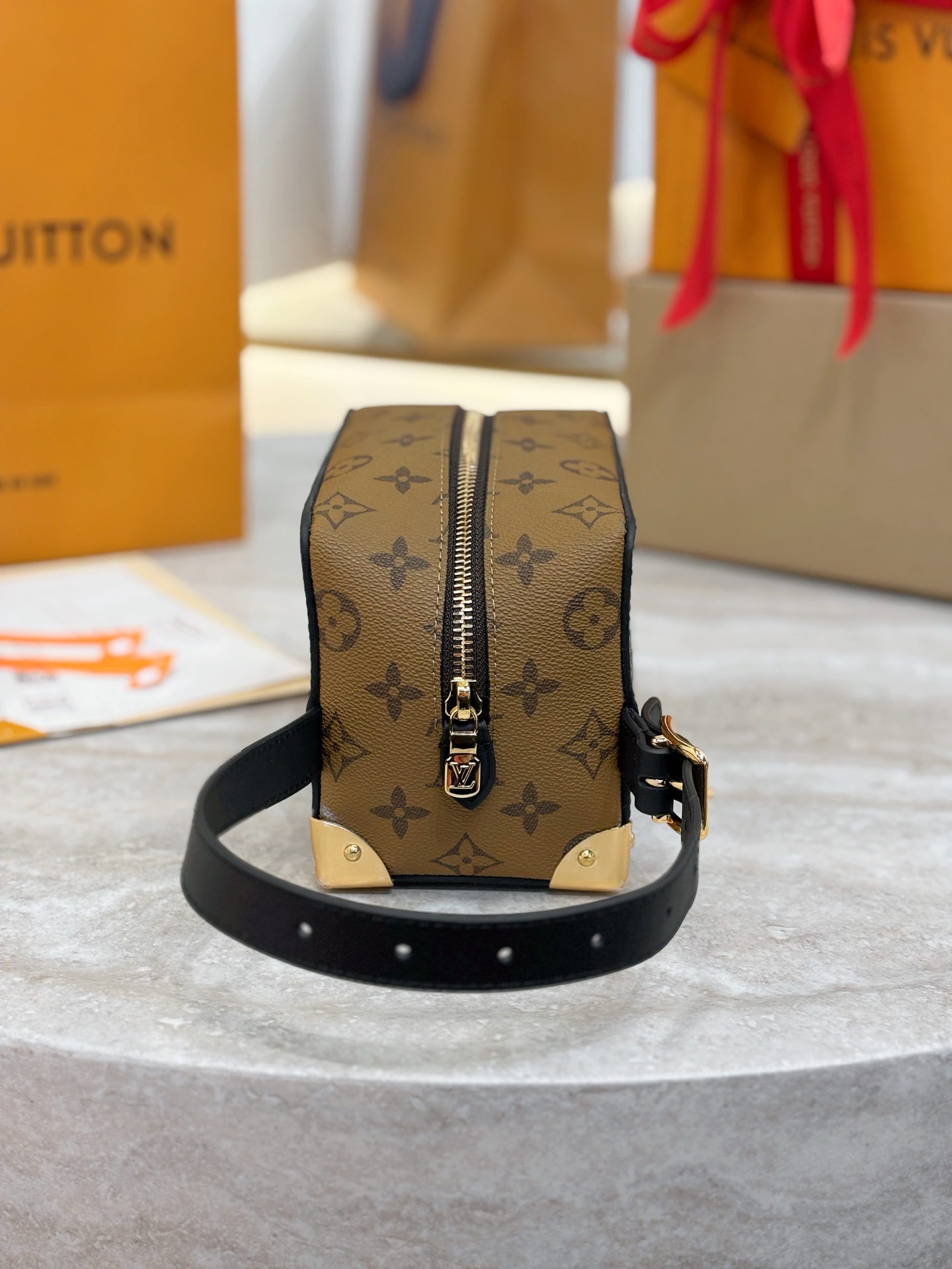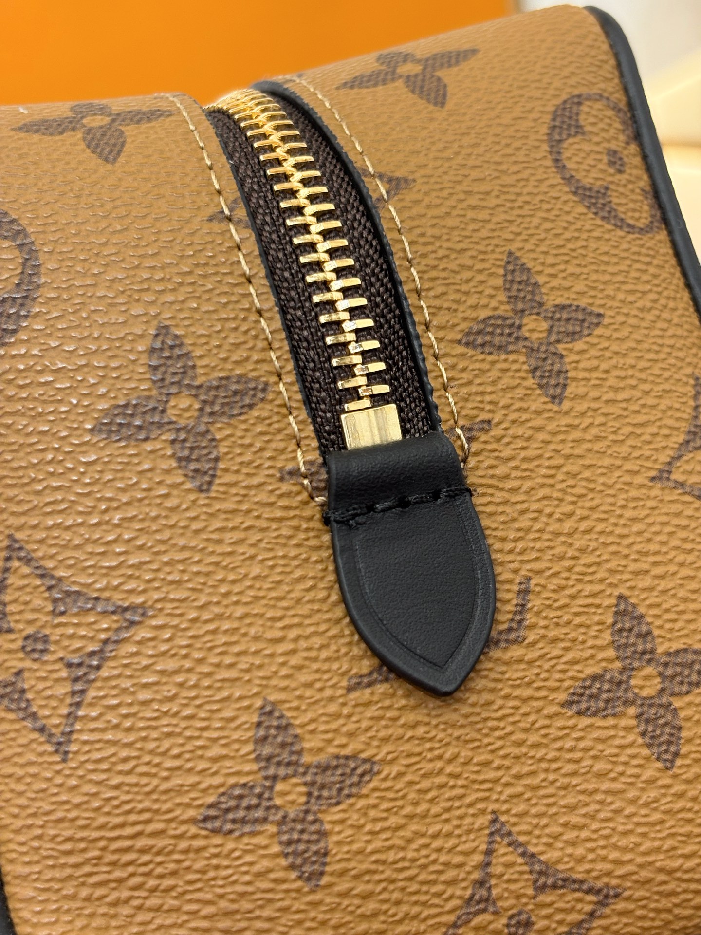 The bag has a Monogram Reverse microfiber lining, bringing a modern twist to the overall look. The details and high-quality construction are clear from every angle, making this piece both practical and stylish for daily use or travel. The smooth zipper and adjustable black strap add convenience and versatility.