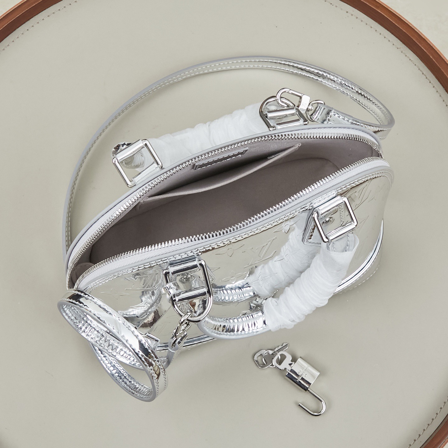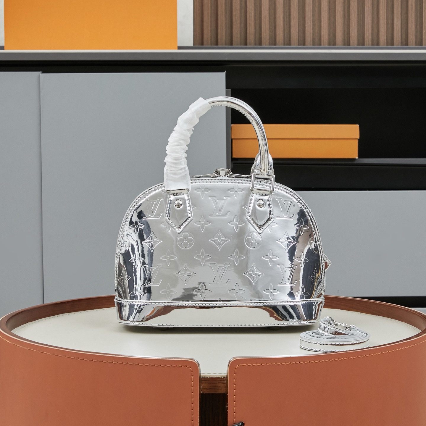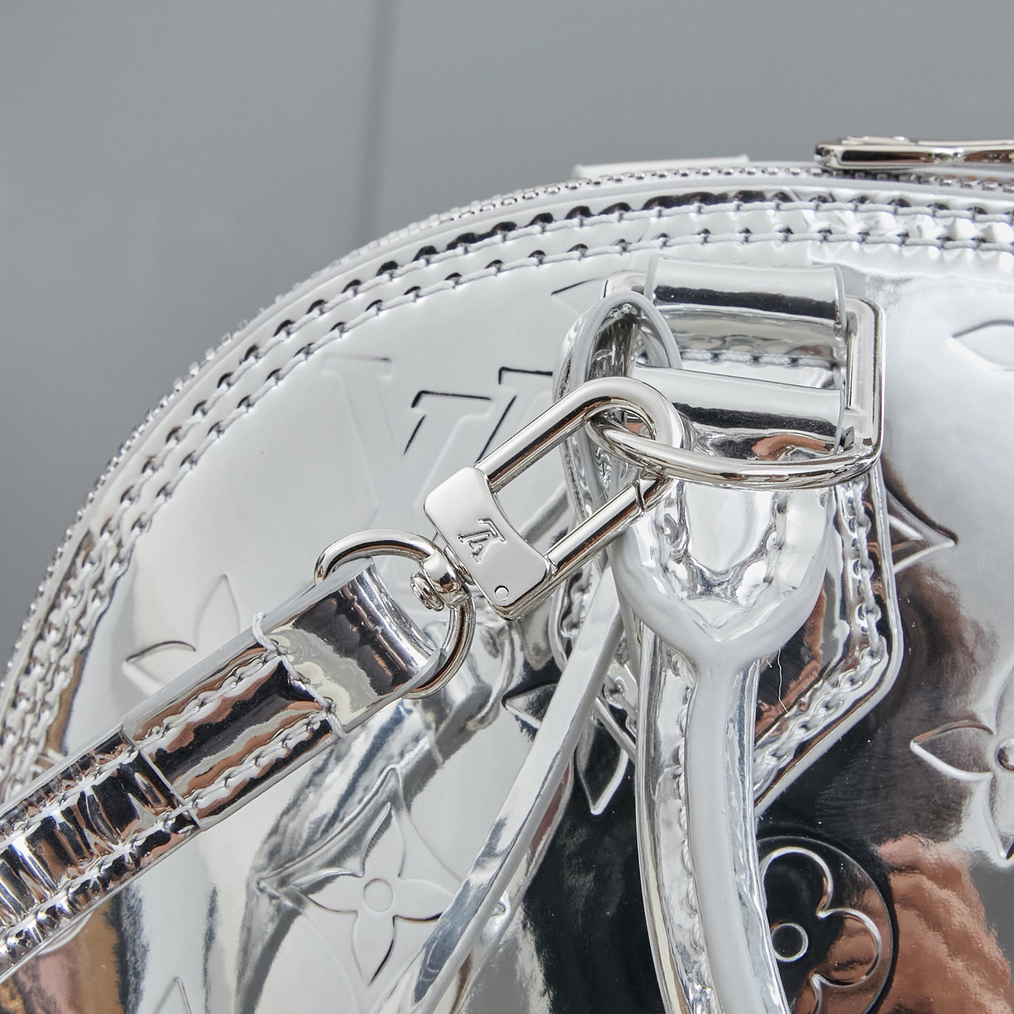 This is the Louis Vuitton Alma BB with the code M26335. The bag is finished in a striking mirrored silver material and embossed with the LV monogram pattern. The compact shape is easy to carry, and it comes with double top handles as well as a removable shoulder strap, making it versatile for hand or shoulder wear.