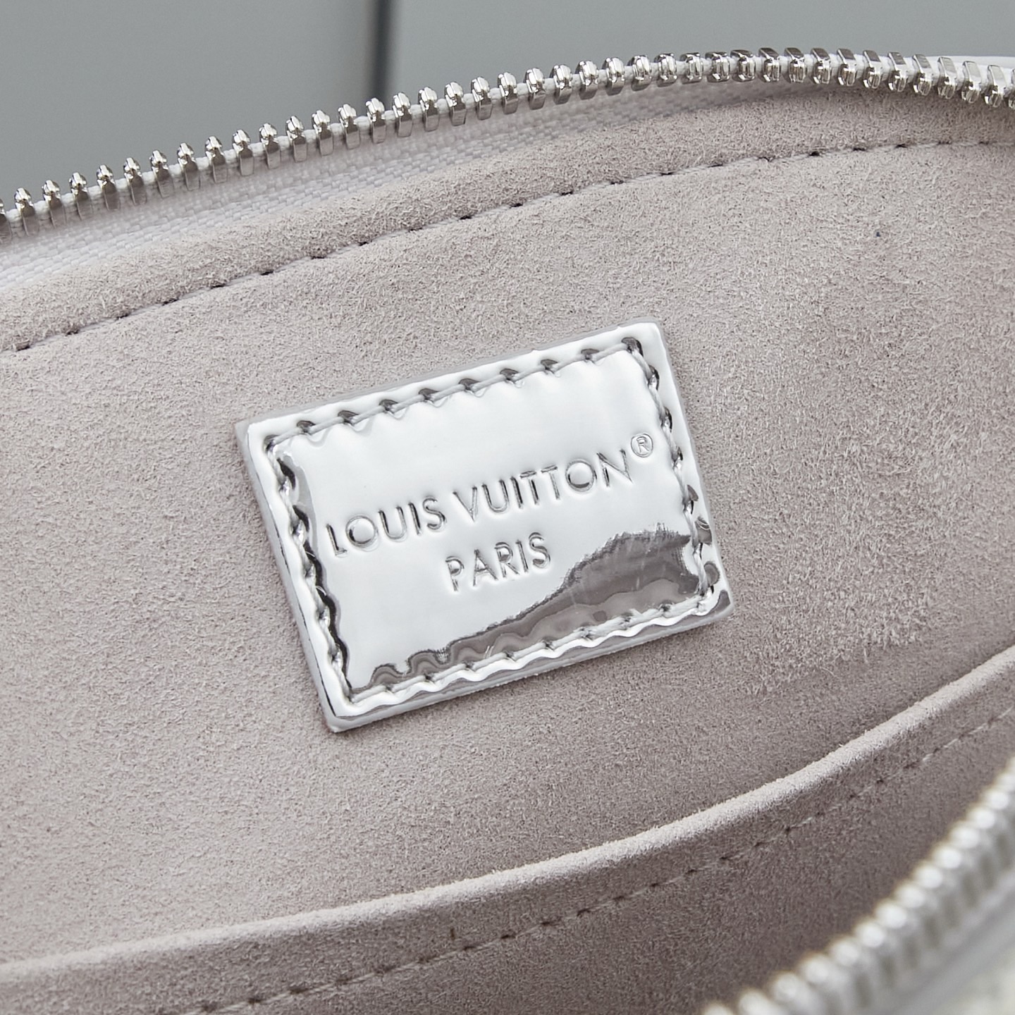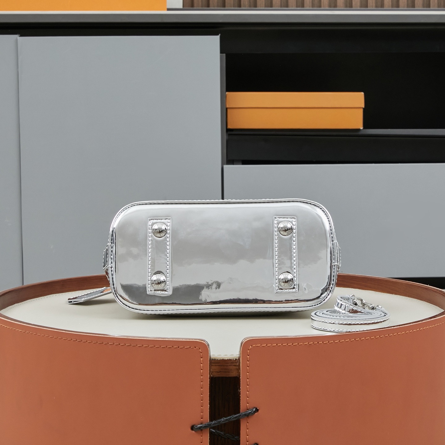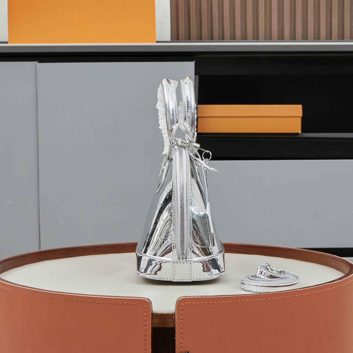 This is the Louis Vuitton Alma BB with the code M26335. The bag is finished in a striking mirrored silver material and embossed with the LV monogram pattern. The compact shape is easy to carry, and it comes with double top handles as well as a removable shoulder strap, making it versatile for hand or shoulder wear.