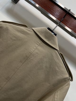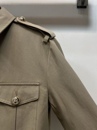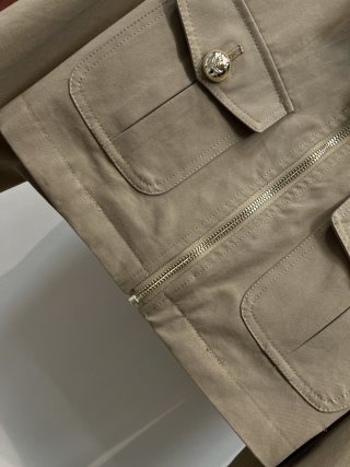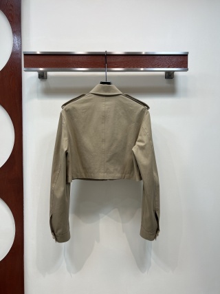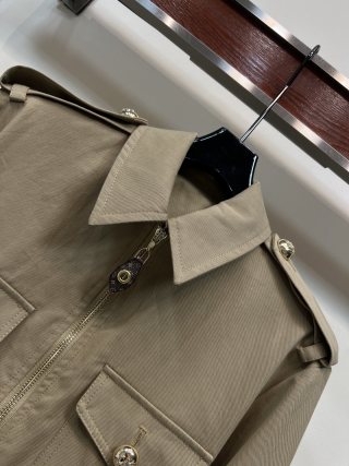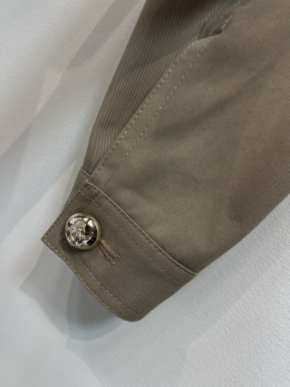 This is a Louis Vuitton Spring/Summer 26 new cropped jacket. Made from 100% high-quality cotton, it feels light and comfortable for everyday wear. The design features a classic turn-down collar, decorative shoulder epaulets, and shiny gold-tone metal buttons on the front pockets, shoulders, and cuffs for a refined look.