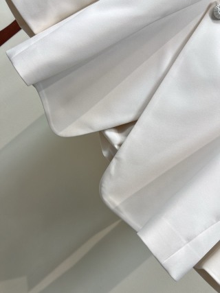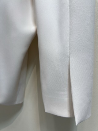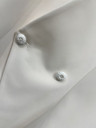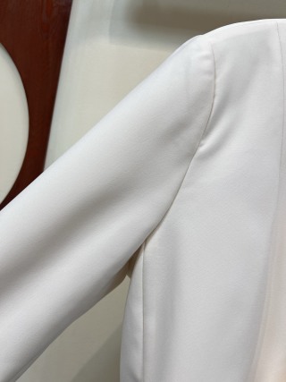 Distinctive details include two front buttons and a pleated back with an additional button for added texture and layering. The crisp white color pairs easily with shirts, dresses, or skirts, allowing you to create both professional and sophisticated outfits. The blazer is available in sizes S to XL, offering flexibility for a flattering fit.