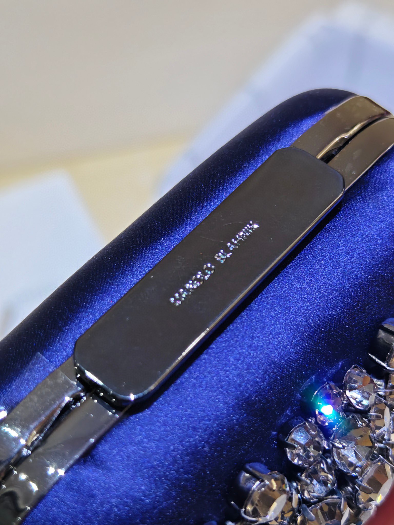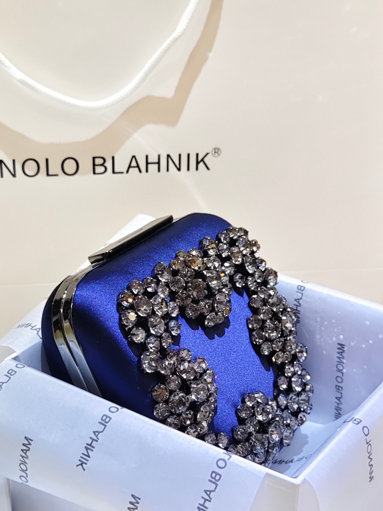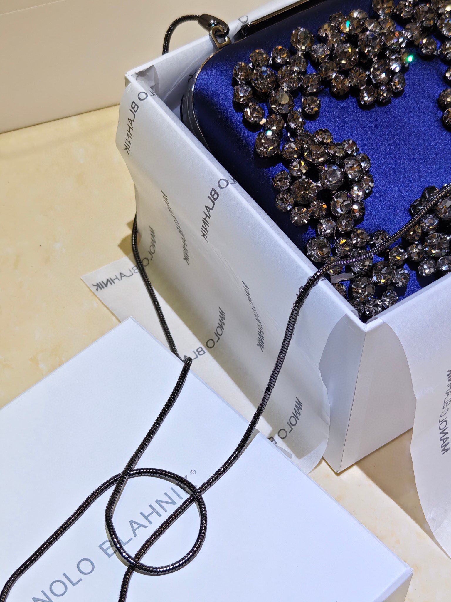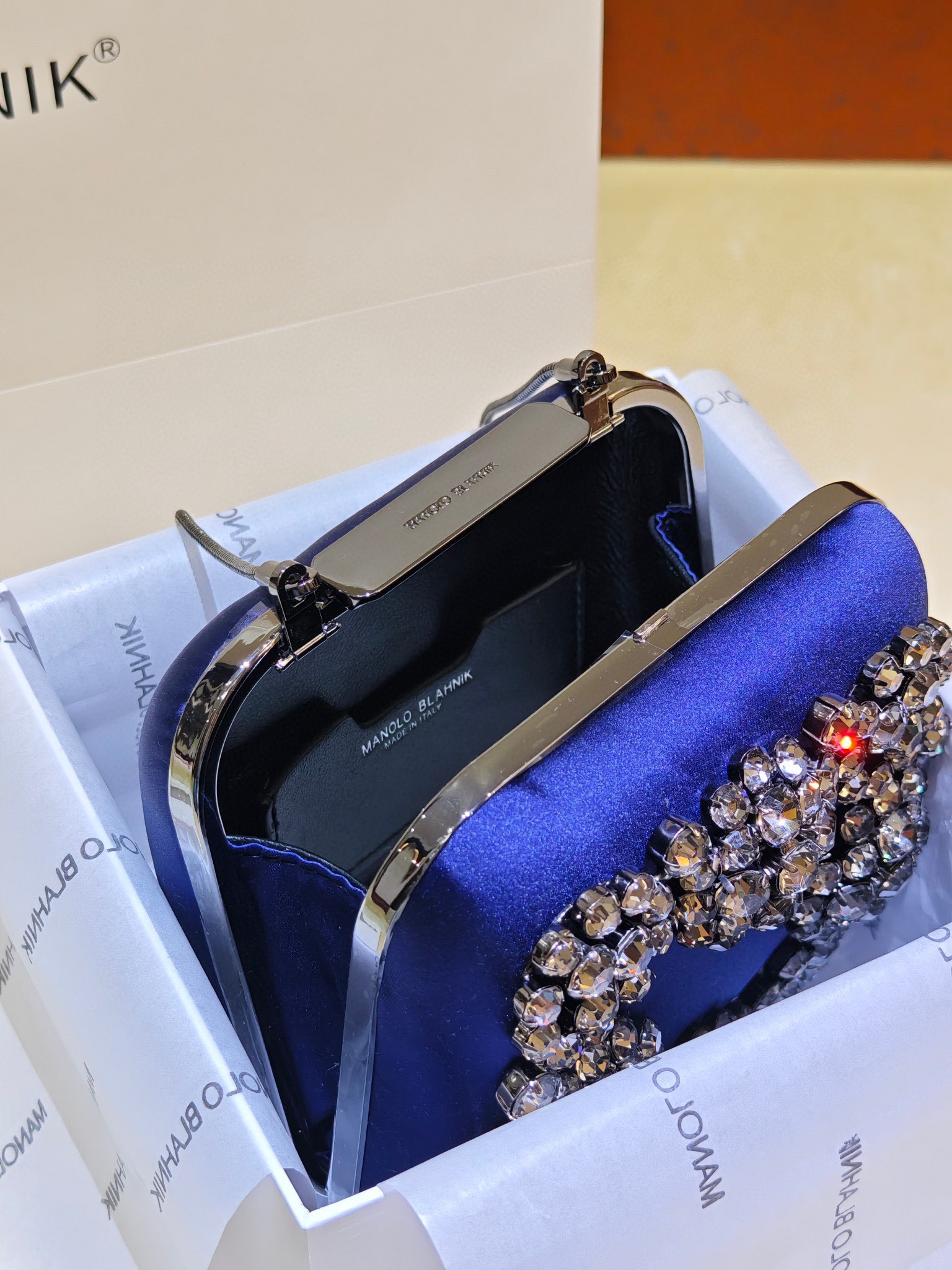 The bag opens to a black interior lining. It comes with the original Manolo Blahnik packaging, including branded box, dust cover, and bag, as shown in the photos. This is a stunning choice for special events or formal occasions if you want a standout accessory.