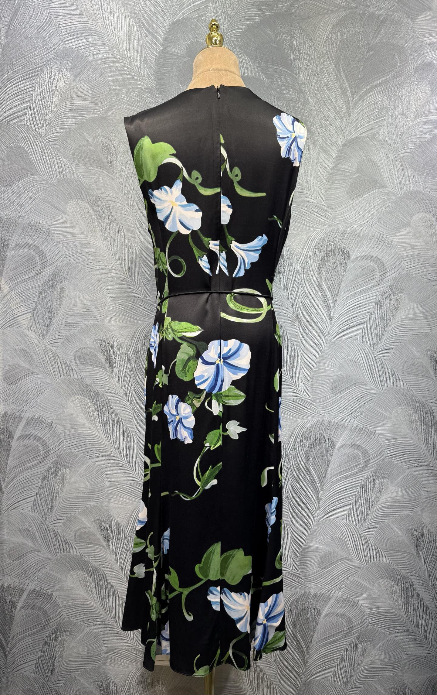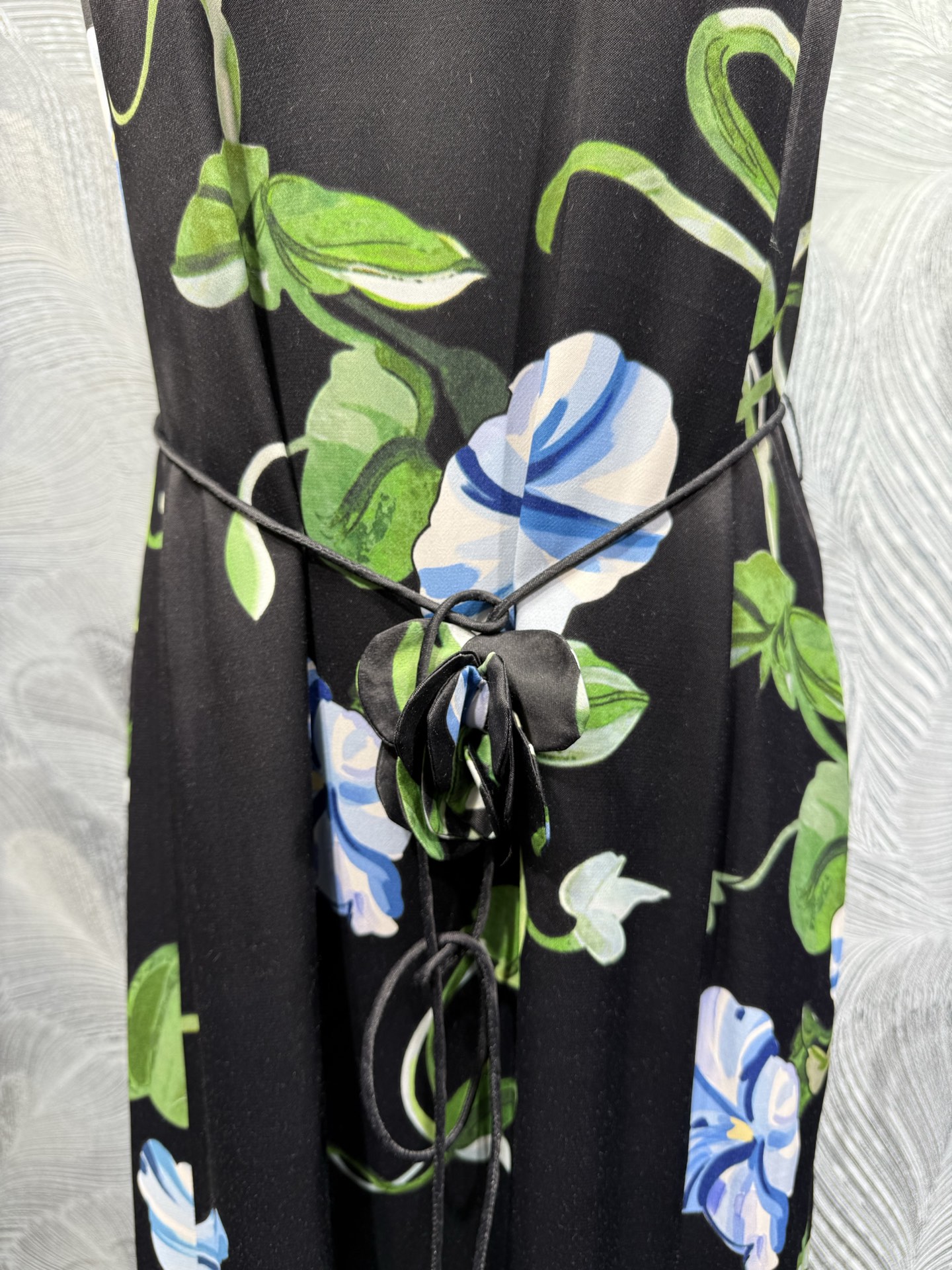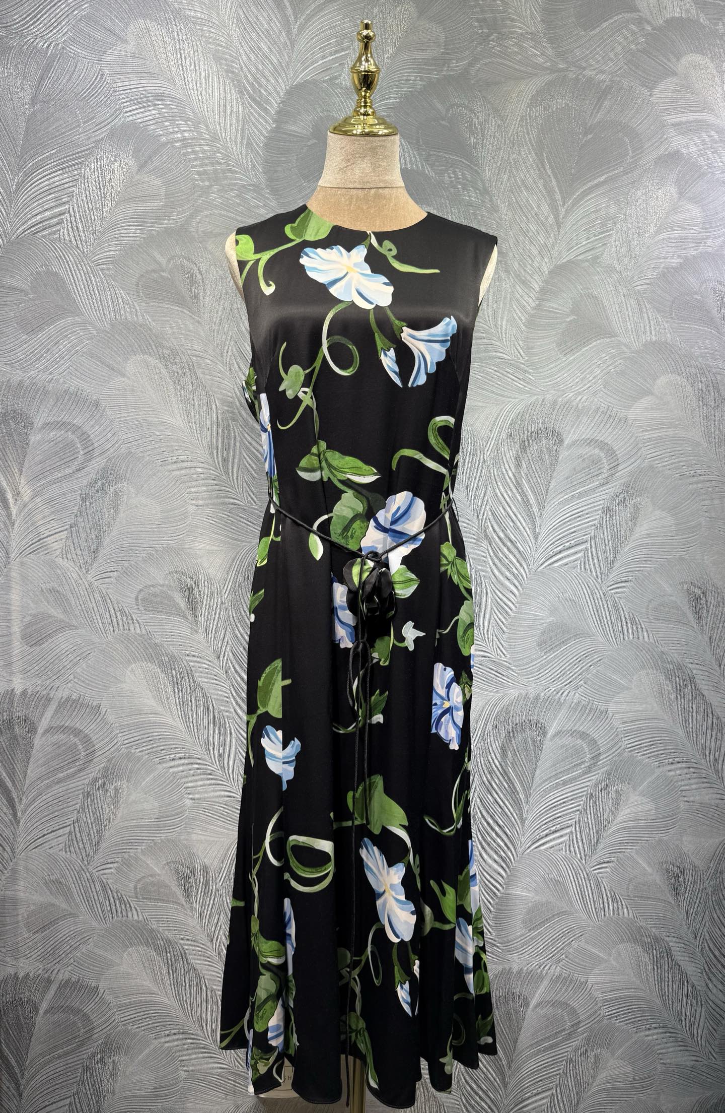 This is a 2026 summer new Oscar de la Renta sleeveless dress featuring a round neckline. The dress is printed with an elegant floral pattern in shades of blue, white, and green against a sleek black background. It has a relaxed, flowy silhouette with a matching fabric tie belt at the waist for adjustable fit.