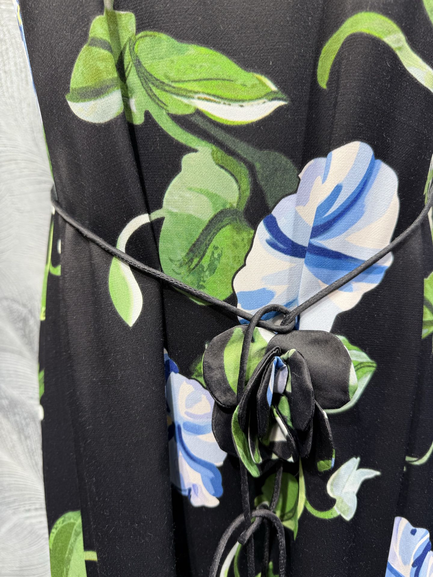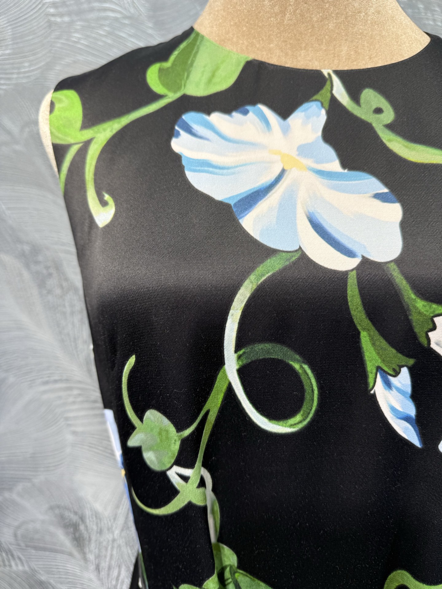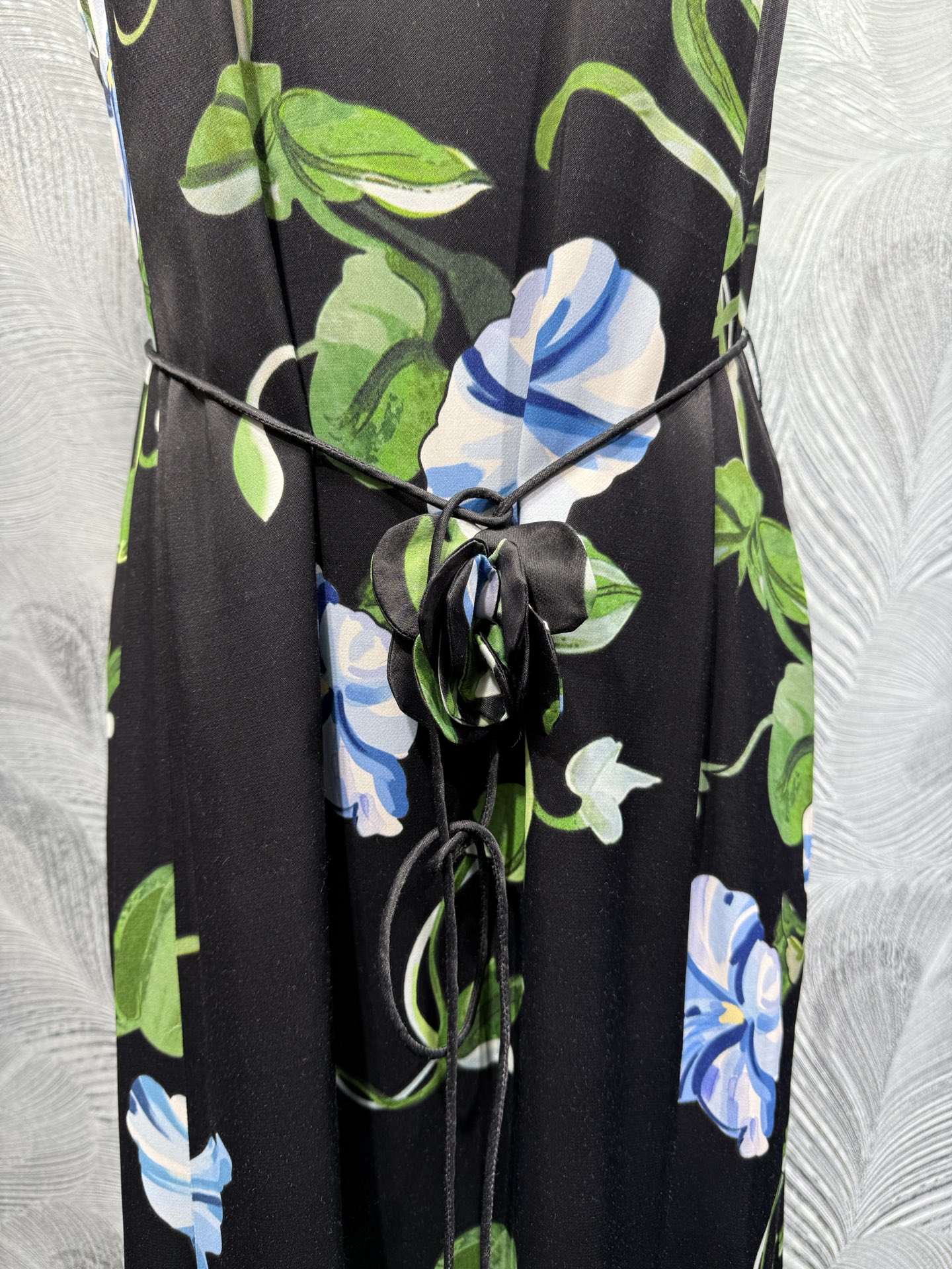 This is a 2026 summer new Oscar de la Renta sleeveless dress featuring a round neckline. The dress is printed with an elegant floral pattern in shades of blue, white, and green against a sleek black background. It has a relaxed, flowy silhouette with a matching fabric tie belt at the waist for adjustable fit.