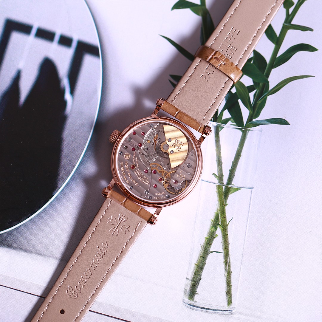 THE MOVEMENT: CALIBRE 240 Visible through the sapphire crystal caseback is the legendary Calibre 240. This ultra-thin self-winding movement utilizes a 22k Gold Mini-Rotor recessed into the plate to maintain its slim profile. Bearing the Patek Philippe Seal, the movement features hand-finished Côtes de Genève, perlage, and chamfered edges that represent the absolute pinnacle of Swiss watchmaking.