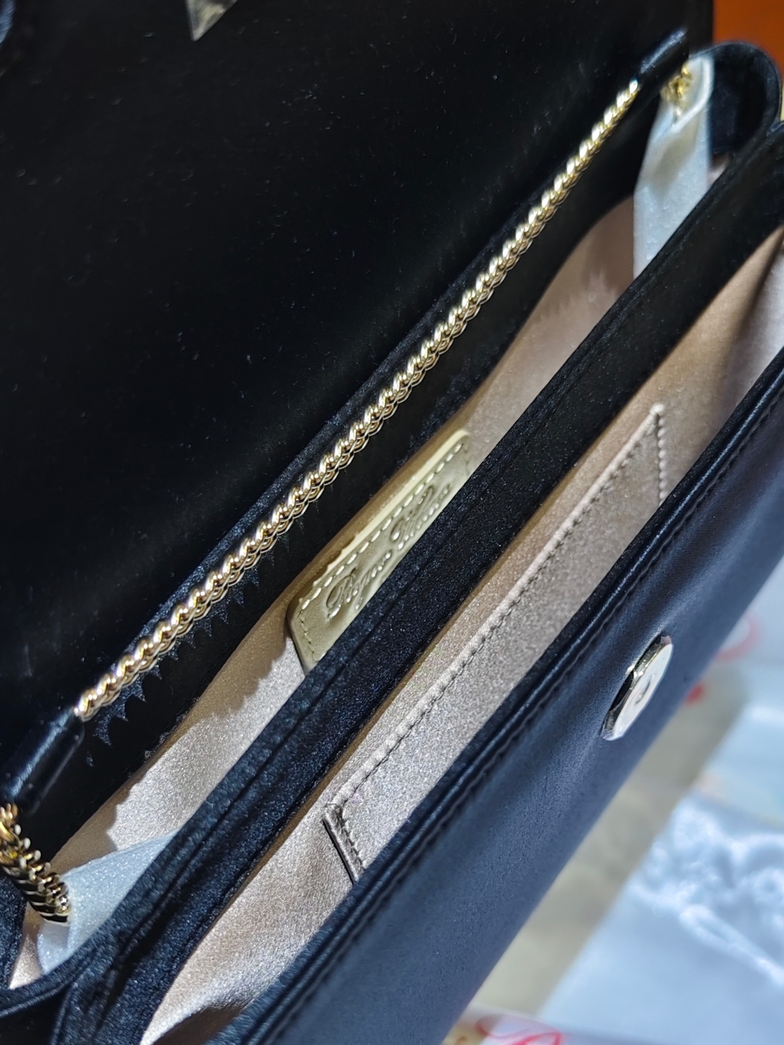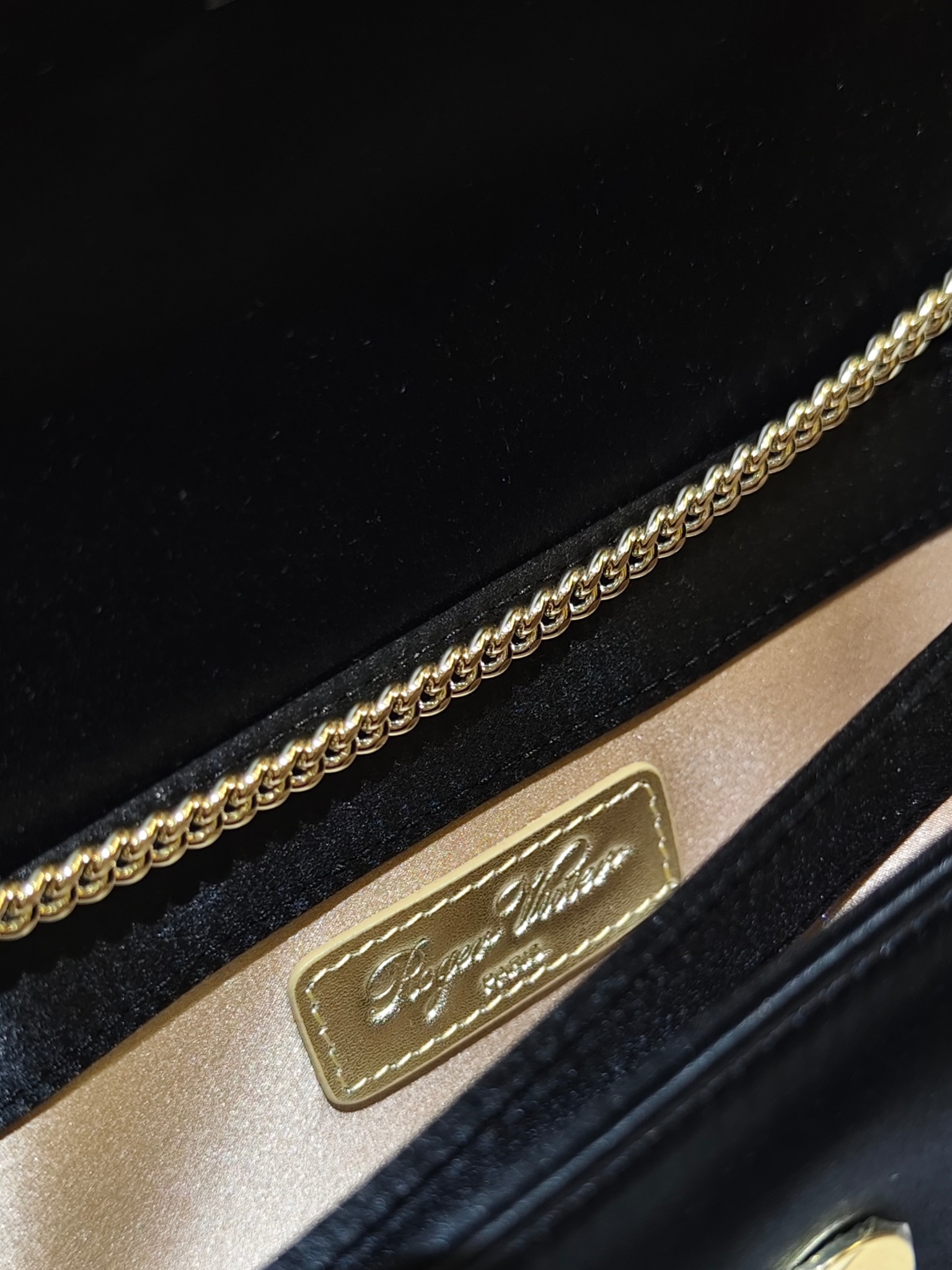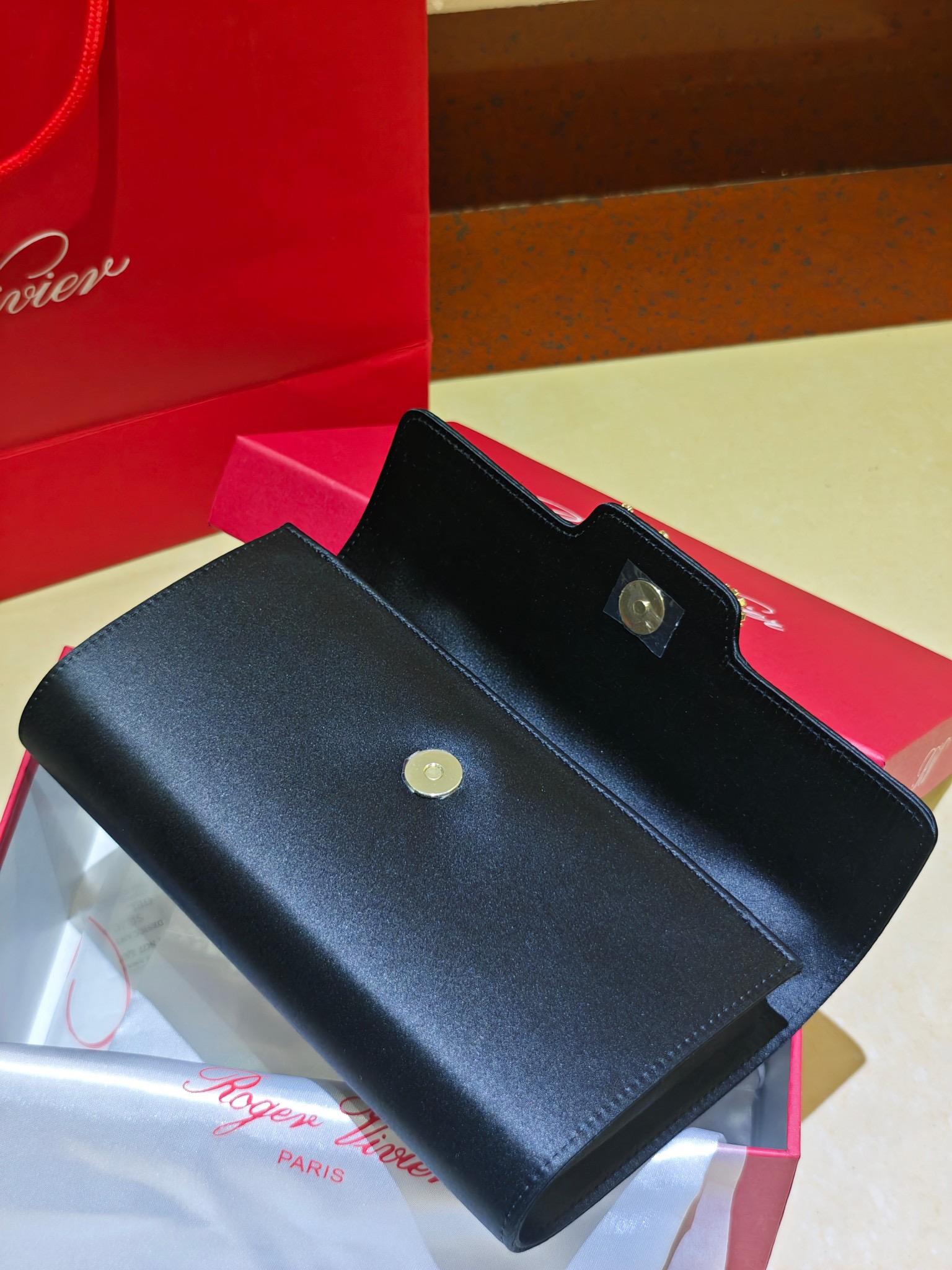 The bag opens with a magnetic snap closure and reveals an interior lined with a soft, light-colored fabric. Inside, you will find a branded leather tag and enough space for essentials. The pochette comes with its original box, dust bag, and Roger Vivier shopping bag, as shown in the photos.
