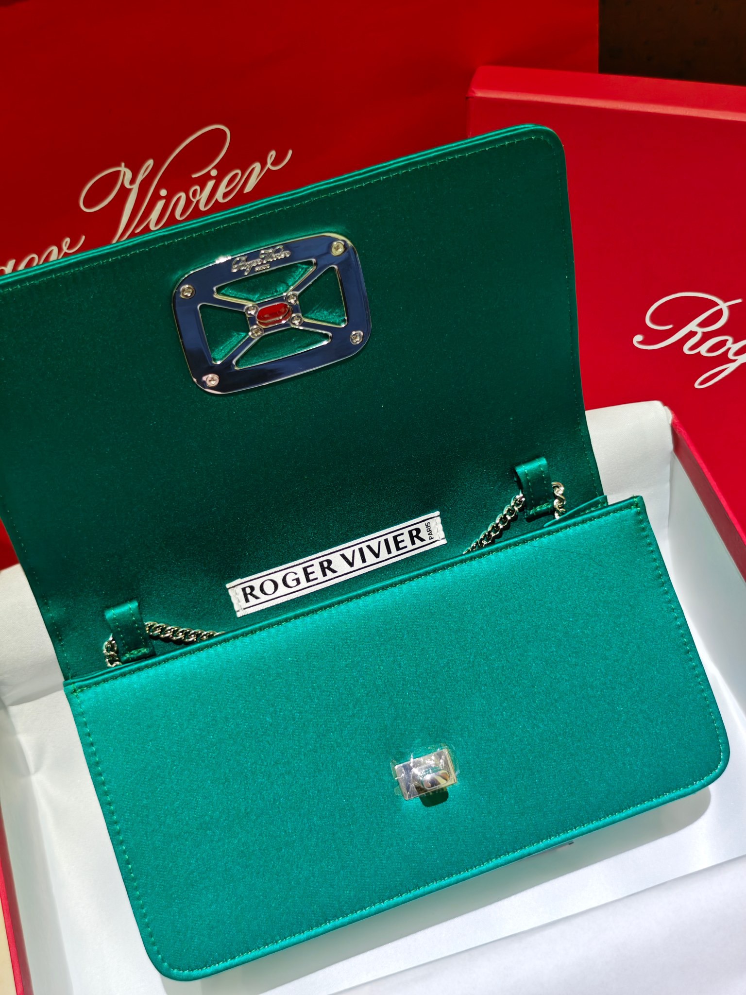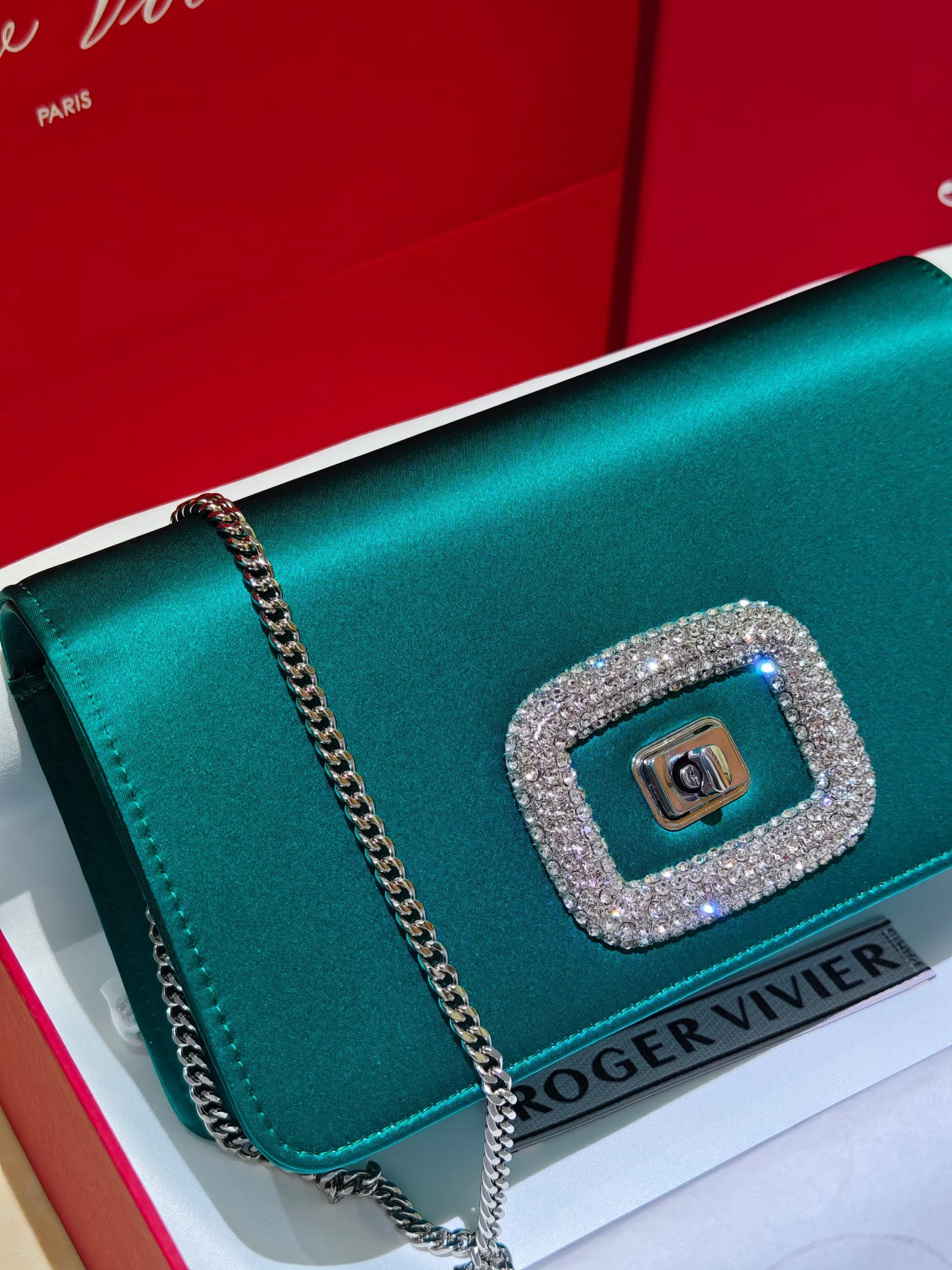 This is a Roger Vivier Viv' Choc mini clutch in a striking emerald green satin finish. The front flap features a bold, rectangular buckle encrusted with crystals, which adds an elegant and distinctive touch. Inside, you will find a single compartment with a small pocket and a silver-tone metal chain strap, making it easy to wear on the shoulder or as a crossbody.