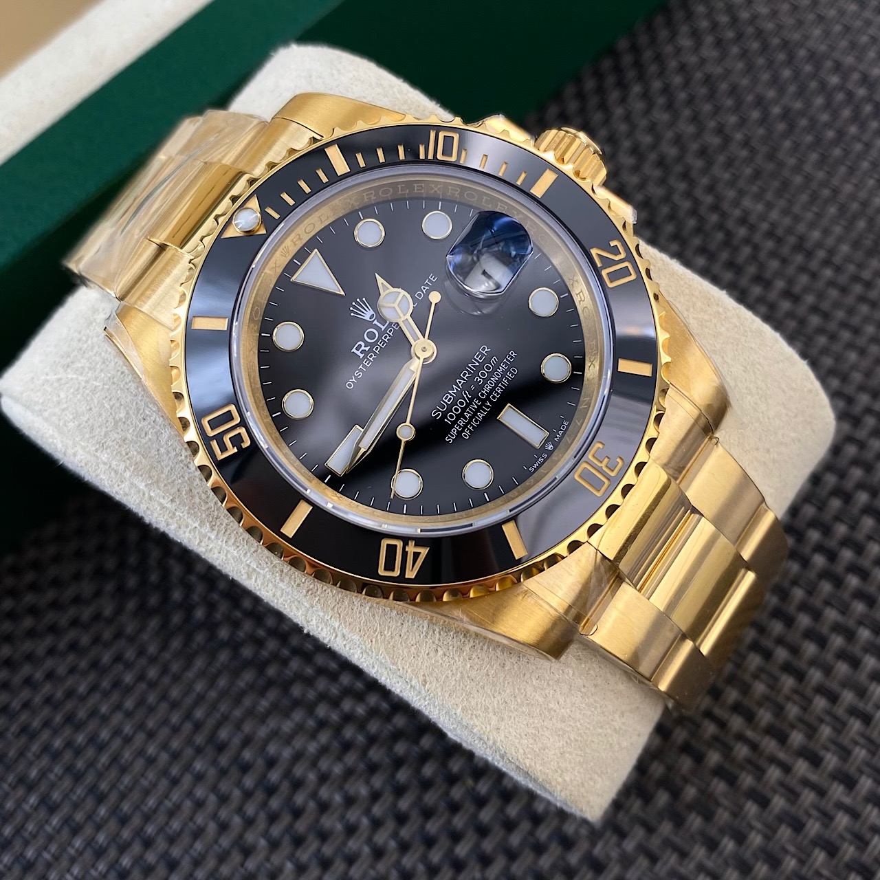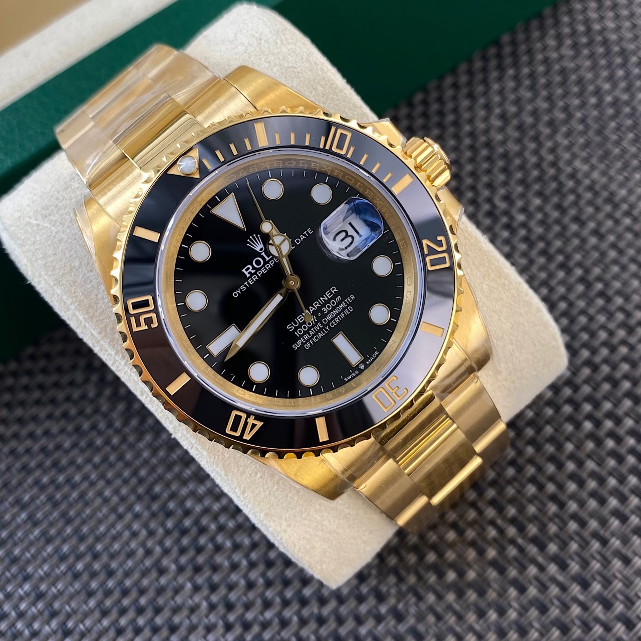 This listing is for a Rolex Submariner Date in 18k yellow gold, reference M228238, offered as a complete full set. The watch comes with its original green Rolex box, outer box, official warranty card, manual, and booklets as shown in the photos and vedio in our YouTube channel