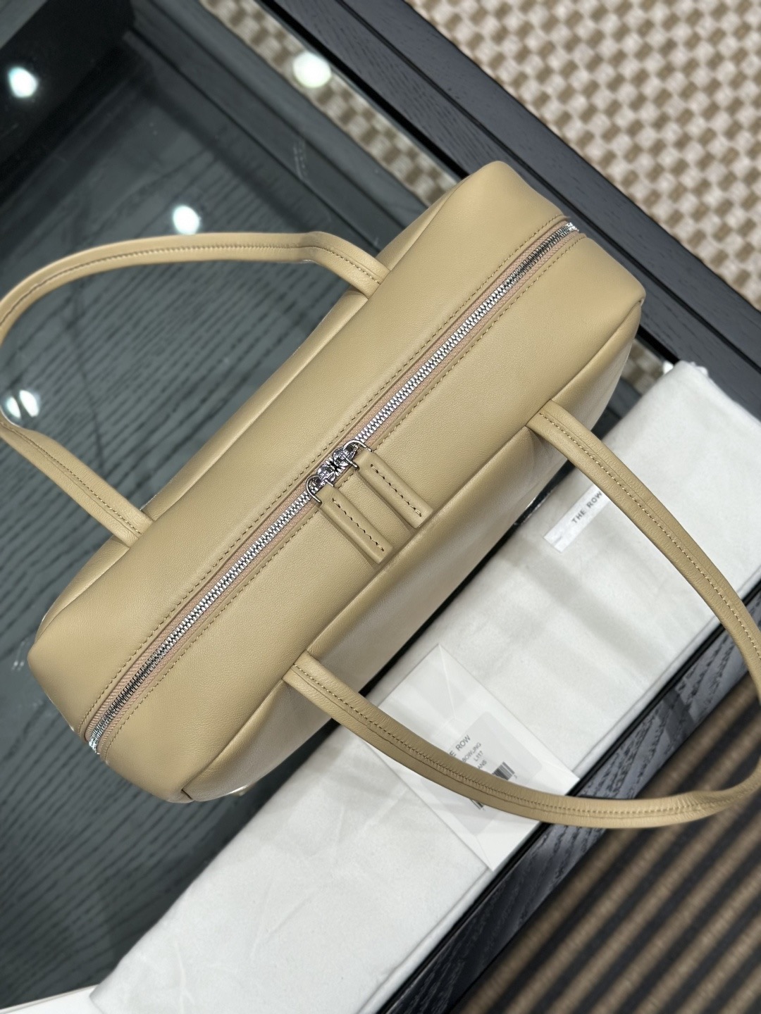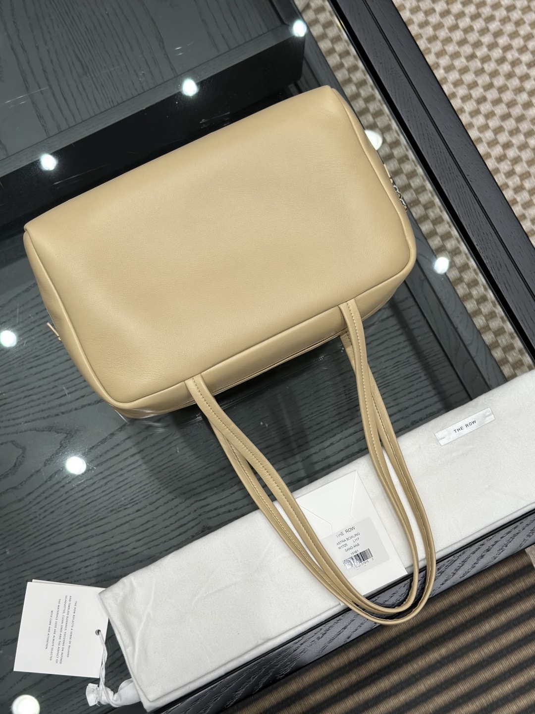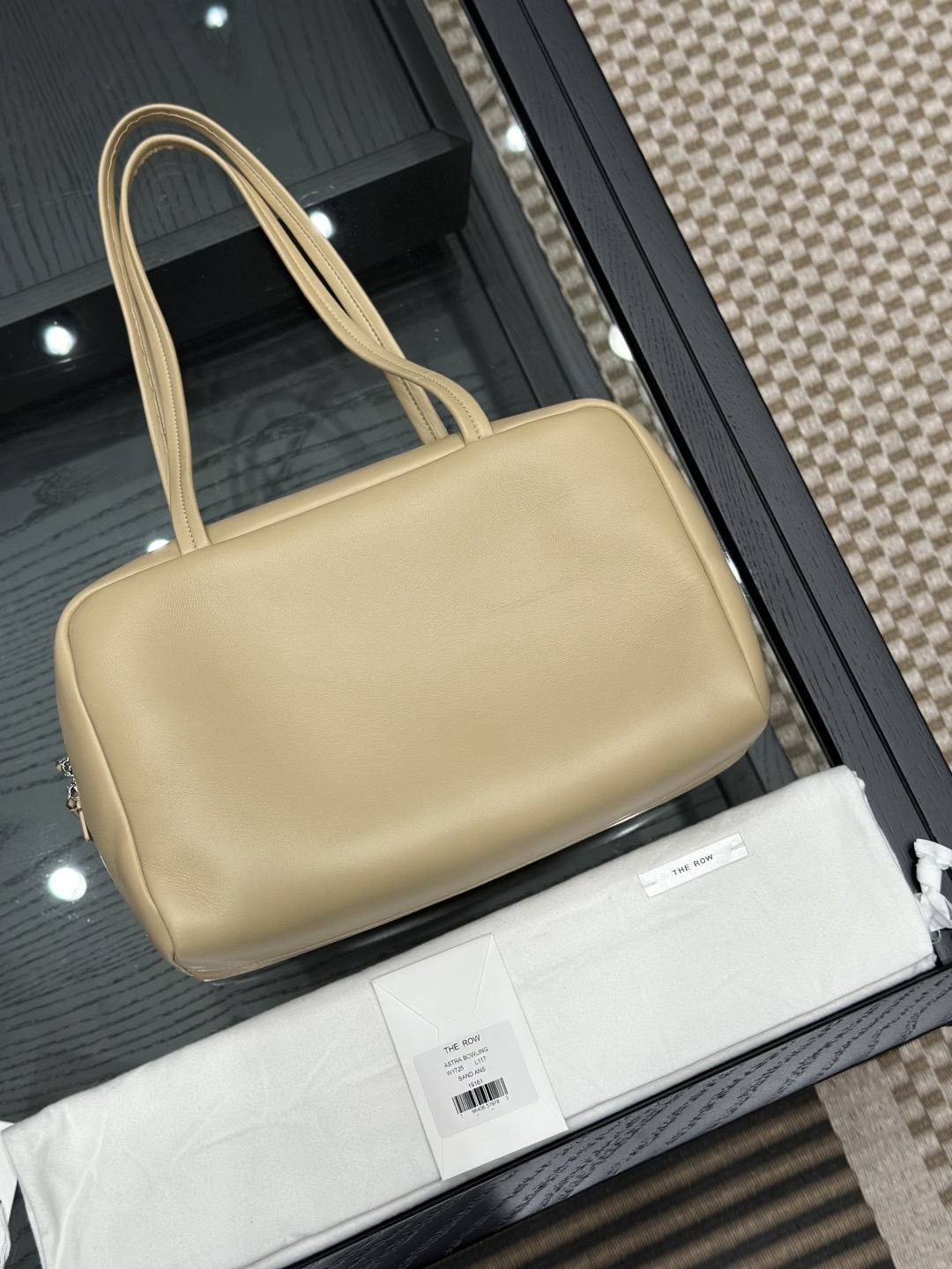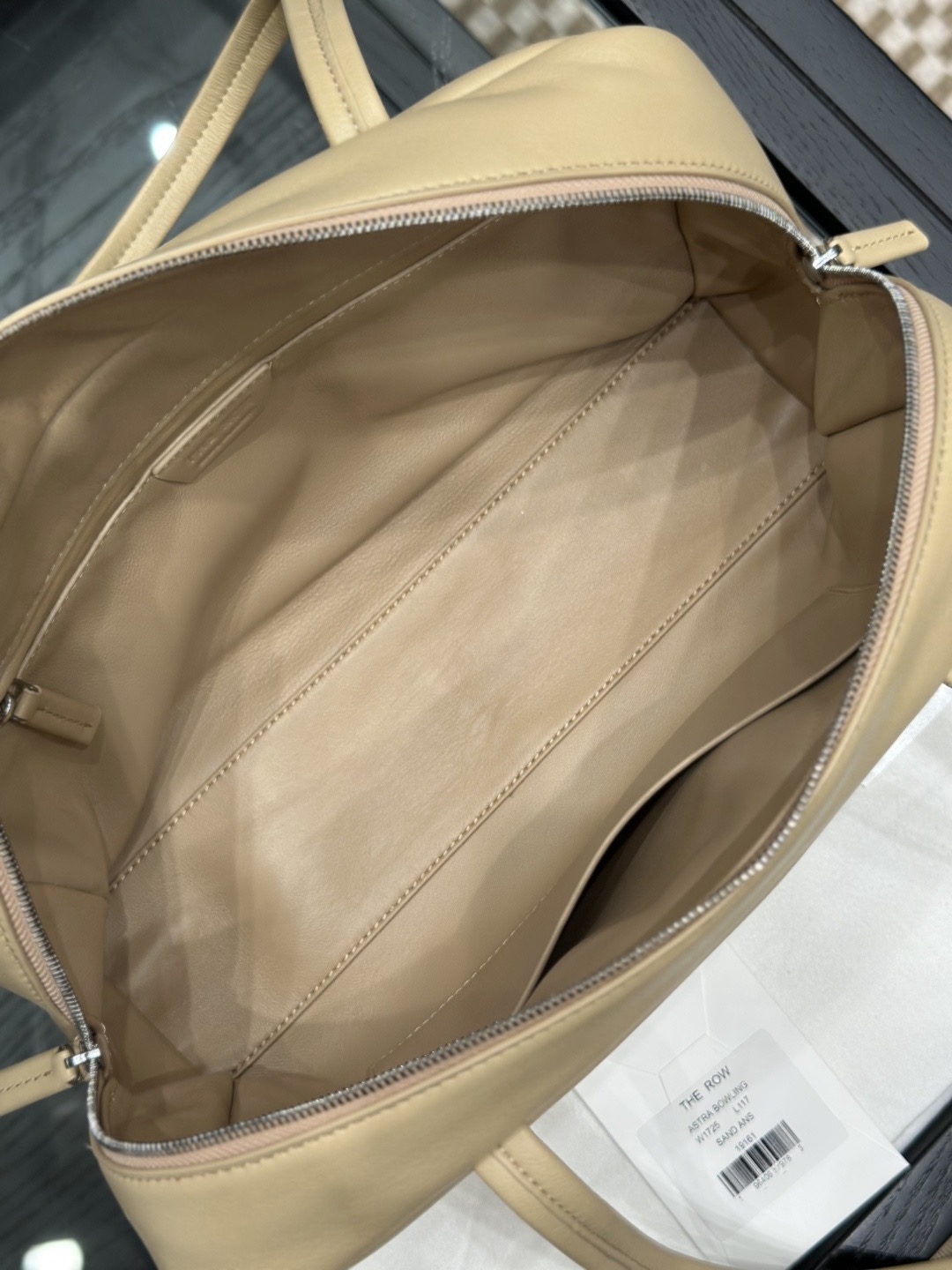 This is a Row Astra bowling bag in sand color. The design is inspired by classic retro bowling bags, featuring a simple and elevated silhouette. Crafted from soft, fine napa lambskin on the exterior and lined with full lambskin inside, the feel of the leather is smooth and refined.