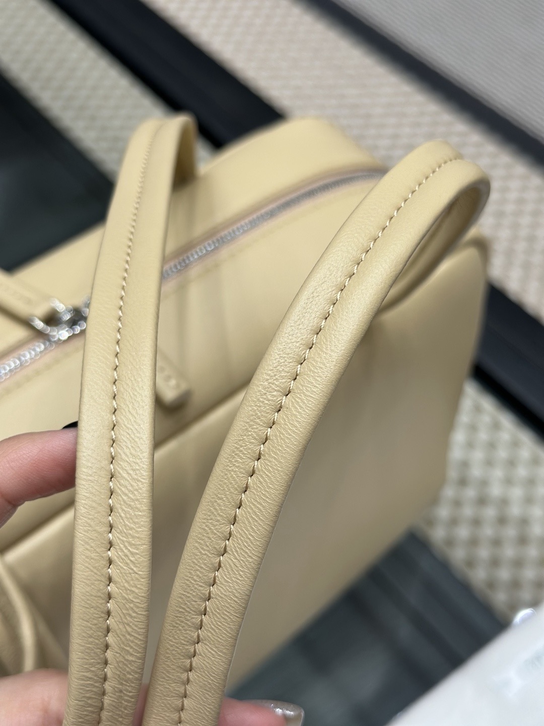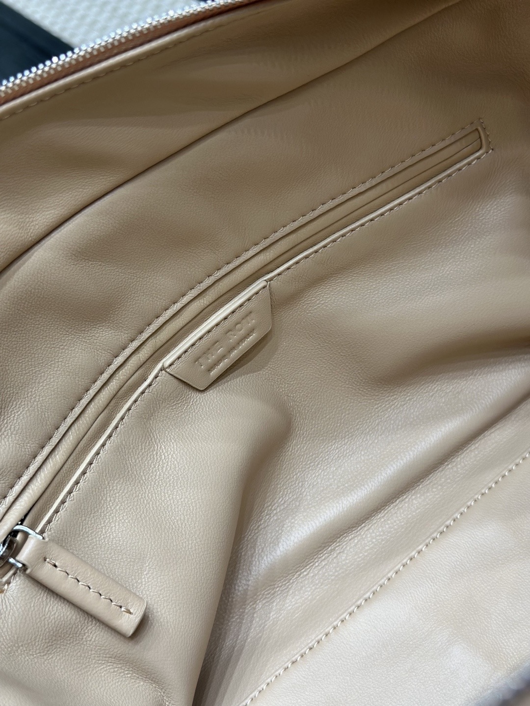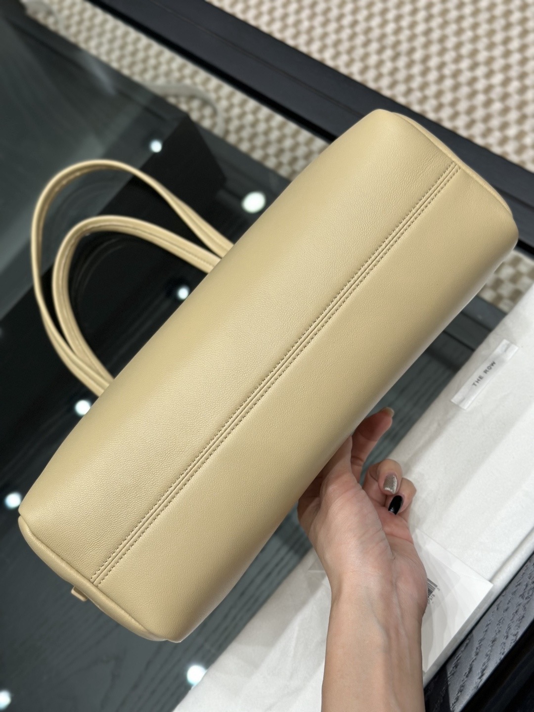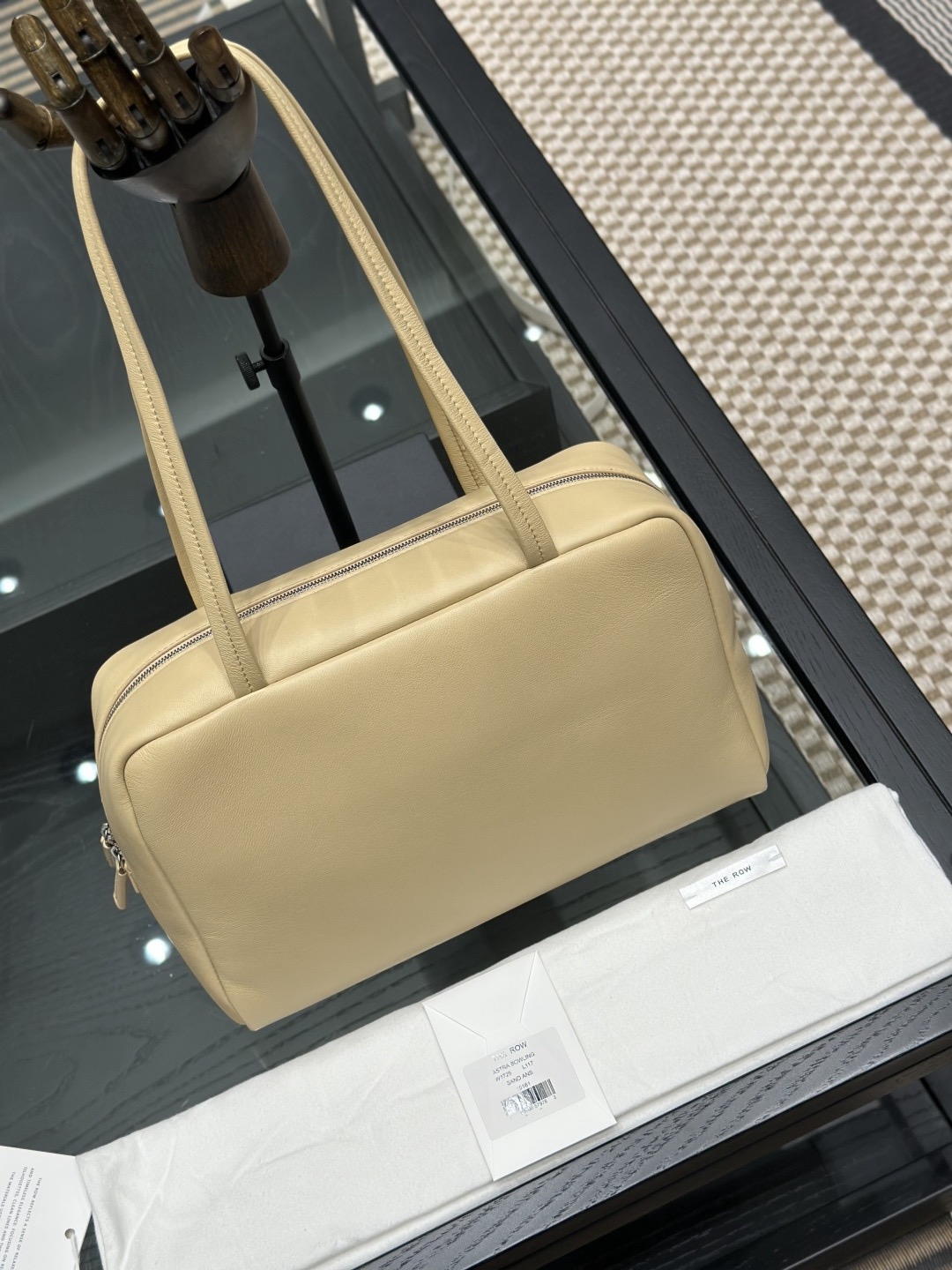 This is a Row Astra bowling bag in sand color. The design is inspired by classic retro bowling bags, featuring a simple and elevated silhouette. Crafted from soft, fine napa lambskin on the exterior and lined with full lambskin inside, the feel of the leather is smooth and refined.