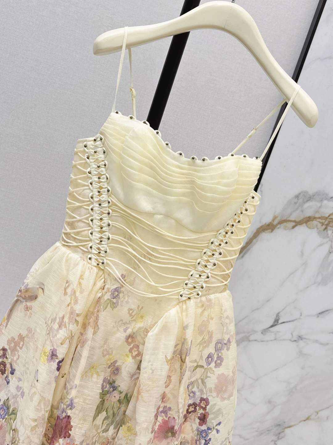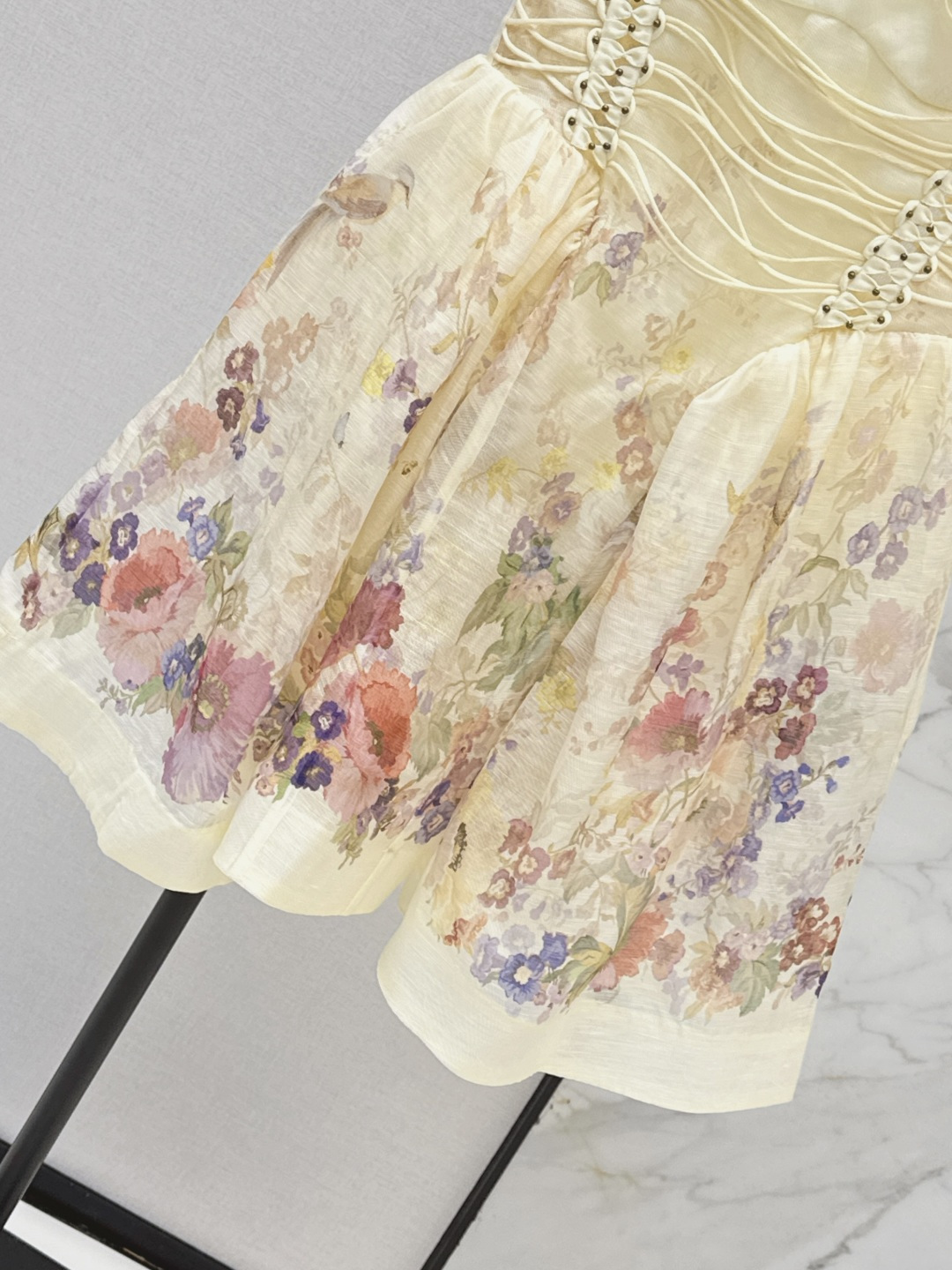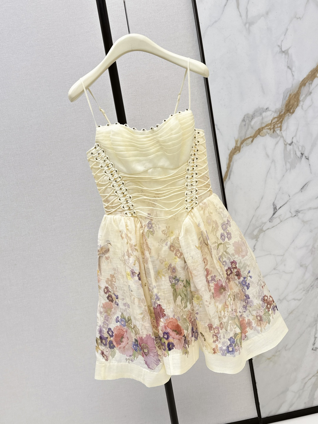 This is the Zimmen-M 26Ss early spring mini dress, featuring a beautiful vacation-inspired design. The dress has a light, elegant look with soft cream tones as the base, detailed with delicate floral prints in pastel shades. The fitted bodice has ruched detailing and decorative lacing with small metallic studs on each side, offering both style and texture. The skirt has a gentle A-line cut, creating a breezy and feminine shape.