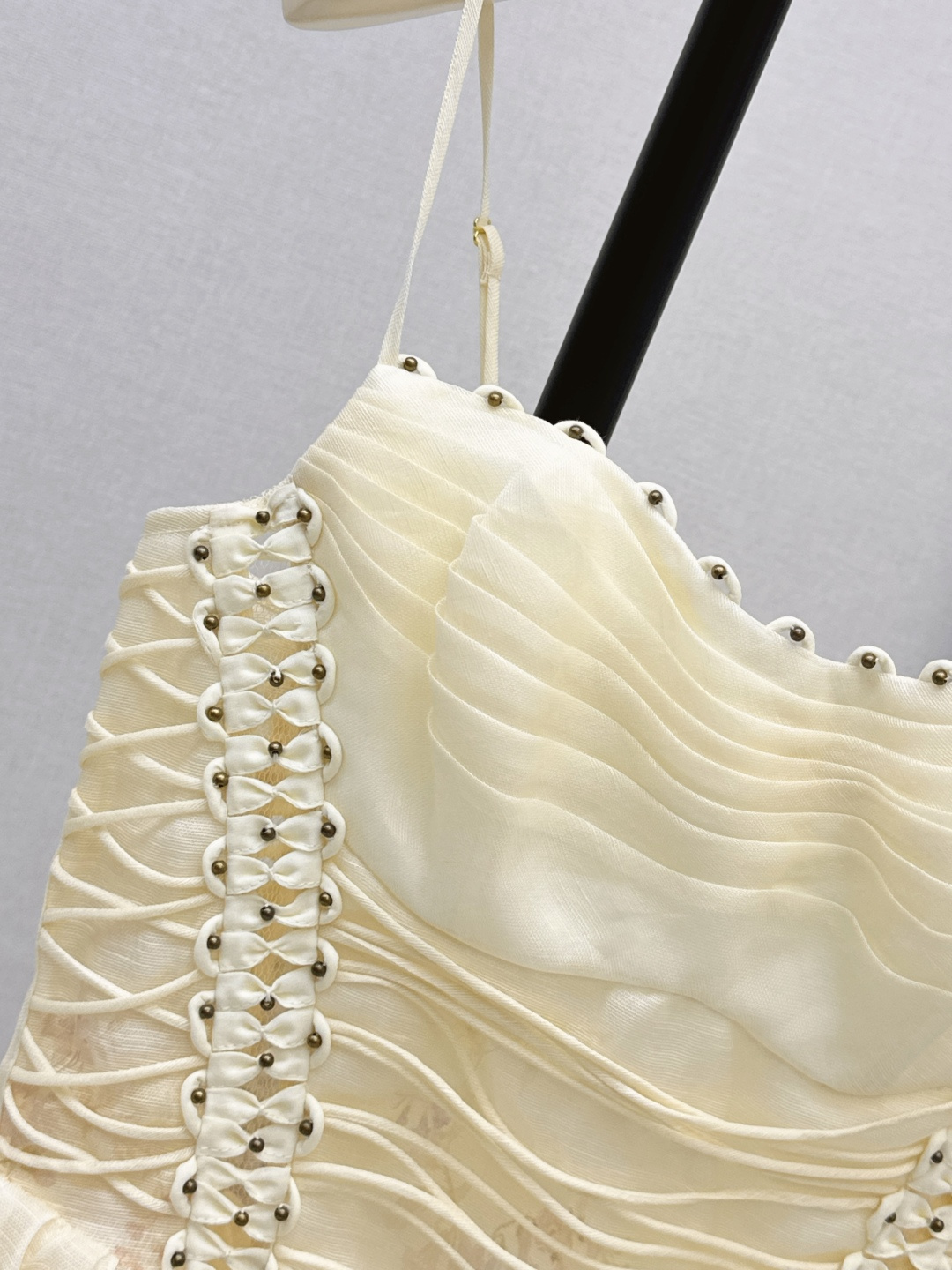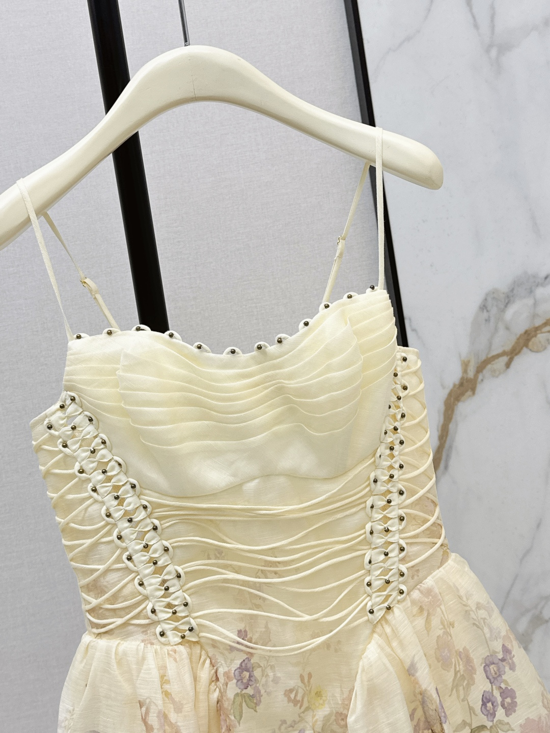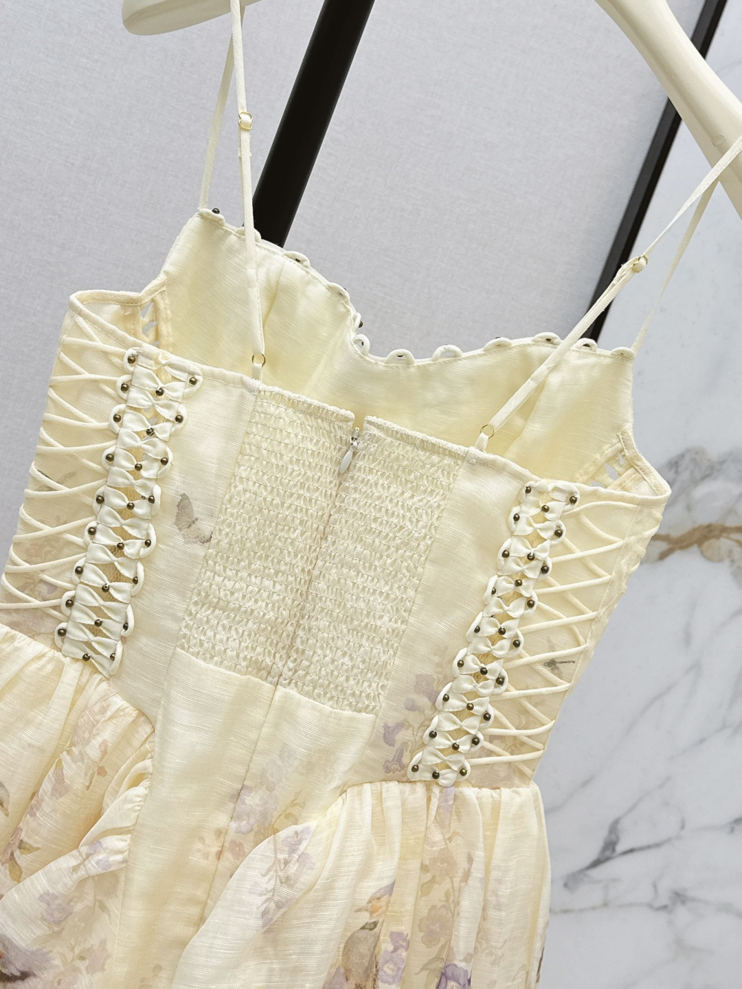 This is the Zimmen-M 26Ss early spring mini dress, featuring a beautiful vacation-inspired design. The dress has a light, elegant look with soft cream tones as the base, detailed with delicate floral prints in pastel shades. The fitted bodice has ruched detailing and decorative lacing with small metallic studs on each side, offering both style and texture. The skirt has a gentle A-line cut, creating a breezy and feminine shape.